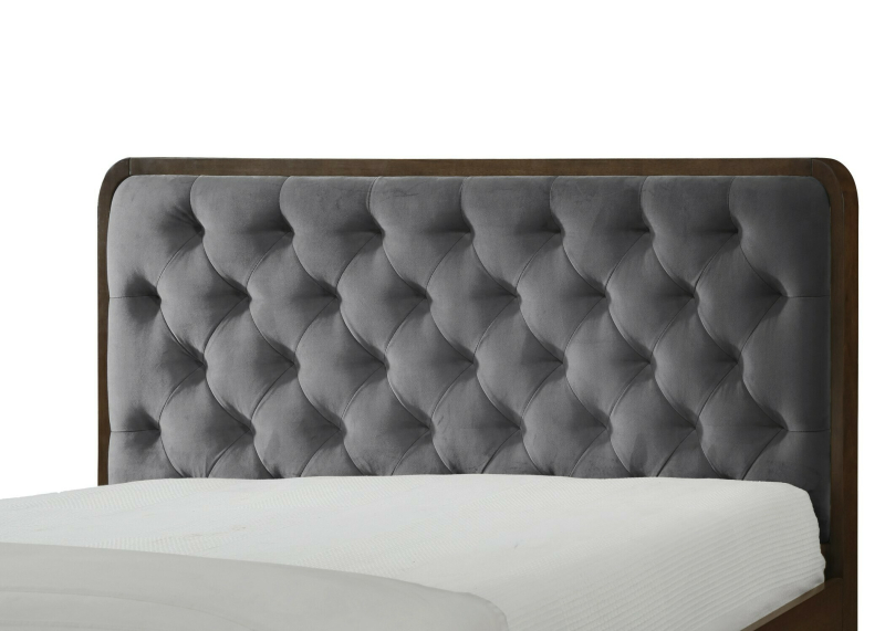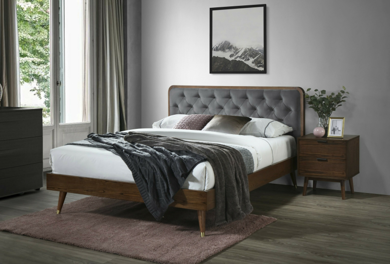 Łóżko CASIDY – Kwintesencja Stylu i Komfortu z Nutką VintagePrzenieś swoją sypialnię do świata elegancji i wyrafinowania z łóżkiem CASIDY. Ten wyjątkowy mebel łączy w sobie klasyczny design z nowoczesnym akcentem, tworząc idealne miejsce do wypoczynku. Jego starannie dobrane materiały i unikatowe wezgłowie sprawią, że sypialnia nabierze niepowtarzalnego charakteru. Design i Materiały: Łóżko CASIDY wyróżnia się stylowym wezgłowiem obitym wysokiej jakości tkaniną w modnym, popielatym kolorze. Pikowanie wezgłowia w formie eleganckich rombów nadaje mu klasycznego uroku i głębi, jednocześnie zapewniając wygodne oparcie. Rama łóżka, wykonana z trwałego drewna litego kauczukowego w ciepłym odcieniu orzecha, doskonale kontrastuje z jasną tapicerką, tworząc spójną i harmonijną całość. Smukłe, stożkowe nóżki, charakterystyczne dla estetyki retro, dodają meblowi lekkości i oryginalności. Wymiary i Specyfikacja: