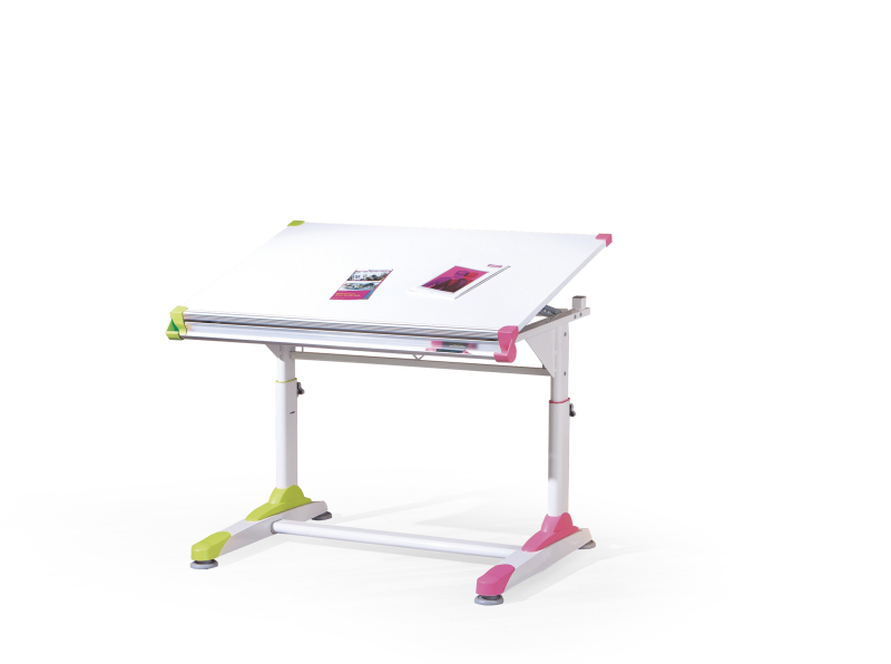 biurko z regulowaną wysokością blatu oraz regulowanym kątem blatu, wymiary: 100/66/69÷84 cm, materiał: MDF lakierowany / stal malowana, kolor: biało-zielono-różowy (w zestawie 2 komplety plastikowych nakładek)