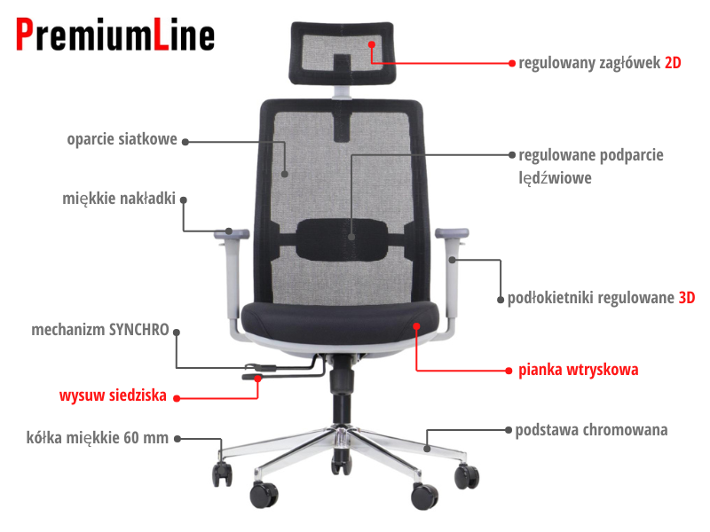 Fotel Biurowy VERIS NET 101SFL - regulacja podparcia lędźwiowego Terminy 4-6 tygodni - towar na zamówienie Opis W pełni ergonomiczny fotel biurowy z szeregiem rozwiązań pozwalających dostosować go do indywidualnych potrzeb użytkownika. Szczególnie możliwość dodatkowego pochylenia przedniej części siedziska pozwoli zminimalizować dolegliwości spowodowane długotrwałą pracą przy biurku, a także poprawi efektywność wykonywanej pracy. Baza Baza pięcioramienna. Wersje kolorystyczne: Czarny (tworzywo - poliamid) MetallicPro Chrom (aluminium polerowane) Amortyzator Podnośnik gazowy zapewnia płynną regulację wysokości siedziska. Mechanizm Synchro SFL - regulacja wysokości siedziska, regulacja synchronicznego odchylania oparcia / siedziska z możliwością dostosowania sprężystości odchylenia oparcia do ciężaru siedzącego, z dodatkowymi funkcjami: wysuwu siedziska, pochylenia siedziska/oparcia (tzw. kąt ujemny). Kółka Kółka twarde z hamulcem Kółka miękkie z hamulcem Stopki teflonowe Siedzisko Maskownica z tworzywa w kolorze czarnym, pianka poliuretanowa wylewana - gęstość 80 kg/m3. Oparcie Oparcie siatkowe z regulowanych podparciem lędźwiowym. Podłokietniki P54PU - podłokietnik regulowany góra-dół (zakres regulacji 80 mm), nakładka poliuretanowa. Kolor stelaża podłokietnika: czarny. P48PU - podłokietnik regulowany góra-dół (zakres regulacji 100 mm), nakładka obrotowa (+/- 30°), nakładka przód-tył (+/- 30 mm), regulacja odległości od siedziska (zakres regulacji 35 mm na stronę, nakładka poliuretanowa. Kolor stelaża podłokietnika: czarny Tapicerka Do wyboru w konfiguratorze produktu. Pikowanie Przy wyborze pikowania termin realizacji wydłuża się do około 8 tygodni. Model VERIS NET 101SFL Wymiary GWARANCJA 5 lat przy pracy jednozmianowej 3 lata przy pracy dłuższej niż 8 godzinn dziennie System od "drzwi do drzwi" dla Państwa pełnego komfortu. System "door to door" - z ang - od drzwi do drzwi Termin "door to door" wg WIKIPEDII: "sposób realizacji naprawy urządzenia, który polega na przesłaniu pocztą kurierską uszkodzonego sprzętu do serwisu (na koszt serwisu). Naprawione urządzenie wraca następnie przesyłką kurierską do właściciela także na koszt serwisu" Fotel posiada: Protokół oceny ergonomicznej Sprawozdanie z badań