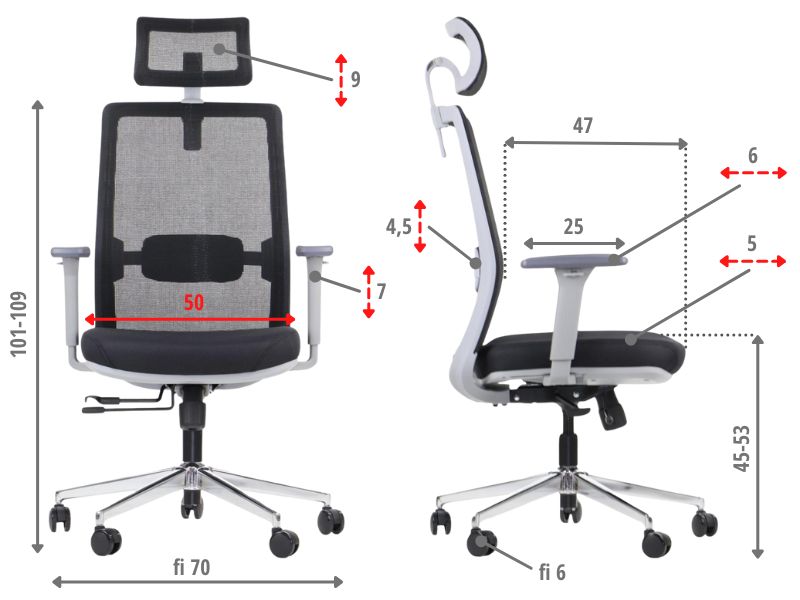 Wymiary | Wysokość całkowita bez zagłówka | 101-109cm | |