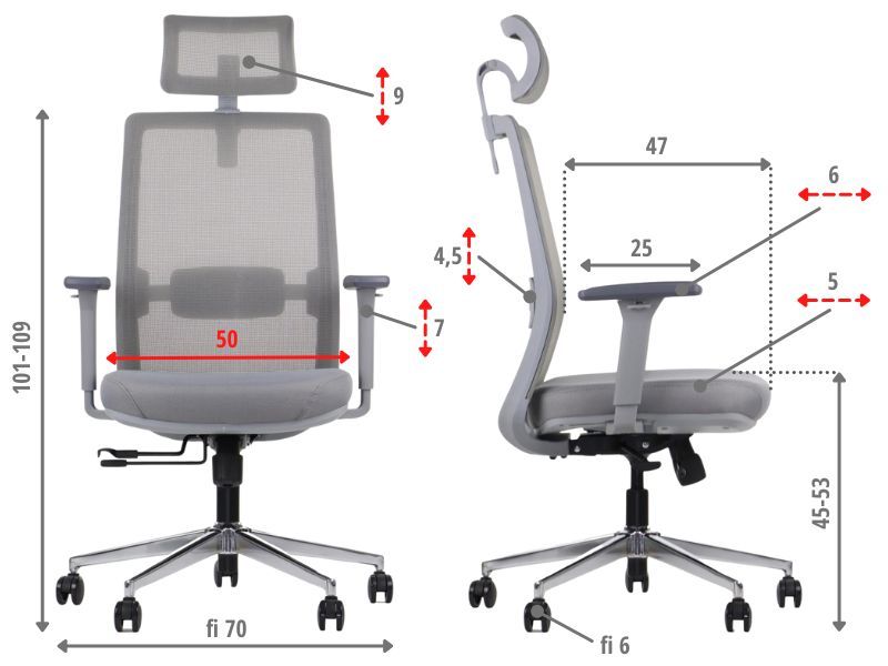 Wymiary | Wysokość całkowita bez zagłówka | 101-109cm | |