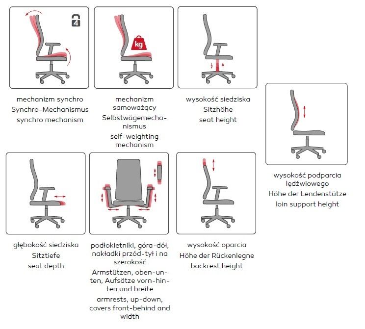 Mechanizm | B+X - synchro-samoważący • regulacja głębokości siedziska (zakres 58mm) • automatyczna regulacja synchronicznego odchylenia oparcia i siedziska (dostosowuje się do wagi użytkownika, nie wymaga regulacji siły odchylenia oparcia) • zakres kąta odchylenia oparcia 20° i siedziska 5° • blokada oparcia w 4 pozycjach • regulacja wysokości siedziska FS - fast-synchro • ręczna regulacja synchronicznego odchylenia oparcia i siedziska • zakres kąta odchylenia oparcia 20° i siedziska 8° • blokada oparcia w 4 pozycjach • regulacja wysokości siedziska • ręczna regulacja synchronicznego odchylenia oparcia i siedziska • zakres kąta odchylenia oparcia 20° i siedziska 8° • blokada oparcia w 4 pozycjach • regulacja wysokości siedziska