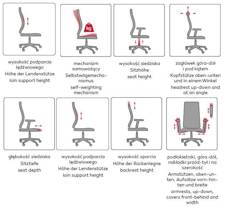 | Mechanizm fotela: | synchroniczny podstawowy, synchroniczny z wysuwem siedziska, samoważący synchroniczny |