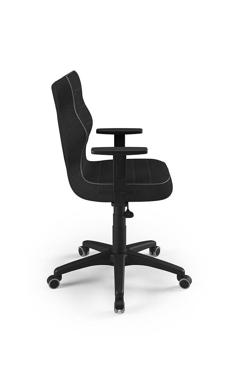 Dane techniczne | Egonomiczne siedzisko wykonane z tworzywa sztucznego. Podłokietniki regulowane, twarde w kolorze czarnym. Mechanizm: Blacha siedziska z dźwignią prosta. Podnośnik gazowy: Stal + tworzywo sztuczne. Teleskopowa osłonka na podnośnik gazowy w kolorze czarnym. Baza: Podstawa pięcioramienna czarna (tworzywo sztuczne). Kółka miękkie średnica 50 mm, średnica trzpienia fi 11 w kolorze czarnym (tworzywo sztuczne) - umożliwiające ruch krzesła zarówno po powierzchniach twardych jak i wykładzinach. |