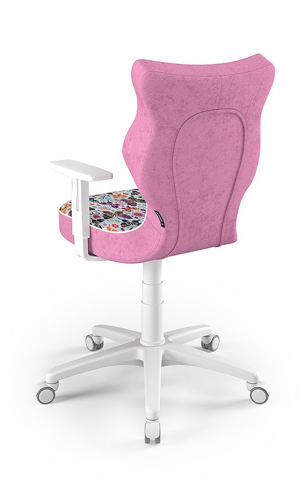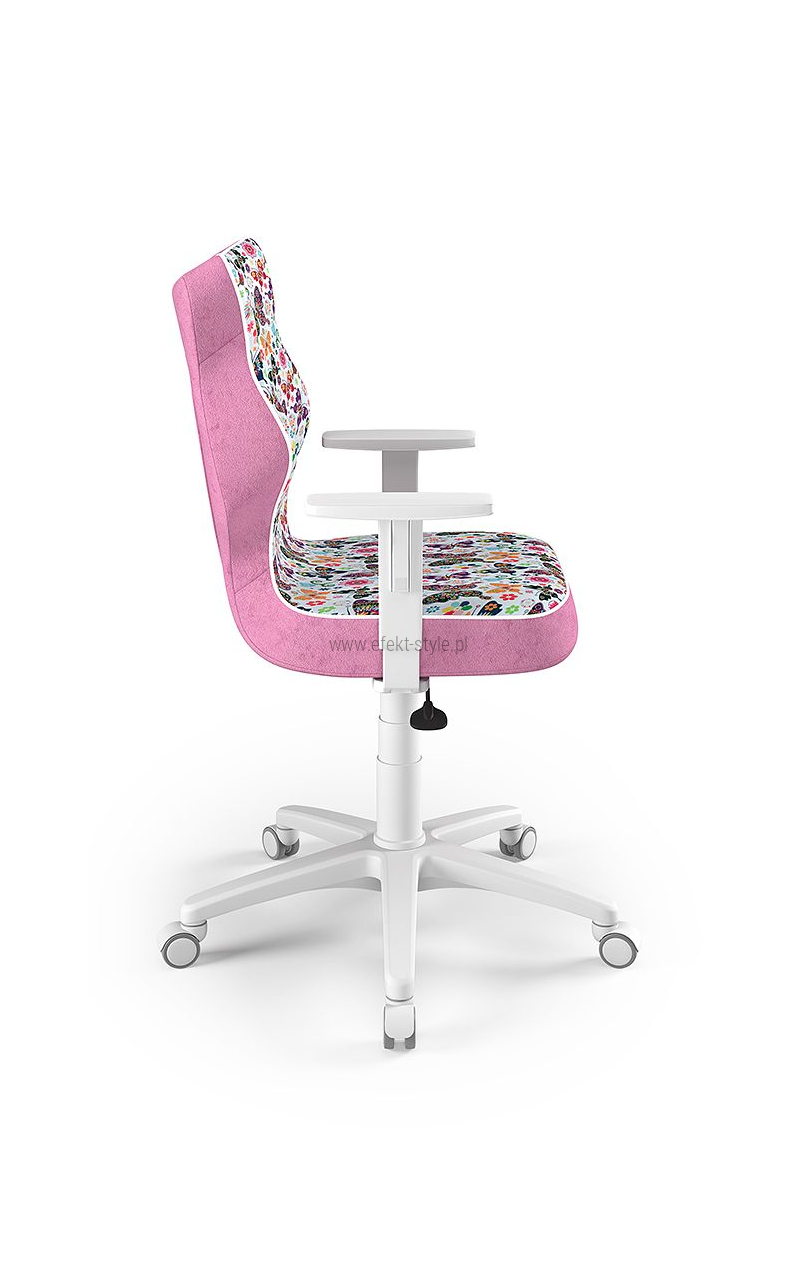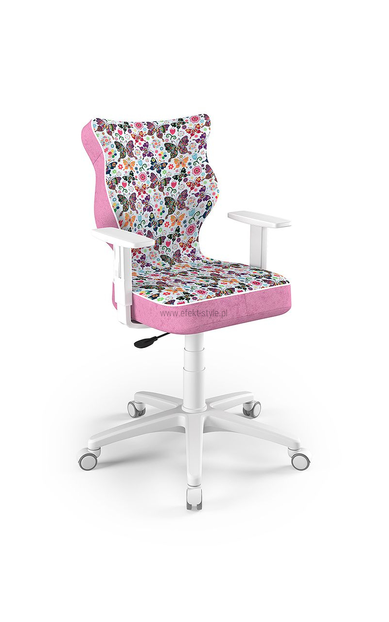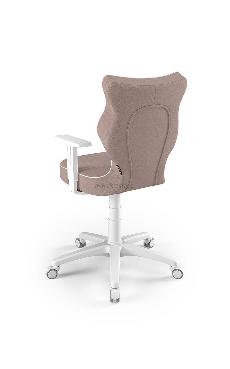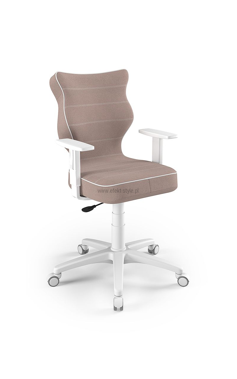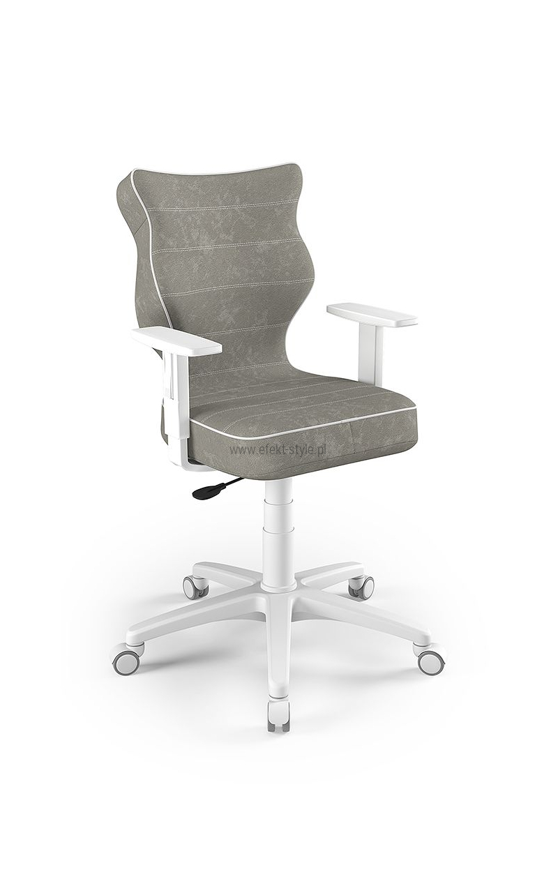 ENTELO Dobre Krzesło obrotowe DUO nr 6 - podstawa biała Terminy Towar na zamówienie. Czas produkcji 2-4 tygodnie. To linia Dobrych Krzeseł posiadająca parametry ergonomiczne, które odpowiadają za zachowanie prawidłowej postawy siedzącej. Wykończenie krzesła oraz szeroki wybór koloru tapicerki sprawia, że model pasuje do każdego wnętrza. Duo posiada regulowane podłokietniki umożliwiające wsunięcie krzesła pod blat biurka. Podstawę krzesła wykonano z tworzywa sztucznego oraz włókna szklanego. W zestawie znajdują się kółka miękkie umożliwiające ruch krzesła zarówno po powierzchniach twardych jak i wykładzinach. Produkt zaprojektowany i wyprodukowany w Polsce. Dane techniczne Egonomiczne siedzisko wykonane z tworzywa sztucznego. Podłokietniki regulowane, twarde w kolorze białym. Mechanizm: Blacha siedziska z dźwignią prosta. Podnośnik gazowy: Stal + tworzywo sztuczne. Teleskopowa osłonka na podnośnik gazowy w kolorze białym. Baza: Podstawa pięcioramienna biała (tworzywo sztuczne). Kółka miękkie średnica 50 mm, średnica trzpienia fi 11 w kolorze białym (tworzywo sztuczne) - umożliwiające ruch krzesła zarówno po powierzchniach twardych jak i wykładzinach. Za dopłatą stopki o średnicy trzpienia FI 11 wykonane z tworzywa sztucznego. Wymiary Rozmiar nr 6: Głębokość siedziska: 40 cm Szerokość siedziska: 42,5 cm Wysokość oparcia: 42,5 cm Dodatkowe informacje Model DUO posiada certyfikat zgodności z normą PN-EN 1335-1:2004, PN-EN 1335-2:2009.