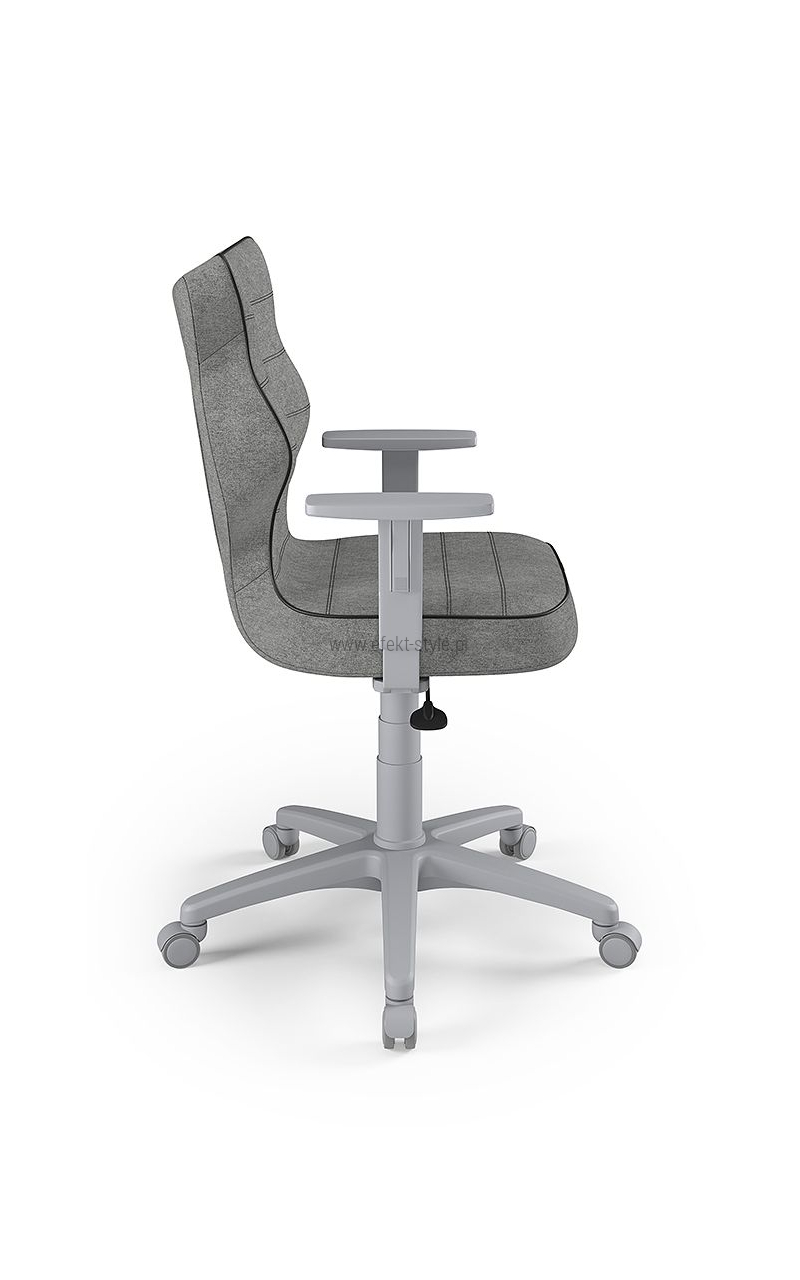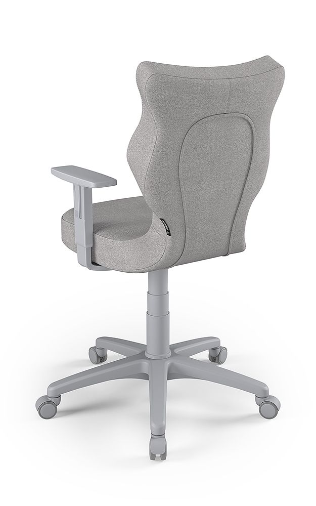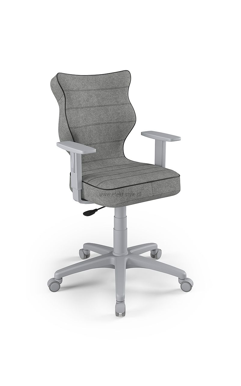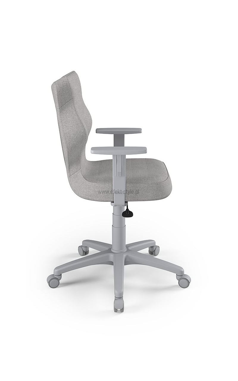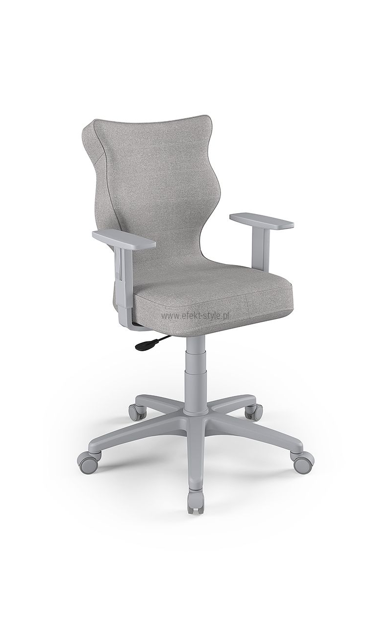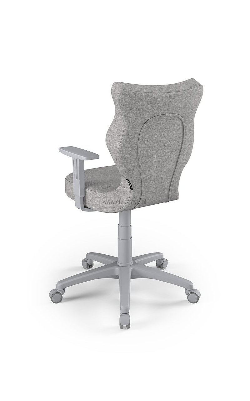 ENTELO Dobre Krzesło obrotowe DUO nr 6 - podstawa biała Terminy Towar na zamówienie. Czas produkcji 2-4 tygodnie. To linia Dobrych Krzeseł posiadająca parametry ergonomiczne, które odpowiadają za zachowanie prawidłowej postawy siedzącej. Wykończenie krzesła oraz szeroki wybór koloru tapicerki sprawia, że model pasuje do każdego wnętrza. Duo posiada regulowane podłokietniki umożliwiające wsunięcie krzesła pod blat biurka. Podstawę krzesła wykonano z tworzywa sztucznego oraz włókna szklanego. W zestawie znajdują się kółka miękkie umożliwiające ruch krzesła zarówno po powierzchniach twardych jak i wykładzinach. Produkt zaprojektowany i wyprodukowany w Polsce. Dane techniczne Egonomiczne siedzisko wykonane z tworzywa sztucznego. Podłokietniki regulowane, twarde w kolorze białym. Mechanizm: Blacha siedziska z dźwignią prosta. Podnośnik gazowy: Stal + tworzywo sztuczne. Teleskopowa osłonka na podnośnik gazowy w kolorze białym. Baza: Podstawa pięcioramienna biała (tworzywo sztuczne). Kółka miękkie średnica 50 mm, średnica trzpienia fi 11 w kolorze białym (tworzywo sztuczne) - umożliwiające ruch krzesła zarówno po powierzchniach twardych jak i wykładzinach. Za dopłatą stopki o średnicy trzpienia FI 11 wykonane z tworzywa sztucznego. Wymiary Rozmiar nr 6: Głębokość siedziska: 40 cm Szerokość siedziska: 42,5 cm Wysokość oparcia: 42,5 cm Dodatkowe informacje Model DUO posiada certyfikat zgodności z normą PN-EN 1335-1:2004, PN-EN 1335-2:2009.