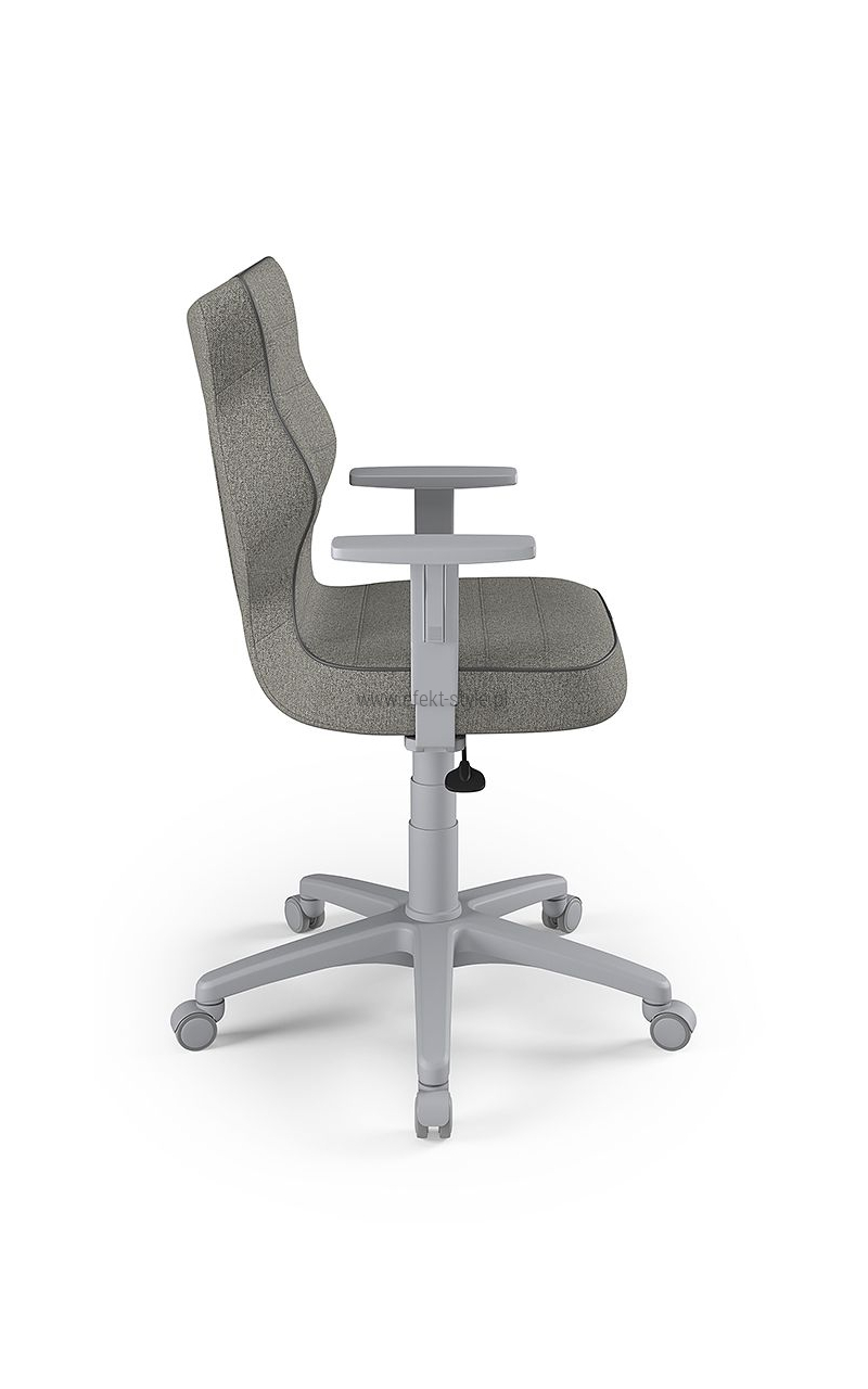 Fotel biurowy ERGOFIX TM06 szary Mechanizm Synchroniczny mechanizm ruchowy (Synchro SELF). Po zwolnieniu blokady, oparcie wychyla się w ruchu synchronicznym z siedziskiem naśladując ruch użytkownika w krześle. Wychylenie oparcia podążające za ruchem pleców użytkownika jest znacznie wyraźniejsze i szybsze aniżeli ruch siedziska. Siła oporu jaki stawia oparcie podczas wychylenia jest automatycznie dobrana do wagi Użytkownika - to funkcja "SELF" mechanizmu Synchro. Użytkownik w każdej chwili ma również możliwość blokady wybranej pozycji wychylenia oparcia i siedziska poprzez ruch dźwigni umieszczonej pod siedziskiem. Funkcja ANTI-Shock zapobiega gwałtownemu uderzeniu oparcia w plecy Użytkownika po zwolnieniu wybranej pozycji wychylenia. Siedzisko Tapicerowane tkaniną TM, która jest miła w dotyku, oddychająca, odporna na peeling i ścieralność ponad 35 tyś cykli Martindalea. Tkanina zapewnia dobra cyrkulację powietrza, jest łatwa w utrzymaniu czystości. Kolor tapicerki - szary. Oparcie Tapicerowane jest siatką, która dobrze dopasowuje się do pleców Użytkownika i zapewnia odpowiednią cyrkulację powietrze. Kolor siatki - szary. Wyposażone: w profil lędźwiowy o regulowanej wysokości, zagłówek o regulowanym kącie położenia, który pozwala na ergonomiczne podparcie głowy podczas pracy. Podłokietniki Regulowane w trzech płaszczyznach (3D): góra dół: pozwala na dostosowanie jego wysokości tak aby przedramię ułożone było pod kątem 90 stopni do tułowia, co znacznie odciąża mięśnie pleców podczas długiej pracy w pozycji siedzącej. Zakres regulacji wysokości podłokietnika to 6 cm; kąt położenia nakładki w zakresie +/- 15 stopni (skierowanie nakładek do wewnątrz siedziska ułatwia pisanie na klawiaturze, zaś ich skierowanie na zewnątrz ułatwia swobodne wstawanie z krzesła); przód - tył: regulacja nakładki podłokietnika przód/tył pozwala dostosować go do długości przedramienia; Podstawa Pięcioramienna czarna - nylonowa podstawa jezdna o lekkiej nowoczesnej stylistyce. Kółka miękkie: do powierzchni twardych tj. panele, glazura Wymiary Atest Atest Wytrzymałości i Bezpieczeństwa Użytkowania wydany przez PUR Remodex Zakład Badań i Wdrożeń Przemysłu Meblarskiego. Sposób przeprowadzenia badań wg: PN-EN 1335-1:2004 PN-EN 1335-2:2009 PN-EN 1335-3:2009 Zgodnie z atestem: ,,UWAGA: dopuszczalne maksymalne obciążenie siedziska - 150 kg". Gwarancja 24 miesiące.