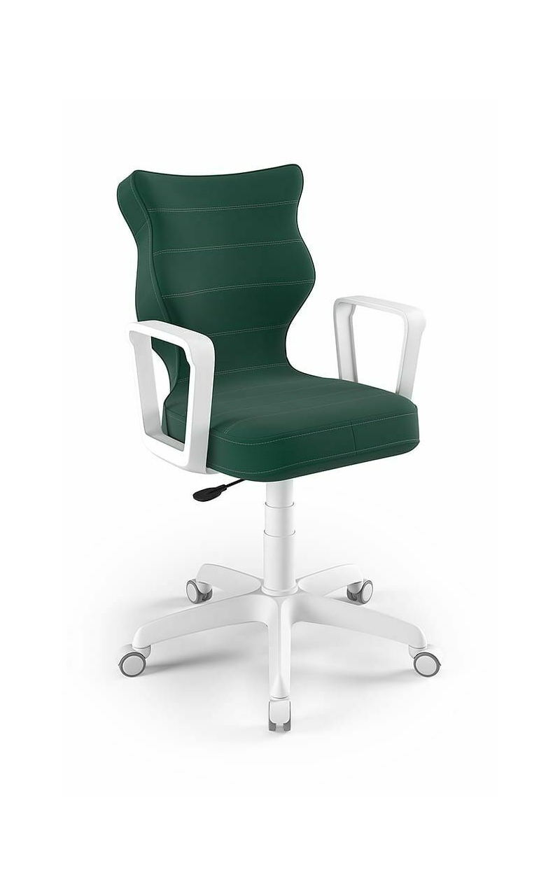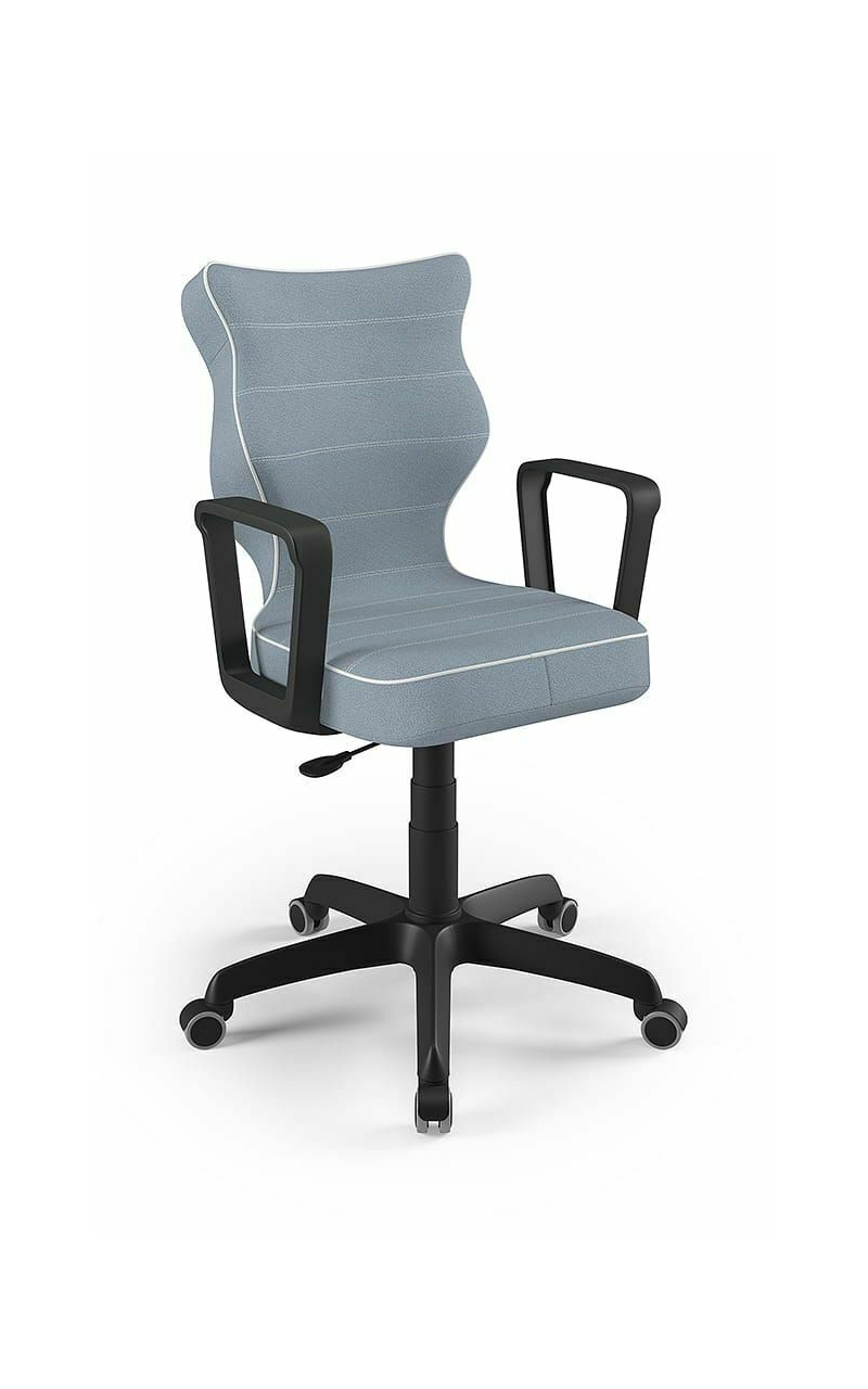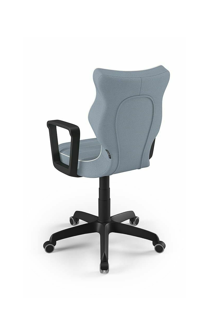 ENTELO Dobre Krzesło obrotowe DUO nr 6 - podstawa biała Terminy Towar na zamówienie. Czas produkcji 2-4 tygodnie. To linia Dobrych Krzeseł posiadająca parametry ergonomiczne, które odpowiadają za zachowanie prawidłowej postawy siedzącej. Wykończenie krzesła oraz szeroki wybór koloru tapicerki sprawia, że model pasuje do każdego wnętrza. Duo posiada regulowane podłokietniki umożliwiające wsunięcie krzesła pod blat biurka. Podstawę krzesła wykonano z tworzywa sztucznego oraz włókna szklanego. W zestawie znajdują się kółka miękkie umożliwiające ruch krzesła zarówno po powierzchniach twardych jak i wykładzinach. Produkt zaprojektowany i wyprodukowany w Polsce. Dane techniczne Egonomiczne siedzisko wykonane z tworzywa sztucznego. Podłokietniki regulowane, twarde w kolorze białym. Mechanizm: Blacha siedziska z dźwignią prosta. Podnośnik gazowy: Stal + tworzywo sztuczne. Teleskopowa osłonka na podnośnik gazowy w kolorze białym. Baza: Podstawa pięcioramienna biała (tworzywo sztuczne). Kółka miękkie średnica 50 mm, średnica trzpienia fi 11 w kolorze białym (tworzywo sztuczne) - umożliwiające ruch krzesła zarówno po powierzchniach twardych jak i wykładzinach. Za dopłatą stopki o średnicy trzpienia FI 11 wykonane z tworzywa sztucznego. Wymiary Rozmiar nr 6: Głębokość siedziska: 40 cm Szerokość siedziska: 42,5 cm Wysokość oparcia: 42,5 cm Dodatkowe informacje Model DUO posiada certyfikat zgodności z normą PN-EN 1335-1:2004, PN-EN 1335-2:2009.