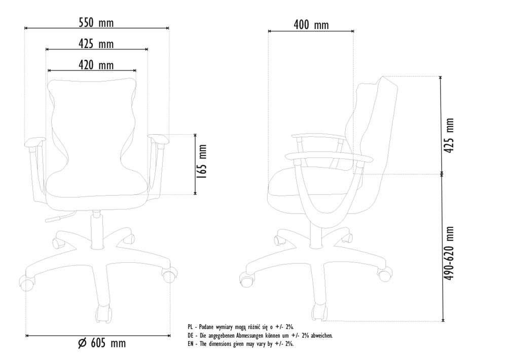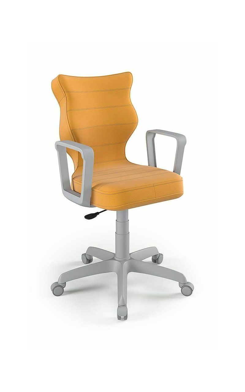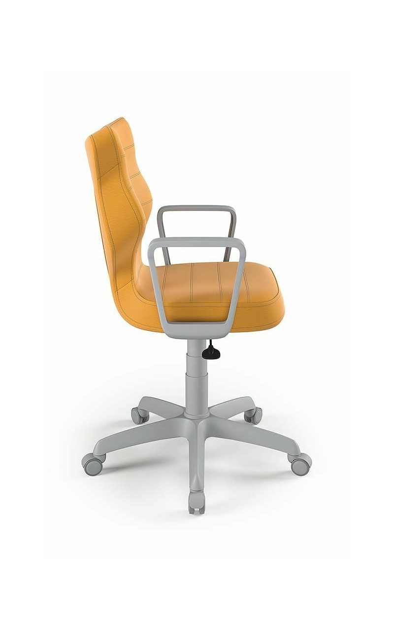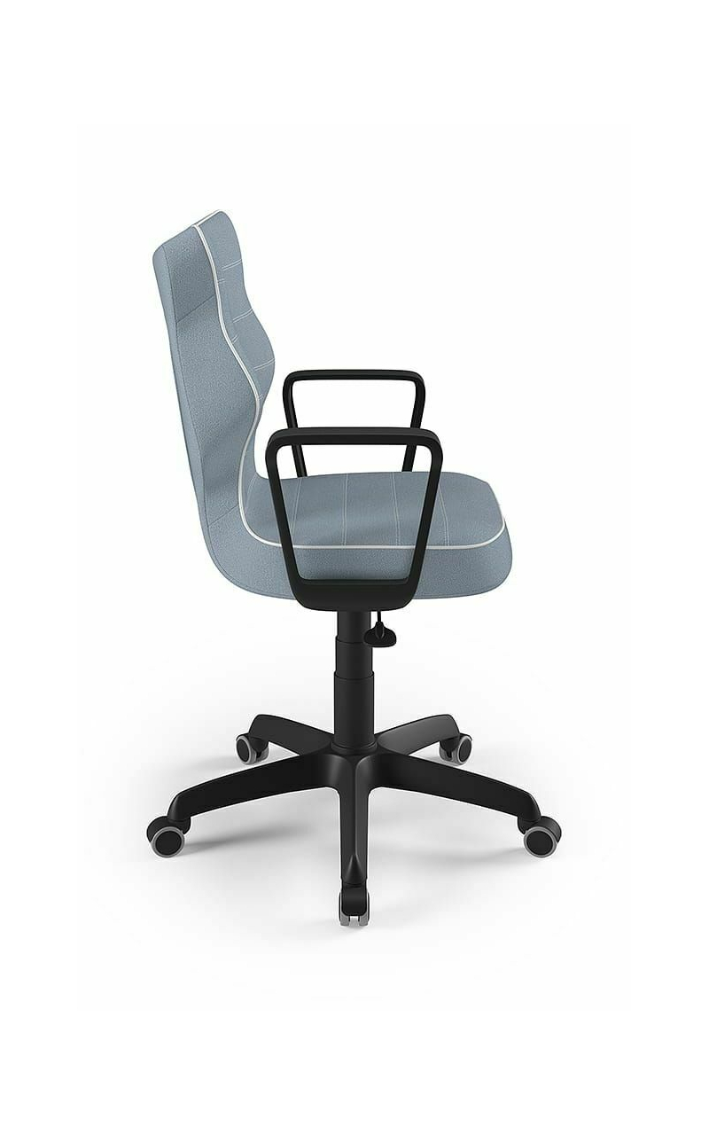 ENTELO Dobre Krzesło obrotowe DUO nr 6 - podstawa biała Terminy Towar na zamówienie. Czas produkcji 2-4 tygodnie. To linia Dobrych Krzeseł posiadająca parametry ergonomiczne, które odpowiadają za zachowanie prawidłowej postawy siedzącej. Wykończenie krzesła oraz szeroki wybór koloru tapicerki sprawia, że model pasuje do każdego wnętrza. Duo posiada regulowane podłokietniki umożliwiające wsunięcie krzesła pod blat biurka. Podstawę krzesła wykonano z tworzywa sztucznego oraz włókna szklanego. W zestawie znajdują się kółka miękkie umożliwiające ruch krzesła zarówno po powierzchniach twardych jak i wykładzinach. Produkt zaprojektowany i wyprodukowany w Polsce. Dane techniczne Egonomiczne siedzisko wykonane z tworzywa sztucznego. Podłokietniki regulowane, twarde w kolorze białym. Mechanizm: Blacha siedziska z dźwignią prosta. Podnośnik gazowy: Stal + tworzywo sztuczne. Teleskopowa osłonka na podnośnik gazowy w kolorze białym. Baza: Podstawa pięcioramienna biała (tworzywo sztuczne). Kółka miękkie średnica 50 mm, średnica trzpienia fi 11 w kolorze białym (tworzywo sztuczne) - umożliwiające ruch krzesła zarówno po powierzchniach twardych jak i wykładzinach. Za dopłatą stopki o średnicy trzpienia FI 11 wykonane z tworzywa sztucznego. Wymiary Rozmiar nr 6: Głębokość siedziska: 40 cm Szerokość siedziska: 42,5 cm Wysokość oparcia: 42,5 cm Dodatkowe informacje Model DUO posiada certyfikat zgodności z normą PN-EN 1335-1:2004, PN-EN 1335-2:2009.