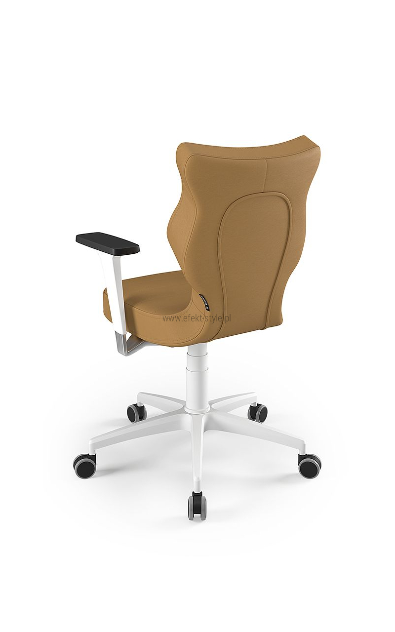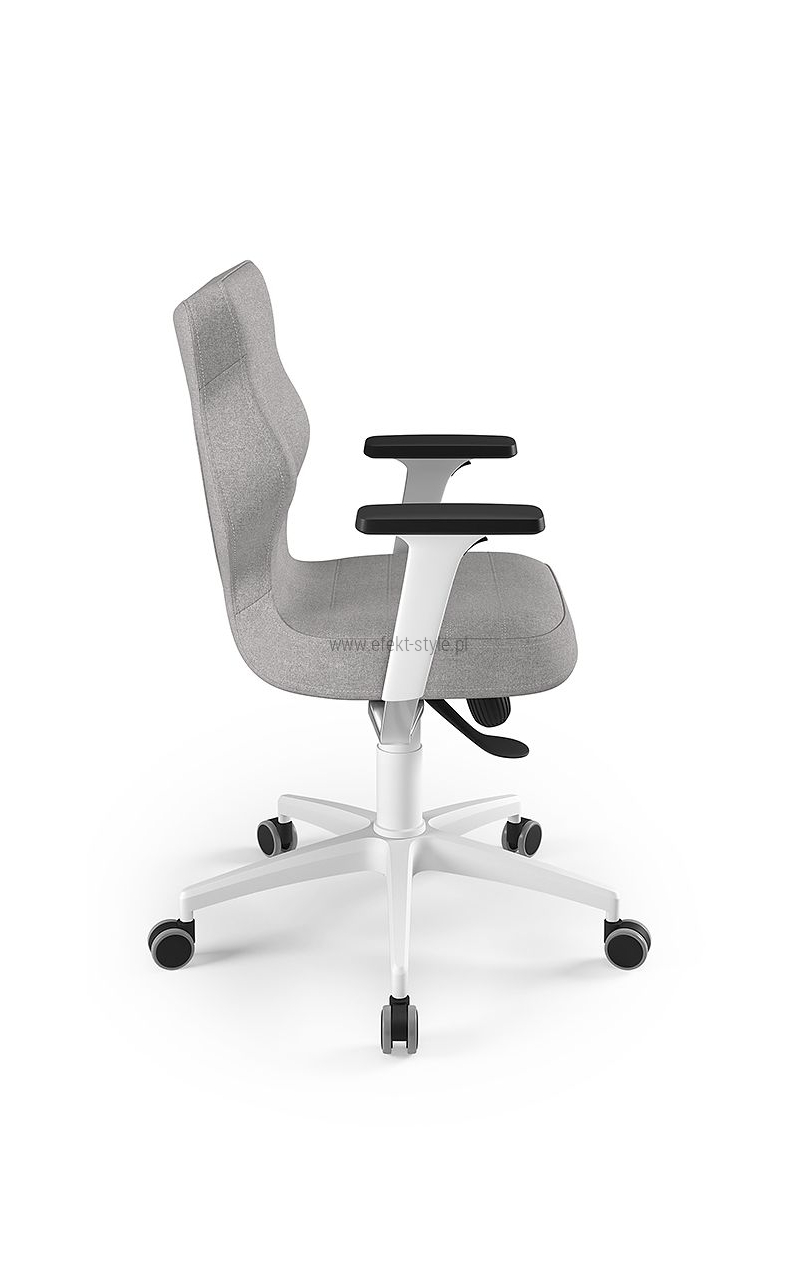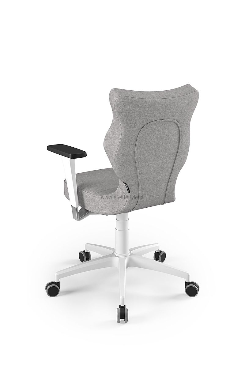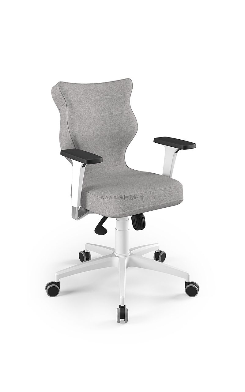 ENTELO Dobre Krzesło obrotowe DUO nr 6 - podstawa biała Terminy Towar na zamówienie. Czas produkcji 2-4 tygodnie. To linia Dobrych Krzeseł posiadająca parametry ergonomiczne, które odpowiadają za zachowanie prawidłowej postawy siedzącej. Wykończenie krzesła oraz szeroki wybór koloru tapicerki sprawia, że model pasuje do każdego wnętrza. Duo posiada regulowane podłokietniki umożliwiające wsunięcie krzesła pod blat biurka. Podstawę krzesła wykonano z tworzywa sztucznego oraz włókna szklanego. W zestawie znajdują się kółka miękkie umożliwiające ruch krzesła zarówno po powierzchniach twardych jak i wykładzinach. Produkt zaprojektowany i wyprodukowany w Polsce. Dane techniczne Egonomiczne siedzisko wykonane z tworzywa sztucznego. Podłokietniki regulowane, twarde w kolorze białym. Mechanizm: Blacha siedziska z dźwignią prosta. Podnośnik gazowy: Stal + tworzywo sztuczne. Teleskopowa osłonka na podnośnik gazowy w kolorze białym. Baza: Podstawa pięcioramienna biała (tworzywo sztuczne). Kółka miękkie średnica 50 mm, średnica trzpienia fi 11 w kolorze białym (tworzywo sztuczne) - umożliwiające ruch krzesła zarówno po powierzchniach twardych jak i wykładzinach. Za dopłatą stopki o średnicy trzpienia FI 11 wykonane z tworzywa sztucznego. Wymiary Rozmiar nr 6: Głębokość siedziska: 40 cm Szerokość siedziska: 42,5 cm Wysokość oparcia: 42,5 cm Dodatkowe informacje Model DUO posiada certyfikat zgodności z normą PN-EN 1335-1:2004, PN-EN 1335-2:2009.