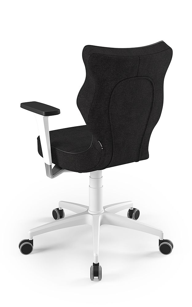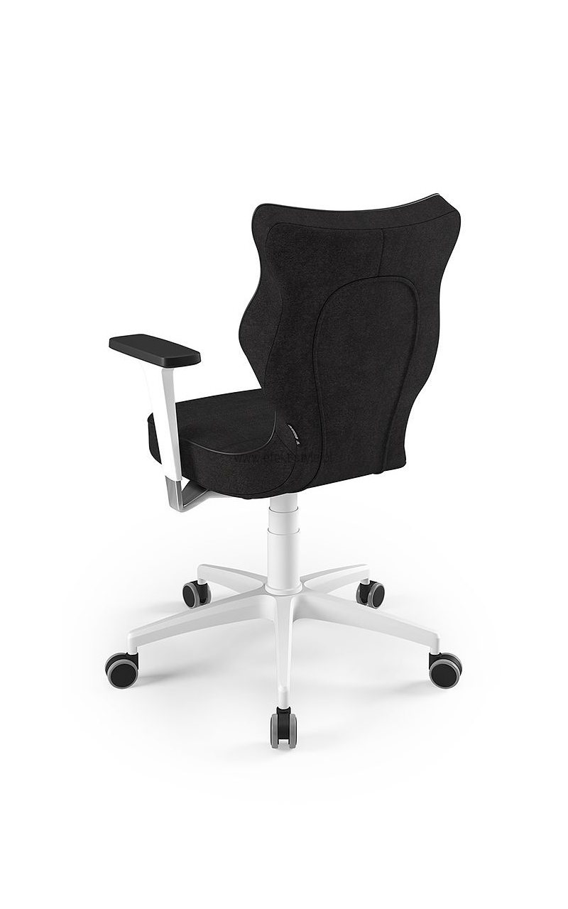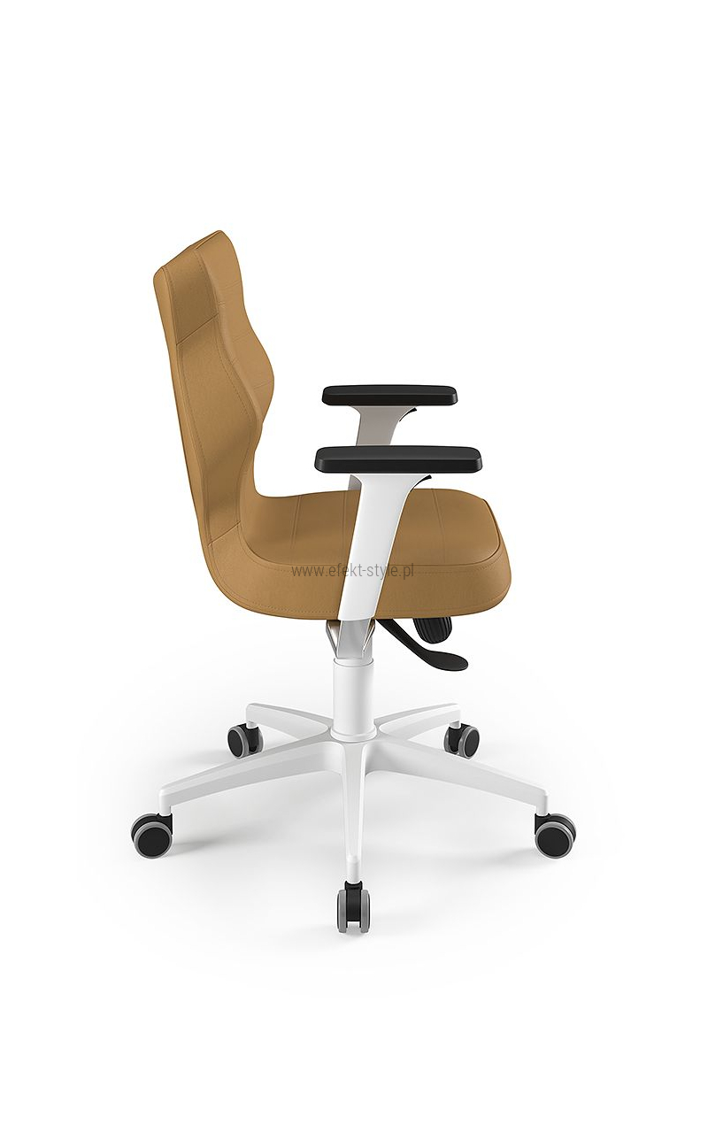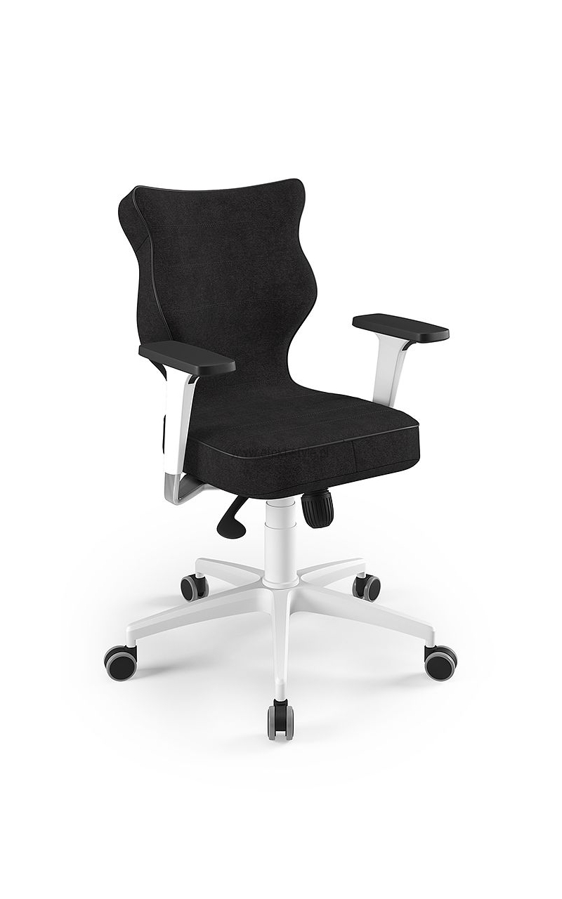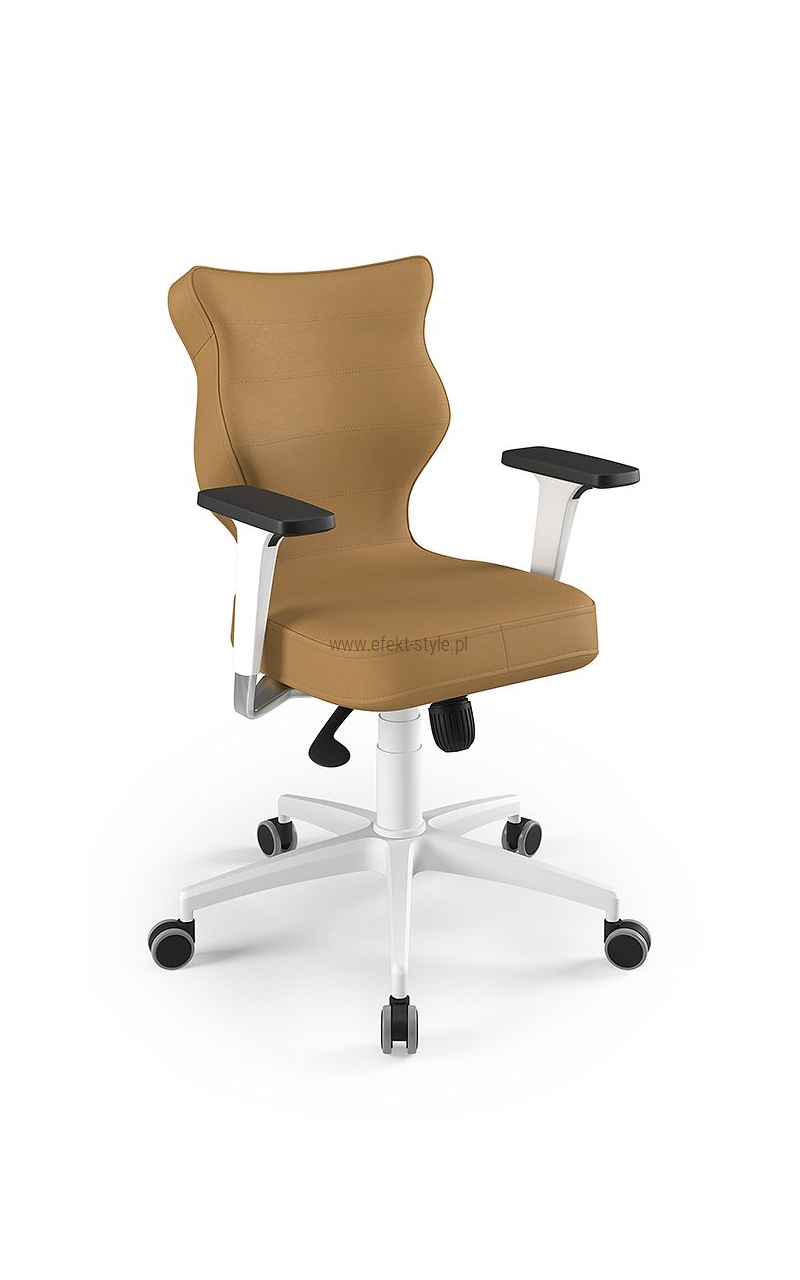 ENTELO Dobre Krzesło obrotowe DUO nr 6 - podstawa biała Terminy Towar na zamówienie. Czas produkcji 2-4 tygodnie. To linia Dobrych Krzeseł posiadająca parametry ergonomiczne, które odpowiadają za zachowanie prawidłowej postawy siedzącej. Wykończenie krzesła oraz szeroki wybór koloru tapicerki sprawia, że model pasuje do każdego wnętrza. Duo posiada regulowane podłokietniki umożliwiające wsunięcie krzesła pod blat biurka. Podstawę krzesła wykonano z tworzywa sztucznego oraz włókna szklanego. W zestawie znajdują się kółka miękkie umożliwiające ruch krzesła zarówno po powierzchniach twardych jak i wykładzinach. Produkt zaprojektowany i wyprodukowany w Polsce. Dane techniczne Egonomiczne siedzisko wykonane z tworzywa sztucznego. Podłokietniki regulowane, twarde w kolorze białym. Mechanizm: Blacha siedziska z dźwignią prosta. Podnośnik gazowy: Stal + tworzywo sztuczne. Teleskopowa osłonka na podnośnik gazowy w kolorze białym. Baza: Podstawa pięcioramienna biała (tworzywo sztuczne). Kółka miękkie średnica 50 mm, średnica trzpienia fi 11 w kolorze białym (tworzywo sztuczne) - umożliwiające ruch krzesła zarówno po powierzchniach twardych jak i wykładzinach. Za dopłatą stopki o średnicy trzpienia FI 11 wykonane z tworzywa sztucznego. Wymiary Rozmiar nr 6: Głębokość siedziska: 40 cm Szerokość siedziska: 42,5 cm Wysokość oparcia: 42,5 cm Dodatkowe informacje Model DUO posiada certyfikat zgodności z normą PN-EN 1335-1:2004, PN-EN 1335-2:2009.
