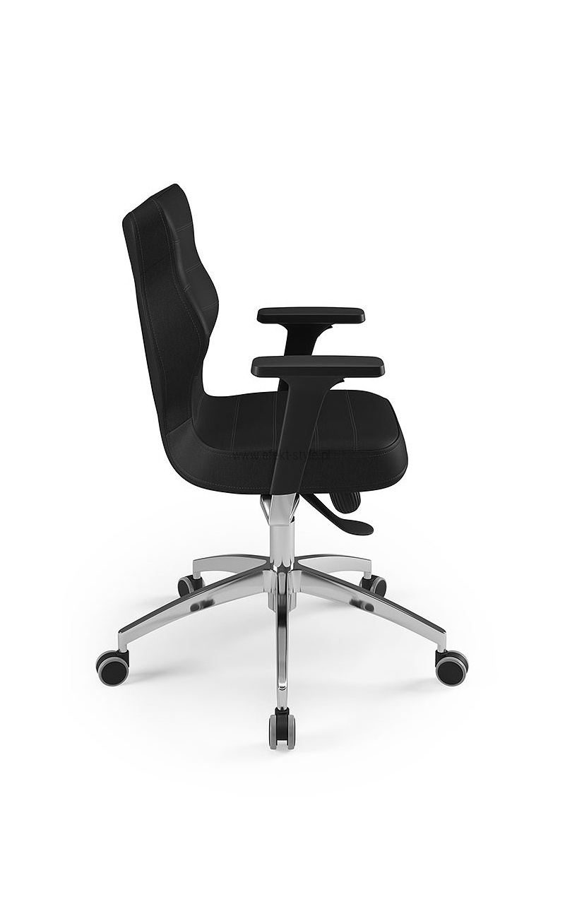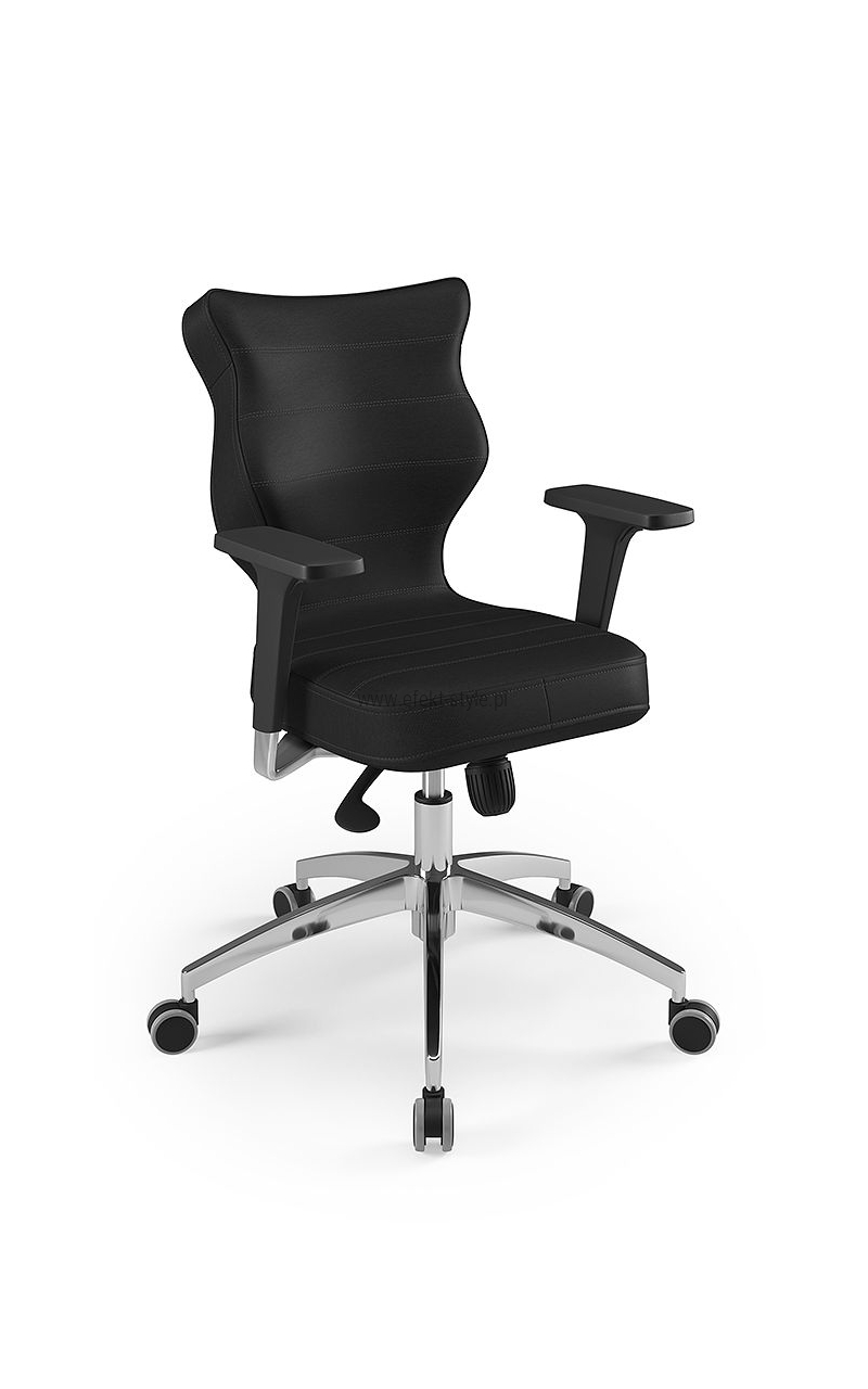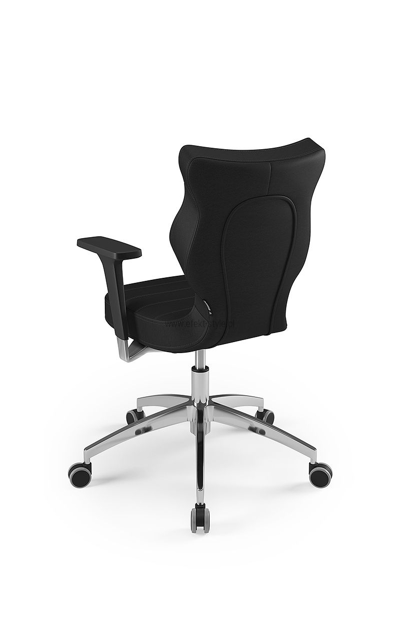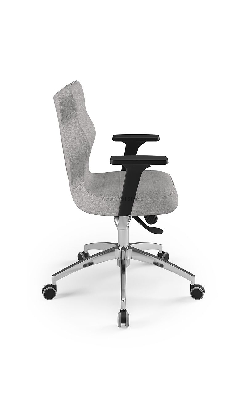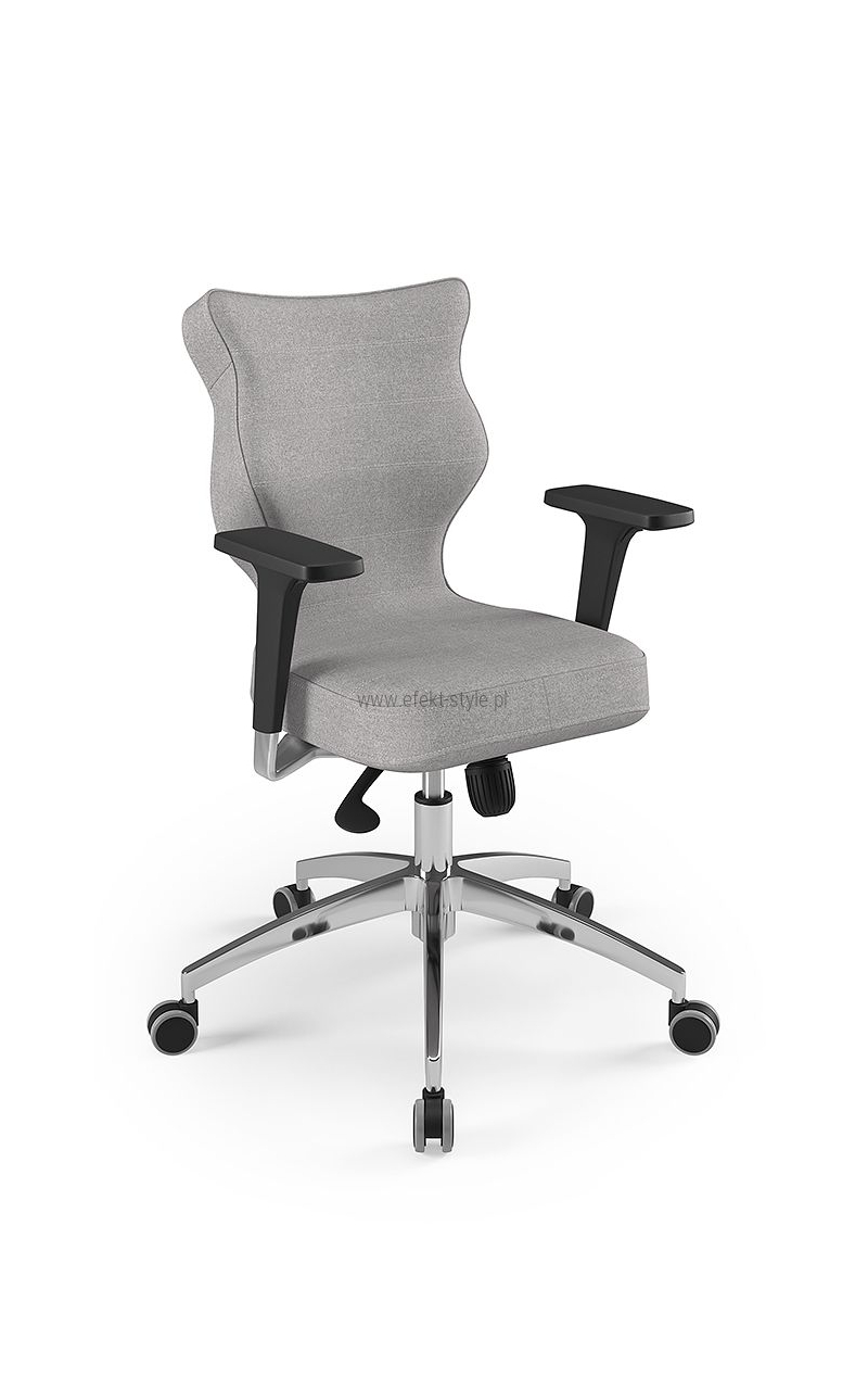 ENTELO Dobre Krzesło obrotowe DUO nr 6 - podstawa biała Terminy Towar na zamówienie. Czas produkcji 2-4 tygodnie. To linia Dobrych Krzeseł posiadająca parametry ergonomiczne, które odpowiadają za zachowanie prawidłowej postawy siedzącej. Wykończenie krzesła oraz szeroki wybór koloru tapicerki sprawia, że model pasuje do każdego wnętrza. Duo posiada regulowane podłokietniki umożliwiające wsunięcie krzesła pod blat biurka. Podstawę krzesła wykonano z tworzywa sztucznego oraz włókna szklanego. W zestawie znajdują się kółka miękkie umożliwiające ruch krzesła zarówno po powierzchniach twardych jak i wykładzinach. Produkt zaprojektowany i wyprodukowany w Polsce. Dane techniczne Egonomiczne siedzisko wykonane z tworzywa sztucznego. Podłokietniki regulowane, twarde w kolorze białym. Mechanizm: Blacha siedziska z dźwignią prosta. Podnośnik gazowy: Stal + tworzywo sztuczne. Teleskopowa osłonka na podnośnik gazowy w kolorze białym. Baza: Podstawa pięcioramienna biała (tworzywo sztuczne). Kółka miękkie średnica 50 mm, średnica trzpienia fi 11 w kolorze białym (tworzywo sztuczne) - umożliwiające ruch krzesła zarówno po powierzchniach twardych jak i wykładzinach. Za dopłatą stopki o średnicy trzpienia FI 11 wykonane z tworzywa sztucznego. Wymiary Rozmiar nr 6: Głębokość siedziska: 40 cm Szerokość siedziska: 42,5 cm Wysokość oparcia: 42,5 cm Dodatkowe informacje Model DUO posiada certyfikat zgodności z normą PN-EN 1335-1:2004, PN-EN 1335-2:2009.
