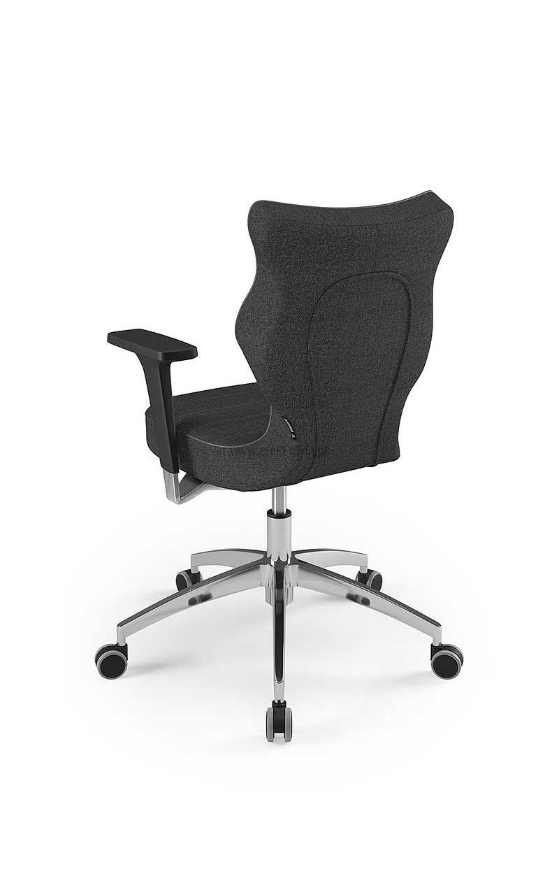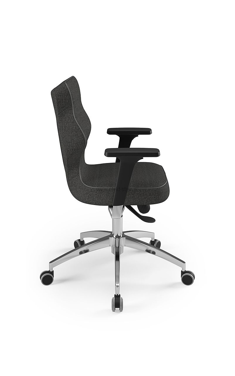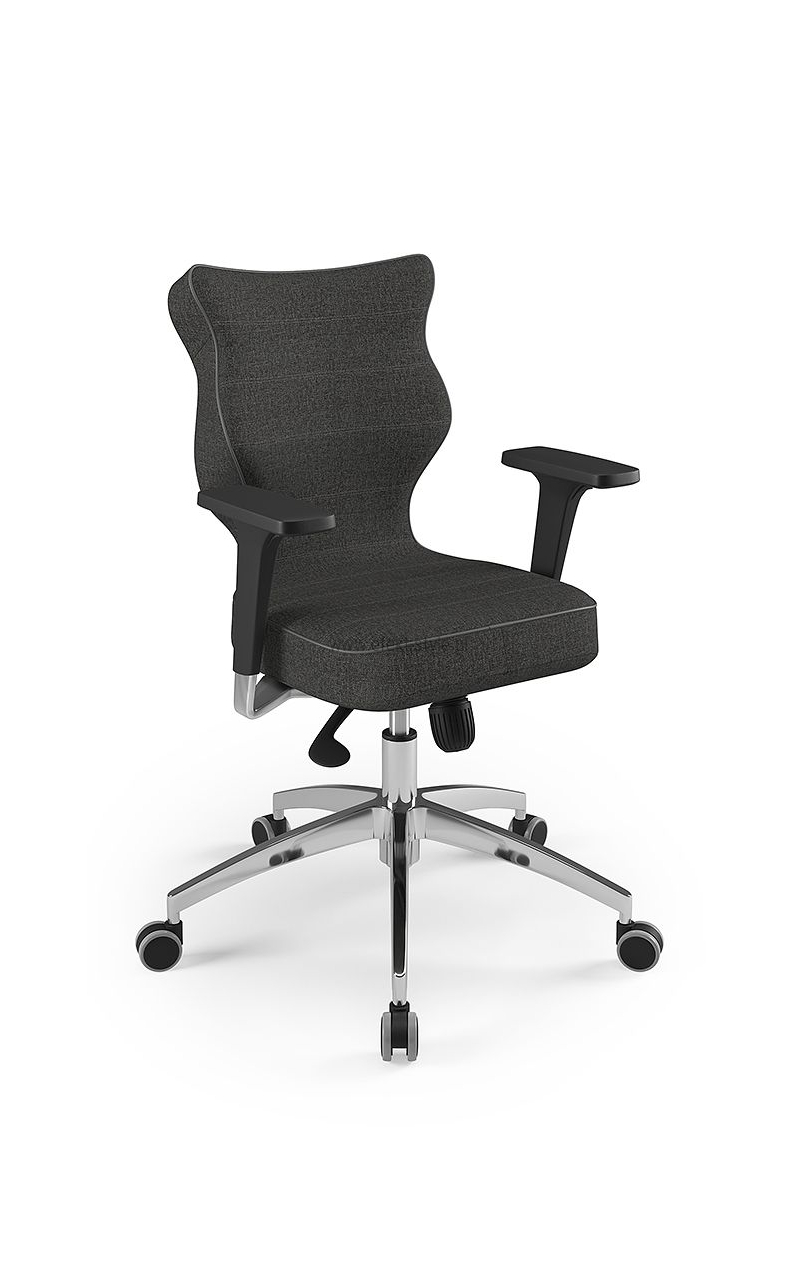 Fotel biurowy ERGOFIX TM06 szary Mechanizm Synchroniczny mechanizm ruchowy (Synchro SELF). Po zwolnieniu blokady, oparcie wychyla się w ruchu synchronicznym z siedziskiem naśladując ruch użytkownika w krześle. Wychylenie oparcia podążające za ruchem pleców użytkownika jest znacznie wyraźniejsze i szybsze aniżeli ruch siedziska. Siła oporu jaki stawia oparcie podczas wychylenia jest automatycznie dobrana do wagi Użytkownika - to funkcja "SELF" mechanizmu Synchro. Użytkownik w każdej chwili ma również możliwość blokady wybranej pozycji wychylenia oparcia i siedziska poprzez ruch dźwigni umieszczonej pod siedziskiem. Funkcja ANTI-Shock zapobiega gwałtownemu uderzeniu oparcia w plecy Użytkownika po zwolnieniu wybranej pozycji wychylenia. Siedzisko Tapicerowane tkaniną TM, która jest miła w dotyku, oddychająca, odporna na peeling i ścieralność ponad 35 tyś cykli Martindalea. Tkanina zapewnia dobra cyrkulację powietrza, jest łatwa w utrzymaniu czystości. Kolor tapicerki - szary. Oparcie Tapicerowane jest siatką, która dobrze dopasowuje się do pleców Użytkownika i zapewnia odpowiednią cyrkulację powietrze. Kolor siatki - szary. Wyposażone: w profil lędźwiowy o regulowanej wysokości, zagłówek o regulowanym kącie położenia, który pozwala na ergonomiczne podparcie głowy podczas pracy. Podłokietniki Regulowane w trzech płaszczyznach (3D): góra dół: pozwala na dostosowanie jego wysokości tak aby przedramię ułożone było pod kątem 90 stopni do tułowia, co znacznie odciąża mięśnie pleców podczas długiej pracy w pozycji siedzącej. Zakres regulacji wysokości podłokietnika to 6 cm; kąt położenia nakładki w zakresie +/- 15 stopni (skierowanie nakładek do wewnątrz siedziska ułatwia pisanie na klawiaturze, zaś ich skierowanie na zewnątrz ułatwia swobodne wstawanie z krzesła); przód - tył: regulacja nakładki podłokietnika przód/tył pozwala dostosować go do długości przedramienia; Podstawa Pięcioramienna czarna - nylonowa podstawa jezdna o lekkiej nowoczesnej stylistyce. Kółka miękkie: do powierzchni twardych tj. panele, glazura Wymiary Atest Atest Wytrzymałości i Bezpieczeństwa Użytkowania wydany przez PUR Remodex Zakład Badań i Wdrożeń Przemysłu Meblarskiego. Sposób przeprowadzenia badań wg: PN-EN 1335-1:2004 PN-EN 1335-2:2009 PN-EN 1335-3:2009 Zgodnie z atestem: ,,UWAGA: dopuszczalne maksymalne obciążenie siedziska - 150 kg". Gwarancja 24 miesiące.