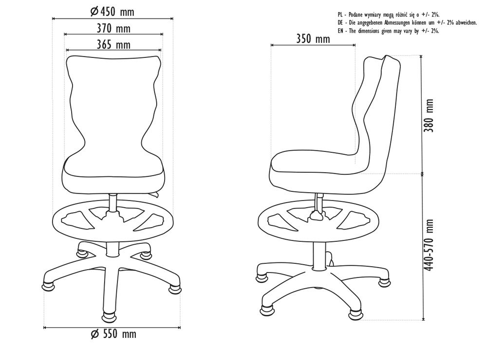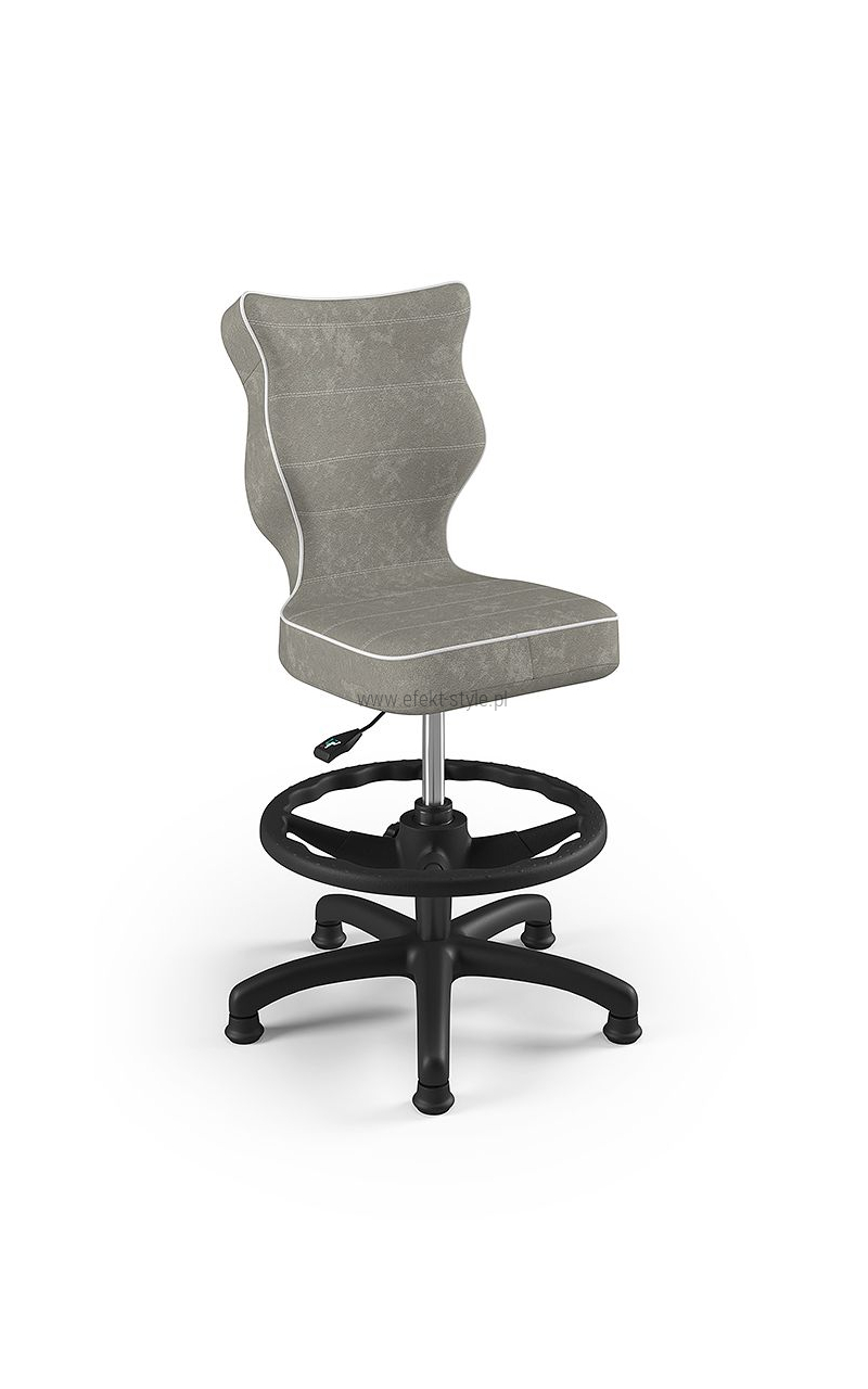 Dane techniczne | Ergonomiczne siedzisko wykonane z tworzywa sztucznego. Mechanizm: Blacha siedziska z dźwignią prosta. Podnośnik gazowy: Stal + tworzywo sztuczne. Teleskopowa osłona na podnośnik gazowy - czarna (tworzywo sztuczne). Podnóżek z regulowaną wysokością w kolorze czarnym (tworzywo sztuczne). Podstawa pięcioramienna w kolorze czarnym (tworzywo sztuczne). Stopki o średnicy trzpienia FI 11 w kolorze czarnym (tworzywo sztuczne). Krzesło nie posiada podłokietników. |
