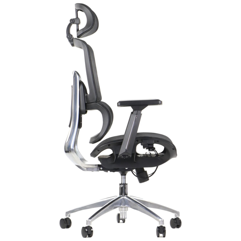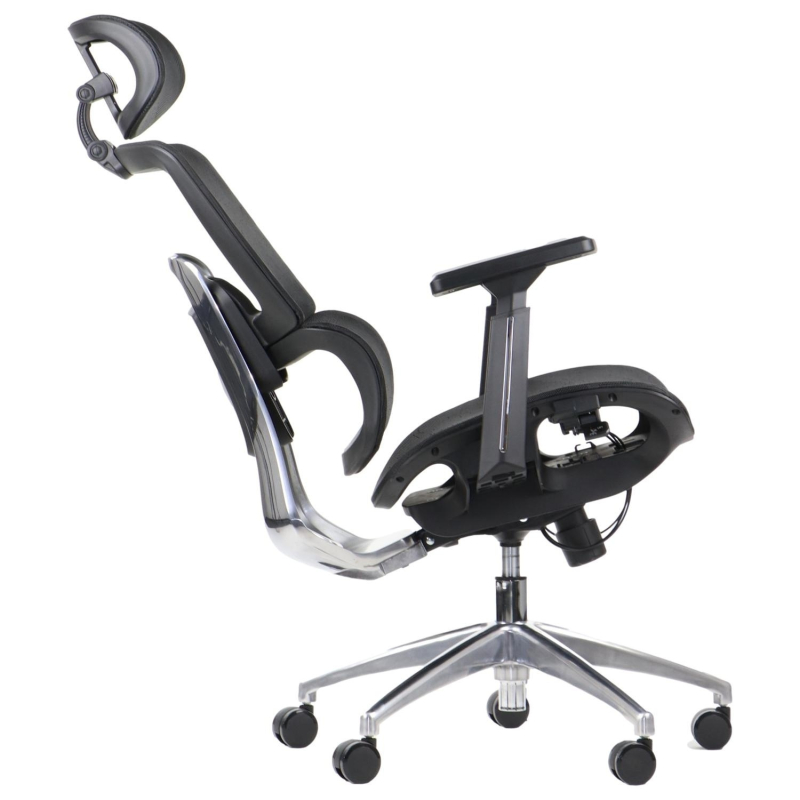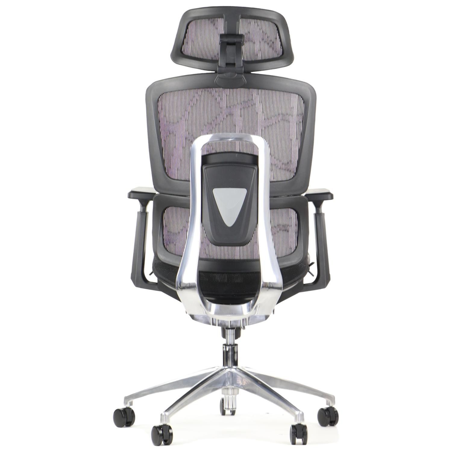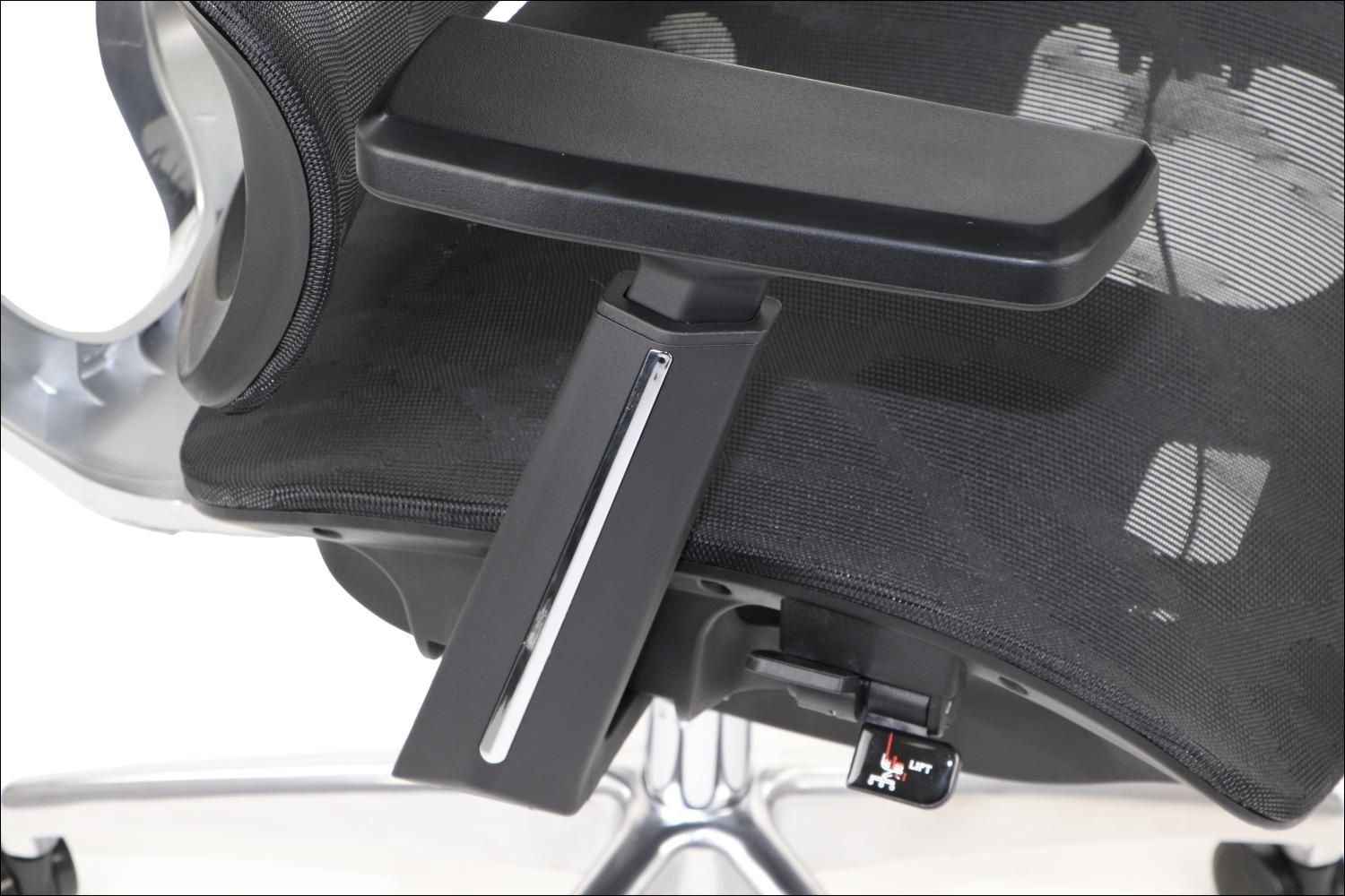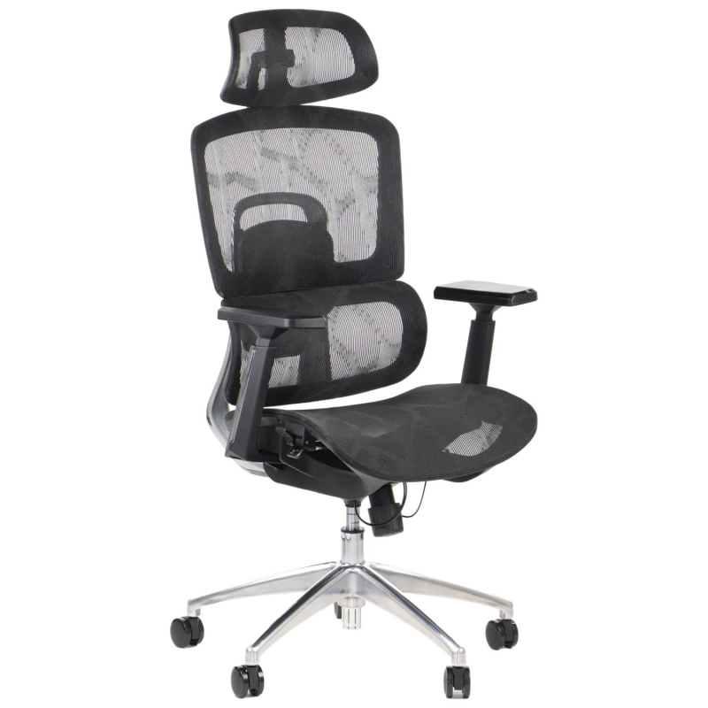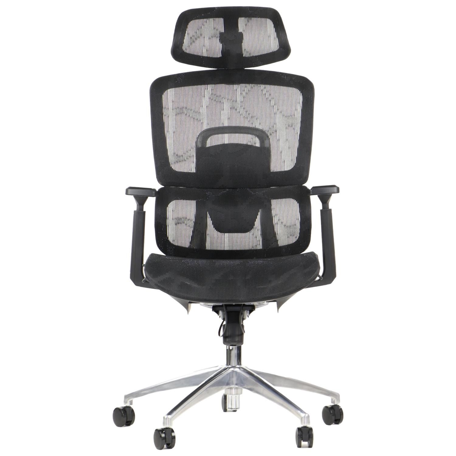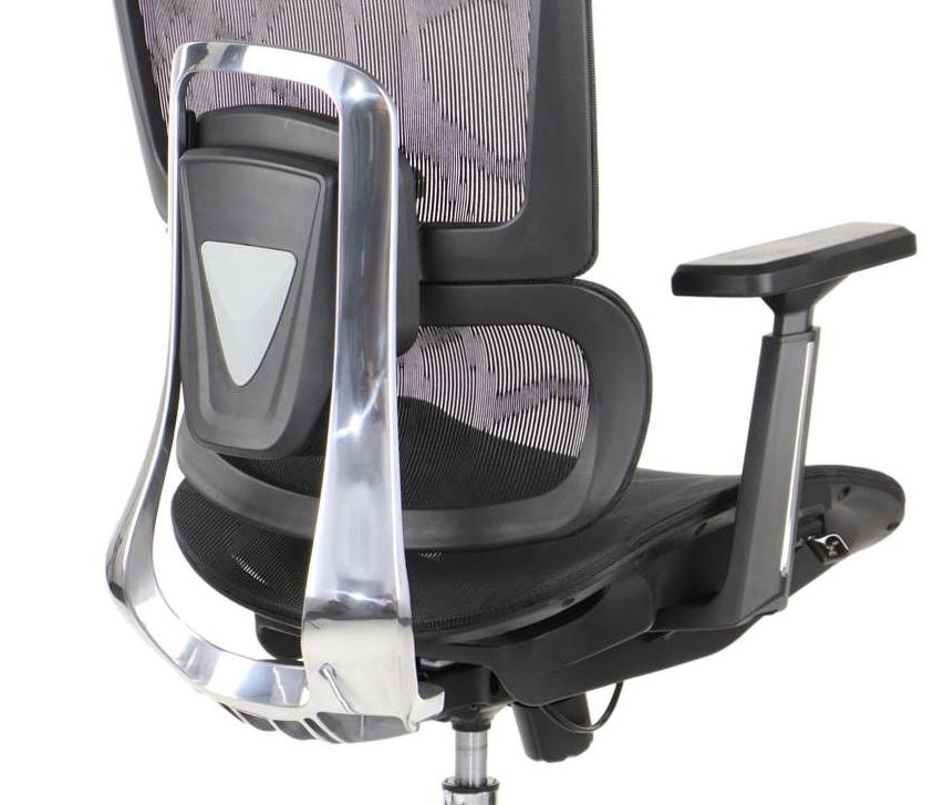 FOTEL OBROTOWY ERGOTHRONE Z PODNÓŻKIEM / CZARNY Dane techniczne: Zagłówek, oparcie i siedzisko tapicerowane wysokiej jakości siatką Mechanizm samoważący SYNCHRON Regulowane podłokietniki góra-dół, przód-tył, wychylenie na boki Regulowana wysokość oparcia i zagłówka Regulowana wysokość oparcia dla kręgów lędźwiowych Podstawa jezdna wykonana z lakierowanego aluminium w kolorze czarnym Fotel wyposażony w wygodny podnóżek (maksymalne obciążenie podnóżka do 45 kg) kolorystyka czarny Wymiary: Obciążenie 130 kg Gwarancja: 3 lata