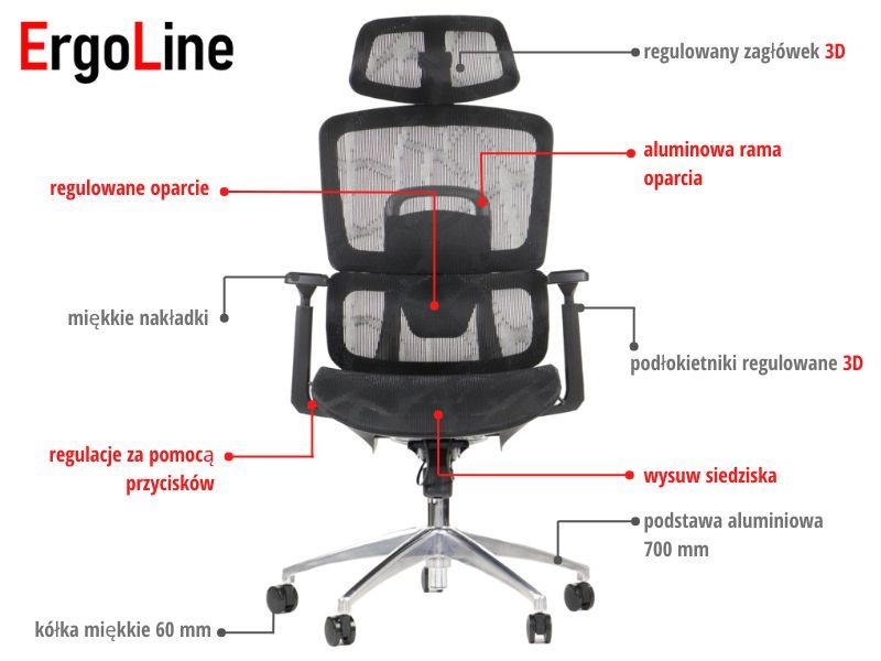 Fotel biurowy obrotowy ErgoNew A1F siedzisko siatkowe z podnóżkiem Fotel biurowy ERGONEW A1F: Ergonomia, komfort, funkcjonalność i styl Fotele biurowe są nieodłącznym elementem wyposażenia każdego miejsca pracy. Wpływają one na nasze samopoczucie, wydajność i zdrowie podczas wielu godzin spędzonych przy biurku. Jeśli szukasz fotela, który zapewni Ci doskonałe wsparcie ergonomiczne, trwałość i estetykę, warto zwrócić uwagę na fotel biurowy obrotowy ERGONEW. Ten nowoczesny model łączy w sobie innowacyjne rozwiązania z wysokiej jakości materiałami, zapewniając niezrównany komfort i wygodę. Główne atuty fotela to: ✅ łatwa i intuicyjna obsługa mechanizmami fotela ✅ regulacja wysokości oparcia z podparciem lędźwiowym ✅ regulacja wysokości, odchyłu realizowana za pomocą przycisków przy siedzisku ✅ regulowany zagłówek 3D ✅ regulowane podłokietniki 3D Ponadto regulacja wysokości, odchyłu i wysuwu siedziska to kluczowe funkcje, które pozwalają dostosować fotel do indywidualnych preferencji użytkownika. W fotelu ERGONEW regulacja ta odbywa się za pomocą przycisków umiejscowionych przy siedzisku, co zapewnia wygodny i intuicyjny sposób dostosowywania pozycji siedzenia. Podsumowując: Fotel biurowy obrotowy ERGONEW to idealne rozwiązanie dla osób, które cenią sobie komfort, ergonomię i wysoką jakość wykonania. Dzięki jego zaawansowanym regulacjom i solidnej konstrukcji, zapewnia on optymalne wsparcie podczas długotrwałego siedzenia przy biurku. Wygodne siedzisko, regulowane podłokietniki, zagłówek i oparcie sprawiają, że praca staje się bardziej komfortowa i efektywna. Fotel ERGONEW to doskonały wybór dla wszystkich, którzy dbają o swoje zdrowie i dobre samopoczucie w miejscu pracy. Dane techniczne fotela biurowego ErgoNew A1F z podnóżkiem Oparcie ✅ wykonane z wytrzymałej siatki, zapewniającej przepływ powietrza, co wpływa na komfort pracy. ✅regulowane na wysokości - regulacja wysokości oparcia umożliwia dostosowanie go do krzywizny kręgosłupa, co pomaga utrzymać prawidłową postawę ciała. Kolor czarny Zagłówek ✅ regulowany zagłówek 3D, który umożliwia dopasowanie wysokości oraz nachylenia zagłówka do indywidualnych potrzeb. Dzięki temu można uzyskać optymalne podparcie dla szyi i głowy, co wpływa na komfort i redukcję napięcia mięśniowego. Podparcie Lędźwiowe Fotel ERGONEW został wyposażony w ✅ wyprofilowanie lędźwiowe z regulacją wysokości, która współpracuje z oparciem. Ta funkcja umożliwia dopasowanie podparcia dla kręgosłupa w okolicach odcinka lędźwiowego, co jest istotne dla zachowania prawidłowej postawy ciała i uniknięcia bólu pleców. Łącznik/rama oparcia Łącznik wykonany jest z aluminium Siedzisko wykonane z tkaniny siatkowej, zapewniającej przepływ powietrza, co wpływa na komfort pracy. Kolor czarny Podnóżek Wysuwany podnóżek Wysuw siedziska Fotel posiada: ✅ funkcję wysuwu siedziska, która umożliwia dostosowanie głębokości siedziska do długości ud. To szczególnie istotne dla osób o różnej wysokości ciała, które chcą uzyskać optymalne podparcie dla ud i zapewnić odpowiednią krążenie krwi. Mechanizm synchroniczny ✅ 4-pozycyjny mechanizm synchro z funkcją "anti-shock" zapewnia płynne przemieszczanie się oparcia bez uderzenia w plecy po zwolnieniu blokady. Możliwość regulacji siły oporu mechanizmu synchro pozwala dostosować fotel do indywidualnych preferencji. Regulacja wysokości i odchyłu odbywa się za pomocą przycisków umiejscowionych przy siedzisku Podłokietniki Regulowane podłokietniki 3D to kolejny atut fotela ERGONEW. ✅ Możliwość regulacji: - góra - dół - przesuw nakładki przód - tył - kąt obrotu nakładki podłokietników pozwala na dostosowanie ich do indywidualnych preferencji i zapewnienie odpowiedniego wsparcia dla ramion i nadgarstków. Miękkie nakładki zapewniają dodatkowy komfort podczas korzystania z fotela przez dłuższy czas. Podnośnik ✅ Podnośnik klasy 4 to gwarancja niezawodności i płynnej regulacji wysokości siedziska. Dzięki tej funkcji można dostosować wysokość siedziska do swojego biurka. Podstawa/kółka Podstawa fotela wykonana z aluminium kółka miękkie fi 60 mm przystosowane do powierzchni twardych Atest Gwarancją jakości fotela jest ✅ ATEST wytrzymałościowy w zakresie bezpieczeństwa użytkowania, zgodność z normami: PN-EN 1335-2:2019-03, PN-EN 1728:2012/AC:2013 PN-EN 1022:2024-04 max obciązenie siedziska - 150 kg Montaż Do samodzielnego montażu , instrukcja dołączona do przesyłki. Gwarancja 24 miesiące Wymiary Wysokość całkowita bez zagłówka 106-115 cm Wysokość położenia siedziska 49 - 58 cm Wysokość oparcia regulowane w zakresie + 5 cm Szerokość siedziska 50 cm Podstawa fi 70 cm UWAGA: Podane wymiary magą różnić się o +/- 1-2 cm. Poniżej przedstawiamy tabele porównawczą foteli biurowych z serii ErgoNew: funkcje/model ErgoNew A1 ErgoNew A1 F ErgoNew S1 ErgoNew S1A ErgoNew S7 ErgoNew S8 Regulacja zagłówka 3D 3D 3D 3D Góra-dół 2D Regulacja podłokietników 3D 3D 3D 3D 3D 3D Regulacja wysokości oparcia tak tak tak tak tak tak Wysuw siedziska tak tak nie tak tak tak Rodzaj podstawy aluminium aluminium nylon aluminium aluminium aluminium Kółka miękkie Tak/60 mm Tak/60 mm Tak/60 mm Tak/65 mm Tak/65 mm Tak/65 mm Łącznik oparcia – wykonanie aluminium aluminium metal metal aluminium aluminium Rama oparcia aluminium aluminium nylon nylon nylon aluminium Korpus podłokietnika metal metal aluminium aluminium Zobacz pozostałe modele z tej serii: