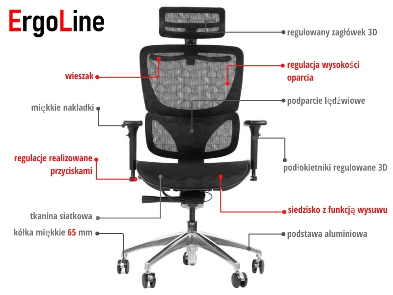 Fotel biurowy obrotowy ErgoNew A1F siedzisko siatkowe z podnóżkiem Fotel biurowy ERGONEW A1F: Ergonomia, komfort, funkcjonalność i styl Fotele biurowe są nieodłącznym elementem wyposażenia każdego miejsca pracy. Wpływają one na nasze samopoczucie, wydajność i zdrowie podczas wielu godzin spędzonych przy biurku. Jeśli szukasz fotela, który zapewni Ci doskonałe wsparcie ergonomiczne, trwałość i estetykę, warto zwrócić uwagę na fotel biurowy obrotowy ERGONEW. Ten nowoczesny model łączy w sobie innowacyjne rozwiązania z wysokiej jakości materiałami, zapewniając niezrównany komfort i wygodę. Główne atuty fotela to: ✅ łatwa i intuicyjna obsługa mechanizmami fotela ✅ regulacja wysokości oparcia z podparciem lędźwiowym ✅ regulacja wysokości, odchyłu realizowana za pomocą przycisków przy siedzisku ✅ regulowany zagłówek 3D ✅ regulowane podłokietniki 3D Ponadto regulacja wysokości, odchyłu i wysuwu siedziska to kluczowe funkcje, które pozwalają dostosować fotel do indywidualnych preferencji użytkownika. W fotelu ERGONEW regulacja ta odbywa się za pomocą przycisków umiejscowionych przy siedzisku, co zapewnia wygodny i intuicyjny sposób dostosowywania pozycji siedzenia. Podsumowując: Fotel biurowy obrotowy ERGONEW to idealne rozwiązanie dla osób, które cenią sobie komfort, ergonomię i wysoką jakość wykonania. Dzięki jego zaawansowanym regulacjom i solidnej konstrukcji, zapewnia on optymalne wsparcie podczas długotrwałego siedzenia przy biurku. Wygodne siedzisko, regulowane podłokietniki, zagłówek i oparcie sprawiają, że praca staje się bardziej komfortowa i efektywna. Fotel ERGONEW to doskonały wybór dla wszystkich, którzy dbają o swoje zdrowie i dobre samopoczucie w miejscu pracy. Dane techniczne fotela biurowego ErgoNew A1F z podnóżkiem Oparcie ✅ wykonane z wytrzymałej siatki, zapewniającej przepływ powietrza, co wpływa na komfort pracy. ✅regulowane na wysokości - regulacja wysokości oparcia umożliwia dostosowanie go do krzywizny kręgosłupa, co pomaga utrzymać prawidłową postawę ciała. Kolor czarny Zagłówek ✅ regulowany zagłówek 3D, który umożliwia dopasowanie wysokości oraz nachylenia zagłówka do indywidualnych potrzeb. Dzięki temu można uzyskać optymalne podparcie dla szyi i głowy, co wpływa na komfort i redukcję napięcia mięśniowego. Podparcie Lędźwiowe Fotel ERGONEW został wyposażony w ✅ wyprofilowanie lędźwiowe z regulacją wysokości, która współpracuje z oparciem. Ta funkcja umożliwia dopasowanie podparcia dla kręgosłupa w okolicach odcinka lędźwiowego, co jest istotne dla zachowania prawidłowej postawy ciała i uniknięcia bólu pleców. Łącznik/rama oparcia Łącznik wykonany jest z aluminium Siedzisko wykonane z tkaniny siatkowej, zapewniającej przepływ powietrza, co wpływa na komfort pracy. Kolor czarny Podnóżek Wysuwany podnóżek Wysuw siedziska Fotel posiada: ✅ funkcję wysuwu siedziska, która umożliwia dostosowanie głębokości siedziska do długości ud. To szczególnie istotne dla osób o różnej wysokości ciała, które chcą uzyskać optymalne podparcie dla ud i zapewnić odpowiednią krążenie krwi. Mechanizm synchroniczny ✅ 4-pozycyjny mechanizm synchro z funkcją "anti-shock" zapewnia płynne przemieszczanie się oparcia bez uderzenia w plecy po zwolnieniu blokady. Możliwość regulacji siły oporu mechanizmu synchro pozwala dostosować fotel do indywidualnych preferencji. Regulacja wysokości i odchyłu odbywa się za pomocą przycisków umiejscowionych przy siedzisku Podłokietniki Regulowane podłokietniki 3D to kolejny atut fotela ERGONEW. ✅ Możliwość regulacji: - góra - dół - przesuw nakładki przód - tył - kąt obrotu nakładki podłokietników pozwala na dostosowanie ich do indywidualnych preferencji i zapewnienie odpowiedniego wsparcia dla ramion i nadgarstków. Miękkie nakładki zapewniają dodatkowy komfort podczas korzystania z fotela przez dłuższy czas. Podnośnik ✅ Podnośnik klasy 4 to gwarancja niezawodności i płynnej regulacji wysokości siedziska. Dzięki tej funkcji można dostosować wysokość siedziska do swojego biurka. Podstawa/kółka Podstawa fotela wykonana z aluminium kółka miękkie fi 60 mm przystosowane do powierzchni twardych Atest Gwarancją jakości fotela jest ✅ ATEST wytrzymałościowy w zakresie bezpieczeństwa użytkowania, zgodność z normami: PN-EN 1335-2:2019-03, PN-EN 1728:2012/AC:2013 PN-EN 1022:2024-04 max obciązenie siedziska - 150 kg Montaż Do samodzielnego montażu , instrukcja dołączona do przesyłki. Gwarancja 24 miesiące Wymiary Wysokość całkowita bez zagłówka 106-115 cm Wysokość położenia siedziska 49 - 58 cm Wysokość oparcia regulowane w zakresie + 5 cm Szerokość siedziska 50 cm Podstawa fi 70 cm UWAGA: Podane wymiary magą różnić się o +/- 1-2 cm. Poniżej przedstawiamy tabele porównawczą foteli biurowych z serii ErgoNew: funkcje/model ErgoNew A1 ErgoNew A1 F ErgoNew S1 ErgoNew S1A ErgoNew S7 ErgoNew S8 Regulacja zagłówka 3D 3D 3D 3D Góra-dół 2D Regulacja podłokietników 3D 3D 3D 3D 3D 3D Regulacja wysokości oparcia tak tak tak tak tak tak Wysuw siedziska tak tak nie tak tak tak Rodzaj podstawy aluminium aluminium nylon aluminium aluminium aluminium Kółka miękkie Tak/60 mm Tak/60 mm Tak/60 mm Tak/65 mm Tak/65 mm Tak/65 mm Łącznik oparcia – wykonanie aluminium aluminium metal metal aluminium aluminium Rama oparcia aluminium aluminium nylon nylon nylon aluminium Korpus podłokietnika metal metal aluminium aluminium Zobacz pozostałe modele z tej serii: