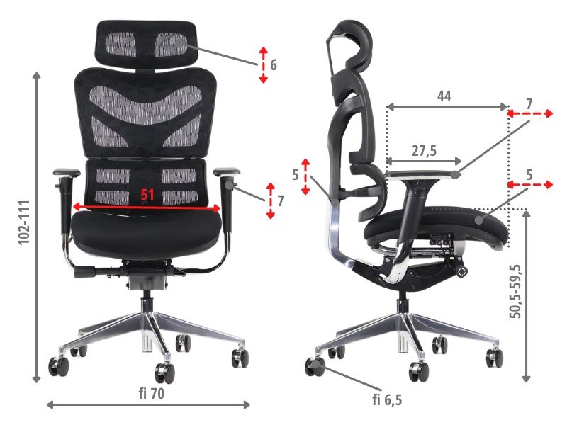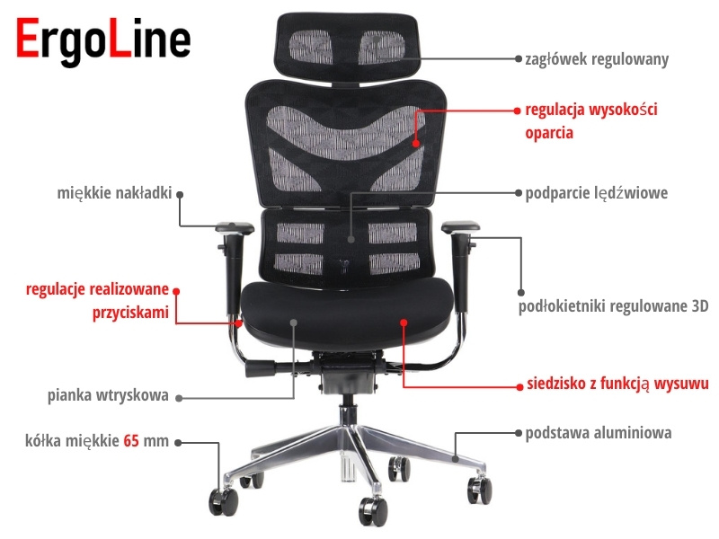 Fotel biurowy obrotowy ErgoNew A1F siedzisko siatkowe z podnóżkiem Fotel biurowy ERGONEW A1F: Ergonomia, komfort, funkcjonalność i styl Fotele biurowe są nieodłącznym elementem wyposażenia każdego miejsca pracy. Wpływają one na nasze samopoczucie, wydajność i zdrowie podczas wielu godzin spędzonych przy biurku. Jeśli szukasz fotela, który zapewni Ci doskonałe wsparcie ergonomiczne, trwałość i estetykę, warto zwrócić uwagę na fotel biurowy obrotowy ERGONEW. Ten nowoczesny model łączy w sobie innowacyjne rozwiązania z wysokiej jakości materiałami, zapewniając niezrównany komfort i wygodę. Główne atuty fotela to: ✅ łatwa i intuicyjna obsługa mechanizmami fotela ✅ regulacja wysokości oparcia z podparciem lędźwiowym ✅ regulacja wysokości, odchyłu realizowana za pomocą przycisków przy siedzisku ✅ regulowany zagłówek 3D ✅ regulowane podłokietniki 3D Ponadto regulacja wysokości, odchyłu i wysuwu siedziska to kluczowe funkcje, które pozwalają dostosować fotel do indywidualnych preferencji użytkownika. W fotelu ERGONEW regulacja ta odbywa się za pomocą przycisków umiejscowionych przy siedzisku, co zapewnia wygodny i intuicyjny sposób dostosowywania pozycji siedzenia. Podsumowując: Fotel biurowy obrotowy ERGONEW to idealne rozwiązanie dla osób, które cenią sobie komfort, ergonomię i wysoką jakość wykonania. Dzięki jego zaawansowanym regulacjom i solidnej konstrukcji, zapewnia on optymalne wsparcie podczas długotrwałego siedzenia przy biurku. Wygodne siedzisko, regulowane podłokietniki, zagłówek i oparcie sprawiają, że praca staje się bardziej komfortowa i efektywna. Fotel ERGONEW to doskonały wybór dla wszystkich, którzy dbają o swoje zdrowie i dobre samopoczucie w miejscu pracy. Dane techniczne fotela biurowego ErgoNew A1F z podnóżkiem Oparcie ✅ wykonane z wytrzymałej siatki, zapewniającej przepływ powietrza, co wpływa na komfort pracy. ✅regulowane na wysokości - regulacja wysokości oparcia umożliwia dostosowanie go do krzywizny kręgosłupa, co pomaga utrzymać prawidłową postawę ciała. Kolor czarny Zagłówek ✅ regulowany zagłówek 3D, który umożliwia dopasowanie wysokości oraz nachylenia zagłówka do indywidualnych potrzeb. Dzięki temu można uzyskać optymalne podparcie dla szyi i głowy, co wpływa na komfort i redukcję napięcia mięśniowego. Podparcie Lędźwiowe Fotel ERGONEW został wyposażony w ✅ wyprofilowanie lędźwiowe z regulacją wysokości, która współpracuje z oparciem. Ta funkcja umożliwia dopasowanie podparcia dla kręgosłupa w okolicach odcinka lędźwiowego, co jest istotne dla zachowania prawidłowej postawy ciała i uniknięcia bólu pleców. Łącznik/rama oparcia Łącznik wykonany jest z aluminium Siedzisko wykonane z tkaniny siatkowej, zapewniającej przepływ powietrza, co wpływa na komfort pracy. Kolor czarny Podnóżek Wysuwany podnóżek Wysuw siedziska Fotel posiada: ✅ funkcję wysuwu siedziska, która umożliwia dostosowanie głębokości siedziska do długości ud. To szczególnie istotne dla osób o różnej wysokości ciała, które chcą uzyskać optymalne podparcie dla ud i zapewnić odpowiednią krążenie krwi. Mechanizm synchroniczny ✅ 4-pozycyjny mechanizm synchro z funkcją "anti-shock" zapewnia płynne przemieszczanie się oparcia bez uderzenia w plecy po zwolnieniu blokady. Możliwość regulacji siły oporu mechanizmu synchro pozwala dostosować fotel do indywidualnych preferencji. Regulacja wysokości i odchyłu odbywa się za pomocą przycisków umiejscowionych przy siedzisku Podłokietniki Regulowane podłokietniki 3D to kolejny atut fotela ERGONEW. ✅ Możliwość regulacji: - góra - dół - przesuw nakładki przód - tył - kąt obrotu nakładki podłokietników pozwala na dostosowanie ich do indywidualnych preferencji i zapewnienie odpowiedniego wsparcia dla ramion i nadgarstków. Miękkie nakładki zapewniają dodatkowy komfort podczas korzystania z fotela przez dłuższy czas. Podnośnik ✅ Podnośnik klasy 4 to gwarancja niezawodności i płynnej regulacji wysokości siedziska. Dzięki tej funkcji można dostosować wysokość siedziska do swojego biurka. Podstawa/kółka Podstawa fotela wykonana z aluminium kółka miękkie fi 60 mm przystosowane do powierzchni twardych Atest Gwarancją jakości fotela jest ✅ ATEST wytrzymałościowy w zakresie bezpieczeństwa użytkowania, zgodność z normami: PN-EN 1335-2:2019-03, PN-EN 1728:2012/AC:2013 PN-EN 1022:2024-04 max obciązenie siedziska - 150 kg Montaż Do samodzielnego montażu , instrukcja dołączona do przesyłki. Gwarancja 24 miesiące Wymiary Wysokość całkowita bez zagłówka 106-115 cm Wysokość położenia siedziska 49 - 58 cm Wysokość oparcia regulowane w zakresie + 5 cm Szerokość siedziska 50 cm Podstawa fi 70 cm UWAGA: Podane wymiary magą różnić się o +/- 1-2 cm. Poniżej przedstawiamy tabele porównawczą foteli biurowych z serii ErgoNew: funkcje/model ErgoNew A1 ErgoNew A1 F ErgoNew S1 ErgoNew S1A ErgoNew S7 ErgoNew S8 Regulacja zagłówka 3D 3D 3D 3D Góra-dół 2D Regulacja podłokietników 3D 3D 3D 3D 3D 3D Regulacja wysokości oparcia tak tak tak tak tak tak Wysuw siedziska tak tak nie tak tak tak Rodzaj podstawy aluminium aluminium nylon aluminium aluminium aluminium Kółka miękkie Tak/60 mm Tak/60 mm Tak/60 mm Tak/65 mm Tak/65 mm Tak/65 mm Łącznik oparcia – wykonanie aluminium aluminium metal metal aluminium aluminium Rama oparcia aluminium aluminium nylon nylon nylon aluminium Korpus podłokietnika metal metal aluminium aluminium Zobacz pozostałe modele z tej serii: