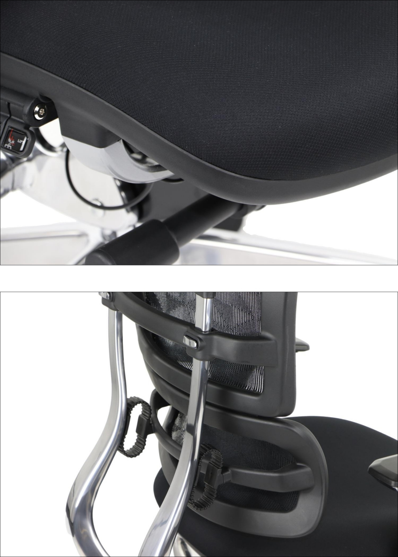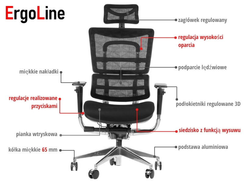FOTEL OBROTOWY ERGOTHRONE Z PODNÓŻKIEM / CZARNY Dane techniczne: Zagłówek, oparcie i siedzisko tapicerowane wysokiej jakości siatką Mechanizm samoważący SYNCHRON Regulowane podłokietniki góra-dół, przód-tył, wychylenie na boki Regulowana wysokość oparcia i zagłówka Regulowana wysokość oparcia dla kręgów lędźwiowych Podstawa jezdna wykonana z lakierowanego aluminium w kolorze czarnym Fotel wyposażony w wygodny podnóżek (maksymalne obciążenie podnóżka do 45 kg) kolorystyka czarny Wymiary: Obciążenie 130 kg Gwarancja: 3 lata