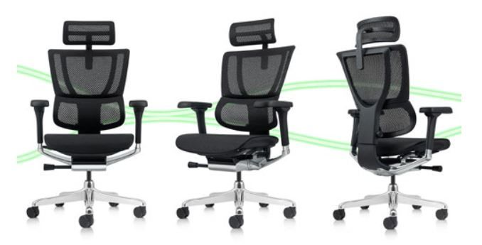 Fotel tapicerowany jest wysokiej jakości siatką, która posiada 10 stref o zróżnicowanym napięciu, tak by idealnie dopasować się do ciała Użytkownika.