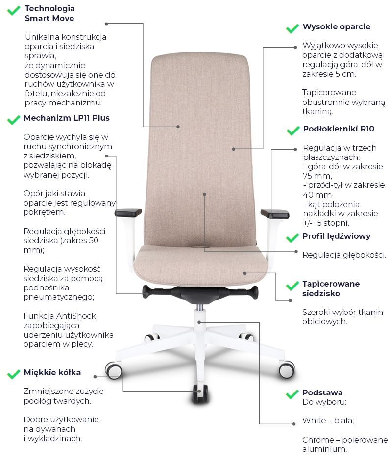 Fotel biurowy obrotowy SMART SW10N - obciążenie do 200 kg/ atest do pracy 24/7 SMART to fotel biurowy obrotowy, który idealnie spełnia wymagania do ergonomicznej pracy zarówno w biurze, jak i w domu, dostosowany jest do potrzeb pracy z urządzeniami przenośnymi jak i do pracy klasycznej. Fotel spełnia takie wymagania użytkowników jak : trwałość - wysokiej jakości materiały gwarantujące długoletnie użytkowanie co gwarantuje GWARANCJA producenta wynosząca 60 miesięcy. nowoczesność - nowoczesny design, intuicyjność - łatwość w ustawieniach fotela, uniwersalność - przeznaczony dla każdego człowieka. Najważniejsze, że fotel został przebadany przez niezależne instytucje atestujące, pod względem ergonomii i wytrzymałości, o czym świadczą wystawione dokumenty takie jak: protokół oceny ergonomicznej oraz atest z badań wytrzymałościowych w zakresie bezpieczeństwa użytkowania do 200 kg oraz pracy 24 h przez 7 dni. Fotel biurowy SMART SW10N - wersja NET DANE TECHNICZNE Oparcie: rama wykonana z tworzywa elastycznego wysokiej jakości w kolorze białym, tapicerowana elastyczną siatką 3D - Runner w kolorze czarnym Oparcie dostosowujące się do Twojej postawy nie ograniczające ruchów Siedzisko: Siedzisko wykonane jest z tworzywa sztucznego i stanowi integralną część całego krzesła. Pokryte jest pianką wylewaną o gęstości 65 kg/m3. Boki siedziska uszyte są z pojedynczych elementów w różnorodnej kolorystyce. Krawędź przednia jest odpowiednio zaokrąglona, aby zwiększyć komfort pracy poprzez zmniejszenie nacisku na część udową. Tapicerowane tkaniną o wysokich parametrach ścieralności. Rodzaj tkaniny i wybór koloru dostepny w konfiguratorze produktu. Wysokość siedziska dostosowujemy za pomocą kolumny gazowej z poduszką powietrzną, aby zwiększyć komfort siedzenia na krześle. Podłokietniki: Innowacyjne regulowane miękkie podłokietniki są zintegrowane z oparciem krzesła. Zamontowane na specjalnym zawiasie kulowym, który umożliwia regulację w zakresie 90° góra-dół i 90° lewo-prawo. Nakładki podłokietników wykonane są z miękkiego tworzywa sztucznego w kolorze czarnym. Podłokietniki pozwalają na pracę przy biurku lub z urządzeniami przenośnymi typu tablet. Mechanizm samoważący obsługiwany za pomocą dźwigni linkowych. Zastosowanie tego mechanizmu pozwala na uźytkowanie fotela obrotowego SMART przez osoby o wadze ciała do 200 kg, co potwierdza odpowiedni atest. Podstawa pięcioramienna PUL wytrzymała podstawa o średnicy 700mm wykonana z tworzywa sztucznego w kolorze białym Kółka uniwersalne fi 60 przeznaczone do twardej/miękkiej powierzchni w kolorze czarnym z białą wstawką Zagłówek tapicerowany opcja dodatkowa za dopłatą - regulowany na wysokość i kąt pochylenia Wymiary Wysokość całkowita: 995 - 1100 mm Wysokość siedziska: 440 - 545 mm Wysokość oparcia: 555 mm Wysokość podłokietników: 655- 760 mm Głębokość całkowita: 550 mm Głębokość siedziska: 470 mm Szerokość ogólna: 680 mm Szerokość siedziska: 505 mm Średnica 5-ramiennej podstawy: 700 mm