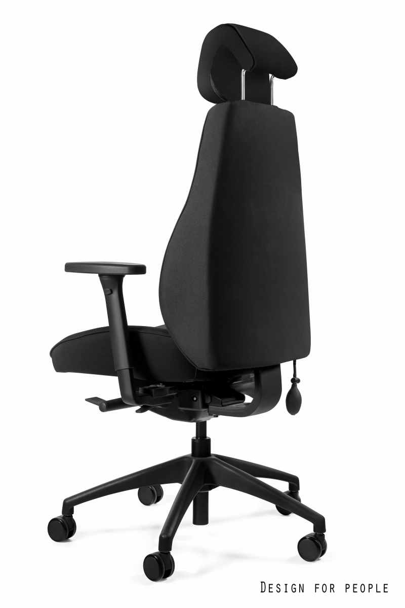 FOTEL OBROTOWY ERGOTHRONE Z PODNÓŻKIEM / CZARNY Dane techniczne: Zagłówek, oparcie i siedzisko tapicerowane wysokiej jakości siatką Mechanizm samoważący SYNCHRON Regulowane podłokietniki góra-dół, przód-tył, wychylenie na boki Regulowana wysokość oparcia i zagłówka Regulowana wysokość oparcia dla kręgów lędźwiowych Podstawa jezdna wykonana z lakierowanego aluminium w kolorze czarnym Fotel wyposażony w wygodny podnóżek (maksymalne obciążenie podnóżka do 45 kg) kolorystyka czarny Wymiary: Obciążenie 130 kg Gwarancja: 3 lata