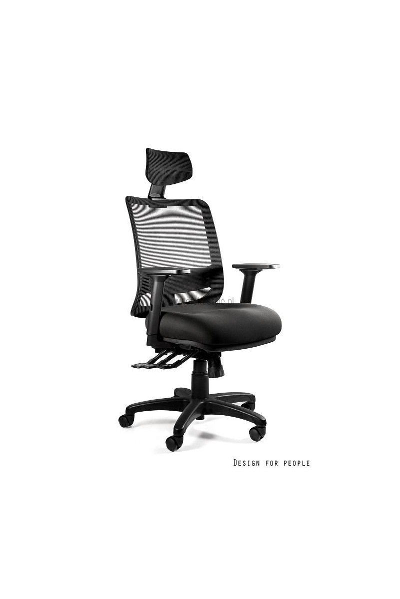 FOTEL OBROTOWY ERGOTHRONE Z PODNÓŻKIEM / CZARNY Dane techniczne: Zagłówek, oparcie i siedzisko tapicerowane wysokiej jakości siatką Mechanizm samoważący SYNCHRON Regulowane podłokietniki góra-dół, przód-tył, wychylenie na boki Regulowana wysokość oparcia i zagłówka Regulowana wysokość oparcia dla kręgów lędźwiowych Podstawa jezdna wykonana z lakierowanego aluminium w kolorze czarnym Fotel wyposażony w wygodny podnóżek (maksymalne obciążenie podnóżka do 45 kg) kolorystyka czarny Wymiary: Obciążenie 130 kg Gwarancja: 3 lata