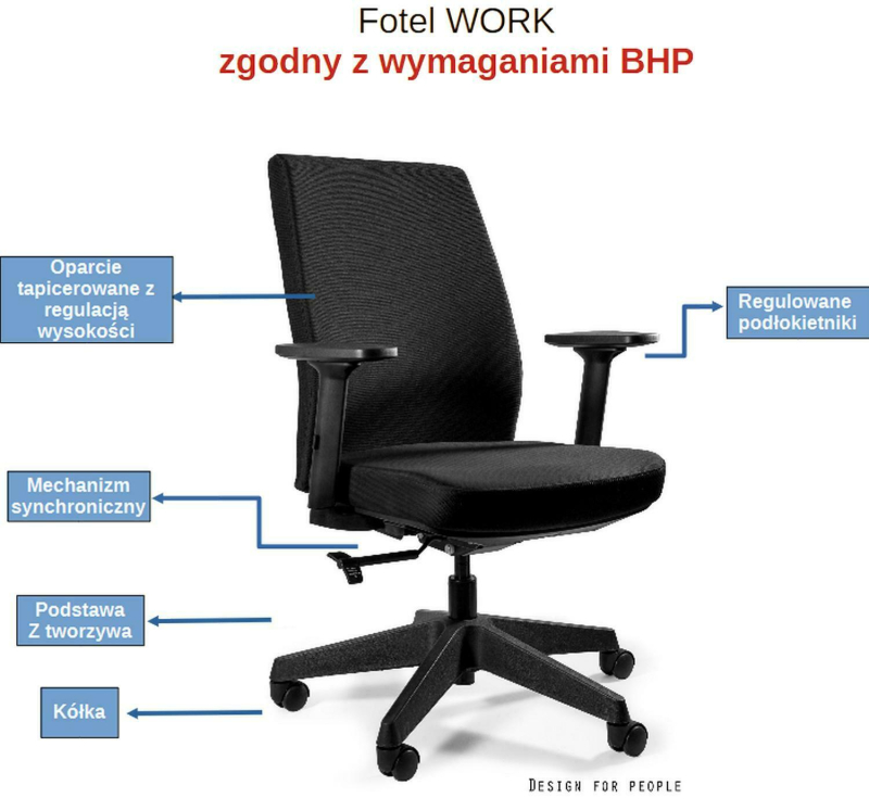 Fotel obrotowy PAREDES czarny - to fotel zgodny z obowiązującymi przepisami i normami BHP Dane techniczne fotela PAREDES kolor czarny: Oparcie Oparcie fotela wykonane: ✅ z przewiewnej siatki ✅ wyprofilowane do naturalnego wygiecia kręgosłupa Podparcie lędźwiowe ✅ regulowany punkt podparcia pleców: góra - dół i na głębokości Siedzisko siedzisko wyprofilowane pod uda tapicerowane tkaniną grubość siedziska 7 cm Mechanizm mechanizm MULTIBLOCK Funkcje mechanizmu: - regulacja wysokości siedziska za pomocą podnośnika pneumatycznego (góra-dół) - regulacja kąta odchylenia oparcia oraz blokada w kilku pozycjach - swobodne obracanie się 360o Podłokietniki ✅ regulowane góra dół nakładki podłokietników o szerokości 8 cm Podstawa pięcioramienna podstawa wykonana z tworzywa, kółka kauczukowe ATEST ✅Gwarancją wytrzymałości fotela jest ATEST badań wytrzymałościowych w zakresie bezpieczeństwa użytkowania Badania przeprowadzono zgodnie z normą: PN-EN 1335-2:2019 PN-EN 1728:2012/AC :2013 PN-EN 1022:2024 Obciążenie - do 130 kg Montaż do samodzielnego montażu Gwarancja 24 miesiące Wymiary wysokość całkowita: 97-107 cm wysokość siedziska: 49 - 59 cm szerokość siedziska: 48 cm