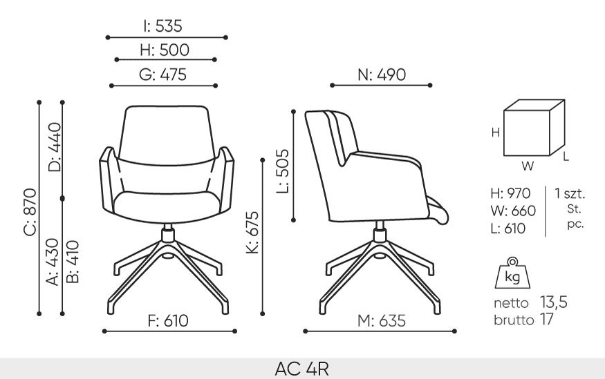 Fotel prokuratorski niski IN Access AC4R obrotowy czarny Ergonomiczny Fotel Prokuratorski In Access AC4R – Nowoczesny Komfort i Profesjonalizm Przedstawiamy ergonomiczny fotel prokuratorski In Access AC4R, który łączy nowoczesny design z najwyższym poziomem komfortu i wsparcia, niezbędnym podczas długotrwałych posiedzeń sądowych. Ten obrotowy fotel z niskim oparciem został zaprojektowany z myślą o zapewnieniu optymalnej postawy i samopoczucia sędziego. Kluczowe Cechy i Korzyści dla Sędziego: Niskie Oparcie Mechanizm obrotowy Komfortowe Podłokietniki Elegancki Krzyżak z Polerowanego Aluminium Tapicerka Wysokiej Jakości: Czarna, trwała tapicerka tekstylna jest nie tylko elegancka, ale również łatwa w utrzymaniu, co jest istotne w przestrzeni publicznej. Ergonomiczny fotel prokuratorski In Access AC4R to idealne połączenie nowoczesnego designu, zaawansowanej ergonomii i wysokiej jakości wykonania. Zainwestuj w komfort i prezencję – wybierz ergonomiczny fotel prokuratorski In Access AC4R. Dane techniczne fotela IN Access AC4R: Oparcie Niskie Oparcie: Zapewnia kompleksowe wsparcie dla całych pleców, Oparcie fotela tapicerowane obustronnie wysokiej jakości tkaniną w kolorze czarnym Siedzisko Ergonomiczne, wyprofilowane pod uda, tapicerowane tkaniną Tkanina Tkanina CHARLES o welurowej powierzchni, charakteryzująca się wysoką odpornością na ścieranie (90 000 cykli Martindale’a). Skład: 100% poliester Waga: 433 g/m2 Szerokość rolki: 140cm Odporność na ścieranie: 90,000 cykli Martindale’a (BS EN ISO 12947-2:1998) Pilling: 4 (EN ISO 12 945-2) Odporność na światło: 5 (ISO 105-B02) Odporność koloru na tarcie: Mokro: 4-5 (UNI EN ISO 105-X12) Sucho: 4-5 (UNI EN ISO 105-X12) Certyfikaty trudnopalności: -DIN EN 1021-1 Kolor czarny : Podłokietniki stałe, zintegrowane z siedziskiem tapicerowane Szerokie, tapicerowane podłokietniki zapewniają stabilne wsparcie dla przedramion, redukując napięcie w barkach i szyi. Mechanizm Mechanizm obrotowy, bez regulacki wysokości Podstawa Krzyżak 4-ramienny: aluminium polerowane (efekt chrom) Stopki na podłogi ceramiczne, betonowe i wykładziny Stopki filcowe na podłogi drewniane i panele - za dodatkową opłatą Gwarancja 24 miesiące Wymiary A: wysokość siedziska: wymiar gabarytowy B: wysokość siedziska: pomiar zgodny z norma PN EN 1335-1 C: regulacja wysokości fotela D: regulacja wysokości oparcia E: regulacja wysokości zagłówka F: szerokość gabarytowa fotela/ ⌀ krzyżaka G: szerokość siedziska H: szerokość oparcia I: szerokość miedzy podłokietnikami K: regulacja wysokości podłokietników L: długość oparcia M: głębokość gabarytowa fotela N: regulacja głębokości siedziska / długość siedziska Wymiary mają charakter orientacyjny i mogą się różnić +/- 3% w zależności od wybranej konfiguracji produktu. Zawsze spełnione są wymogi normy.