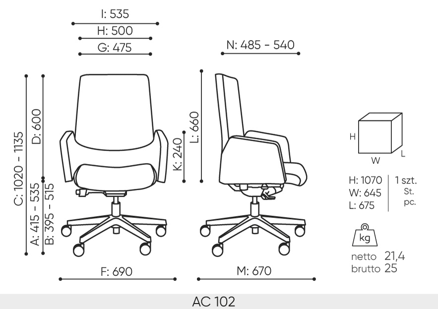 Fotel sędziowski wysoki IN Access AC103 obrotowy Ergonomiczny Fotel Sędziowski In Access AC 103 – Nowoczesny Komfort i Profesjonalizm Przedstawiamy ergonomiczny fotel sędziowski In Access AC 103, który łączy nowoczesny design z najwyższym poziomem komfortu i wsparcia, niezbędnym podczas długotrwałych posiedzeń sądowych. Ten obrotowy fotel z wysokim oparciem i eleganckim zagłówkiem został zaprojektowany z myślą o zapewnieniu optymalnej postawy i samopoczucia sędziego. Kluczowe Cechy i Korzyści dla Sędziego: Wysokie Oparcie z Zagłówkiem: Zapewnia kompleksowe wsparcie dla całych pleców, aż po kark, odciążając kręgosłup i mięśnie, co jest kluczowe podczas wielogodzinnej pracy na sali sądowej. Mechanizm Synchro Samoważący Regulacja Głębokości Siedziska Komfortowe Podłokietniki Elegancka Podstawa z Polerowanego Aluminium Tapicerka Wysokiej Jakości: Czarna, trwała tapicerka tekstylna jest nie tylko elegancka, ale również łatwa w utrzymaniu, co jest istotne w przestrzeni publicznej. Opcjonalne Regulowane Podparcie Lędźwiowe: Za dodatkową opłatą dostępne jest podparcie lędźwiowe z regulacją głębokości, które pozwala sędziemu na indywidualne dopasowanie wsparcia dolnej części pleców, zwiększając komfort i ergonomię. Ergonomiczny fotel sędziowski In Access AC 103 to idealne połączenie nowoczesnego designu, zaawansowanej ergonomii i wysokiej jakości wykonania. Zapewnia sędziemu komfort i wsparcie niezbędne podczas wymagających posiedzeń, jednocześnie podkreślając profesjonalny charakter sali sądowej. Zainwestuj w komfort i prezencję – wybierz ergonomiczny fotel sędziowski In Access AC 103. Dane techniczne fotela IN Access AC 103: Oparcie Wysokie Oparcie z Zagłówkiem: Zapewnia kompleksowe wsparcie dla całych pleców, aż po kark, odciążając kręgosłup i mięśnie, co jest kluczowe podczas wielogodzinnej pracy na sali sądowej. Oparcie fotela tapicerowane obustronnie wysokiej jakości tkaniną w kolorze czarnym Siedzisko Ergonomiczne, wyprofilowane pod uda, tapicerowane tkaniną Tkanina Tkanina CHARLES o welurowej powierzchni, charakteryzująca się wysoką odpornością na ścieranie (90 000 cykli Martindale’a). Skład: 100% poliester Waga: 433 g/m2 Szerokość rolki: 140cm Odporność na ścieranie: 90,000 cykli Martindale’a (BS EN ISO 12947-2:1998) Pilling: 4 (EN ISO 12 945-2) Odporność na światło: 5 (ISO 105-B02) Odporność koloru na tarcie: Mokro: 4-5 (UNI EN ISO 105-X12) Sucho: 4-5 (UNI EN ISO 105-X12) Certyfikaty trudnopalności: -DIN EN 1021-1 Kolor czarny : Zagłówek zintegrowany z oparciem , tapicerowany w kolorze czarnym Podłokietniki stałe, zintegrowane z siedziskiem tapicerowane Szerokie, tapicerowane podłokietniki zapewniają stabilne wsparcie dla przedramion, redukując napięcie w barkach i szyi. Podparcie lędźwiowe do wyboru wg konfiguratora: bez regulacji podparcia z regulacją podparcia lędźwiowego na głębokości (zakres 15 mm) - za dodatkową opłatę Mechanizm Mechanizm Synchro Samoważący: Innowacyjny mechanizm automatycznie dopasowuje opór oparcia do wagi sędziego, umożliwiając płynną zmianę pozycji i dynamiczne siedzenie. Zakres regulacji odchylenia oparcia do 20° i siedziska do 6° pozwala na znalezienie najwygodniejszej pozycji. Regulacja Głębokości Siedziska: Możliwość dostosowania głębokości siedziska w zakresie 60 mm gwarantuje optymalne podparcie ud, niezależnie od wzrostu sędziego. Podstawa Solidna i estetyczna podstawa z polerowanego aluminium nadaje fotelowi prestiżowy wygląd, podkreślając powagę i nowoczesność sali sądowej. Podstawa aluminiowa efekt chrom fi 69 wyposażona w kółka do wyboru: Twarde kółka na miękką powierzchnię Ø 65 z hamulcem Miękkie kółka na twardą powierzchnię Ø 65 z hamulcem - za dodatkową opłatę Wymiary A: wysokość siedziska: wymiar gabarytowy B: wysokość siedziska: pomiar zgodny z norma PN EN 1335-1 C: regulacja wysokości fotela D: regulacja wysokości oparcia E: regulacja wysokości zagłówka F: szerokość gabarytowa fotela/ ⌀ krzyżaka G: szerokość siedziska H: szerokość oparcia I: szerokość miedzy podłokietnikami K: regulacja wysokości podłokietników L: długość oparcia M: głębokość gabarytowa fotela N: regulacja głębokości siedziska / długość siedziska Wymiary mają charakter orientacyjny i mogą się różnić +/- 3% w zależności od wybranej konfiguracji produktu. Zawsze spełnione są wymogi normy.
