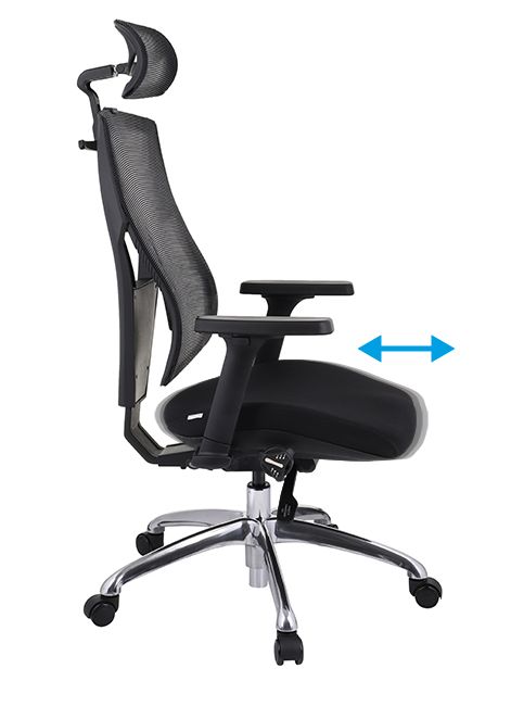 Kolejnym elementem jest regulacja głębokości siedziska (odległości siedziska od oparcia), dzięki której jednym ruchem dźwigni mogą Państwo oddalić lub przybliżyć siedzisko od lub do oparcia.