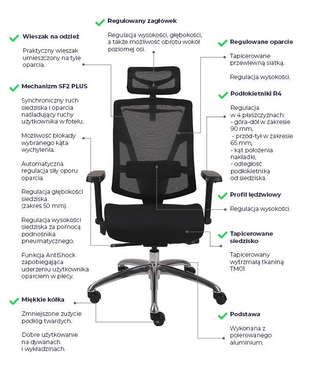 Fotel biurowy obrotowy ErgoNew A1F siedzisko siatkowe z podnóżkiem Fotel biurowy ERGONEW A1F: Ergonomia, komfort, funkcjonalność i styl Fotele biurowe są nieodłącznym elementem wyposażenia każdego miejsca pracy. Wpływają one na nasze samopoczucie, wydajność i zdrowie podczas wielu godzin spędzonych przy biurku. Jeśli szukasz fotela, który zapewni Ci doskonałe wsparcie ergonomiczne, trwałość i estetykę, warto zwrócić uwagę na fotel biurowy obrotowy ERGONEW. Ten nowoczesny model łączy w sobie innowacyjne rozwiązania z wysokiej jakości materiałami, zapewniając niezrównany komfort i wygodę. Główne atuty fotela to: ✅ łatwa i intuicyjna obsługa mechanizmami fotela ✅ regulacja wysokości oparcia z podparciem lędźwiowym ✅ regulacja wysokości, odchyłu realizowana za pomocą przycisków przy siedzisku ✅ regulowany zagłówek 3D ✅ regulowane podłokietniki 3D Ponadto regulacja wysokości, odchyłu i wysuwu siedziska to kluczowe funkcje, które pozwalają dostosować fotel do indywidualnych preferencji użytkownika. W fotelu ERGONEW regulacja ta odbywa się za pomocą przycisków umiejscowionych przy siedzisku, co zapewnia wygodny i intuicyjny sposób dostosowywania pozycji siedzenia. Podsumowując: Fotel biurowy obrotowy ERGONEW to idealne rozwiązanie dla osób, które cenią sobie komfort, ergonomię i wysoką jakość wykonania. Dzięki jego zaawansowanym regulacjom i solidnej konstrukcji, zapewnia on optymalne wsparcie podczas długotrwałego siedzenia przy biurku. Wygodne siedzisko, regulowane podłokietniki, zagłówek i oparcie sprawiają, że praca staje się bardziej komfortowa i efektywna. Fotel ERGONEW to doskonały wybór dla wszystkich, którzy dbają o swoje zdrowie i dobre samopoczucie w miejscu pracy. Dane techniczne fotela biurowego ErgoNew A1F z podnóżkiem Oparcie ✅ wykonane z wytrzymałej siatki, zapewniającej przepływ powietrza, co wpływa na komfort pracy. ✅regulowane na wysokości - regulacja wysokości oparcia umożliwia dostosowanie go do krzywizny kręgosłupa, co pomaga utrzymać prawidłową postawę ciała. Kolor czarny Zagłówek ✅ regulowany zagłówek 3D, który umożliwia dopasowanie wysokości oraz nachylenia zagłówka do indywidualnych potrzeb. Dzięki temu można uzyskać optymalne podparcie dla szyi i głowy, co wpływa na komfort i redukcję napięcia mięśniowego. Podparcie Lędźwiowe Fotel ERGONEW został wyposażony w ✅ wyprofilowanie lędźwiowe z regulacją wysokości, która współpracuje z oparciem. Ta funkcja umożliwia dopasowanie podparcia dla kręgosłupa w okolicach odcinka lędźwiowego, co jest istotne dla zachowania prawidłowej postawy ciała i uniknięcia bólu pleców. Łącznik/rama oparcia Łącznik wykonany jest z aluminium Siedzisko wykonane z tkaniny siatkowej, zapewniającej przepływ powietrza, co wpływa na komfort pracy. Kolor czarny Podnóżek Wysuwany podnóżek Wysuw siedziska Fotel posiada: ✅ funkcję wysuwu siedziska, która umożliwia dostosowanie głębokości siedziska do długości ud. To szczególnie istotne dla osób o różnej wysokości ciała, które chcą uzyskać optymalne podparcie dla ud i zapewnić odpowiednią krążenie krwi. Mechanizm synchroniczny ✅ 4-pozycyjny mechanizm synchro z funkcją "anti-shock" zapewnia płynne przemieszczanie się oparcia bez uderzenia w plecy po zwolnieniu blokady. Możliwość regulacji siły oporu mechanizmu synchro pozwala dostosować fotel do indywidualnych preferencji. Regulacja wysokości i odchyłu odbywa się za pomocą przycisków umiejscowionych przy siedzisku Podłokietniki Regulowane podłokietniki 3D to kolejny atut fotela ERGONEW. ✅ Możliwość regulacji: - góra - dół - przesuw nakładki przód - tył - kąt obrotu nakładki podłokietników pozwala na dostosowanie ich do indywidualnych preferencji i zapewnienie odpowiedniego wsparcia dla ramion i nadgarstków. Miękkie nakładki zapewniają dodatkowy komfort podczas korzystania z fotela przez dłuższy czas. Podnośnik ✅ Podnośnik klasy 4 to gwarancja niezawodności i płynnej regulacji wysokości siedziska. Dzięki tej funkcji można dostosować wysokość siedziska do swojego biurka. Podstawa/kółka Podstawa fotela wykonana z aluminium kółka miękkie fi 60 mm przystosowane do powierzchni twardych Atest Gwarancją jakości fotela jest ✅ ATEST wytrzymałościowy w zakresie bezpieczeństwa użytkowania, zgodność z normami: PN-EN 1335-2:2019-03, PN-EN 1728:2012/AC:2013 PN-EN 1022:2024-04 max obciązenie siedziska - 150 kg Montaż Do samodzielnego montażu , instrukcja dołączona do przesyłki. Gwarancja 24 miesiące Wymiary Wysokość całkowita bez zagłówka 106-115 cm Wysokość położenia siedziska 49 - 58 cm Wysokość oparcia regulowane w zakresie + 5 cm Szerokość siedziska 50 cm Podstawa fi 70 cm UWAGA: Podane wymiary magą różnić się o +/- 1-2 cm. Poniżej przedstawiamy tabele porównawczą foteli biurowych z serii ErgoNew: funkcje/model ErgoNew A1 ErgoNew A1 F ErgoNew S1 ErgoNew S1A ErgoNew S7 ErgoNew S8 Regulacja zagłówka 3D 3D 3D 3D Góra-dół 2D Regulacja podłokietników 3D 3D 3D 3D 3D 3D Regulacja wysokości oparcia tak tak tak tak tak tak Wysuw siedziska tak tak nie tak tak tak Rodzaj podstawy aluminium aluminium nylon aluminium aluminium aluminium Kółka miękkie Tak/60 mm Tak/60 mm Tak/60 mm Tak/65 mm Tak/65 mm Tak/65 mm Łącznik oparcia – wykonanie aluminium aluminium metal metal aluminium aluminium Rama oparcia aluminium aluminium nylon nylon nylon aluminium Korpus podłokietnika metal metal aluminium aluminium Zobacz pozostałe modele z tej serii: