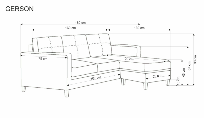 GERSON to nie tylko wygoda, ale także funkcjonalność. Miękkie poduszki zapewniają komfort użytkowania, natomiast solidne nóżki dodają stabilności i stylowego wykończenia. Sofa sprawdzi się doskonale w salonie, pokoju dziennym lub biurze, wprowadzając nowoczesny akcent do każdego pomieszczenia.