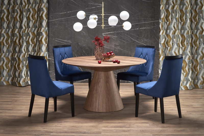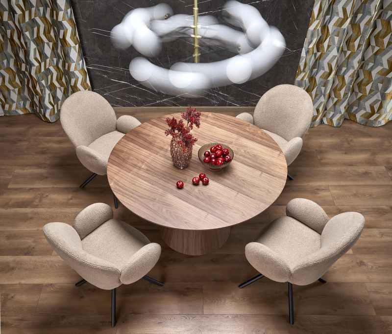 RUPERT stół okrągły, orzechowy Stół okrągły RUPERT to elegancki dodatek, który wprowadzi do Twojego wnętrza ciepło i styl. Z jego okrągłym blatem o średnicy 120 cm oraz wysokości 77 cm, idealnie sprawdzi się w zarówno w jadalni, jak i w kuchni, stając się centrum spotkań z rodziną i przyjaciółmi. Jego ponadczasowy design oraz naturalne materiały sprawiają, że jest nie tylko funkcjonalny, ale także estetycznie przyjemny. Materiał: Wysokiej jakości MDF z okleiną naturalną oraz drewno lite kauczukowe. Obciążenie: max 40 kg Kolor: Blat w ciepłym odcieniu orzechowym, który wprowadza do wnętrza przytulną atmosferę. Styl: Klasyczny z nutą nowoczesności, perfekcyjnie komponujący się z różnorodnymi aranżacjami. Wymiary: Standardowe, zapewniające komfort użytkowania oraz swobodę ruchu wokół stołu. Stół RUPERT nie tylko zachwyca swoim wyglądem, ale także wyróżnia się trwałością i stabilnością. Nogami wykonane z mocnego drewna kauczukowego, oferuje doskonałą stabilność, co pozwala na swobodne korzystanie z niego bez obaw o uszkodzenia. Dodatkowo, jego okrągły kształt sprawia, że każdy znajdzie miejsce przy stole, a brak ostrych krawędzi gwarantuje bezpieczeństwo. Gwarancja producenta: 24 miesiące. Samodzielny montaż: Tak, z przejrzystą instrukcją zawartą w przesyłce. Dostawa: Oferujemy płatną usługę dostawy z wniesieniem. Prosimy o zaznaczenie tej opcji podczas składania zamówienia, aby cieszyć się komfortem bez dodatkowego wysiłku. Koszt usługi zostanie doliczony do zamówienia. wymiar: fi120/77 cm, materiał: MDF + okleina naturalna / drewno lite - kauczukowe, kolor: blat - orzechowy, nogi - orzechowy