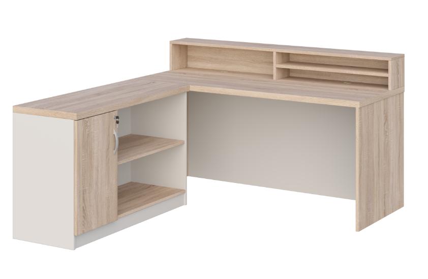 Lada biblioteczna D Lada wykonana z płyty laminowanej 18mm oklejonej obrzeżem PCV 2mm. Wymiary lady: szer. 1650 x głeb. 650 x wys.760 mm, szerokość po rozłożeniu 2100 mm. Po prawej stronie rozsuwany blat na prowadnicach kulkowych, pod blatem przegrody na karty biblioteczne - schowek zamykany na klucz. Pod schowkiem zamykana szafka. Z lewej strony otwarta półka i szafka zamykana na klucz. Szafka może służyć jako miejsca na komputer. Kolorystyka Kolorystyka do wyboru według konfiguracji modelu Kolor wybarwienia płyty meblowej do wyboru. Wyboru dokonujemy w konfiguracji modelu, która znajduje się powyżej. Atesty Biurko posiada certyfikat dopuszczający do użytkownia w jednostkach oświatowych (certyfikat COBRABID). Terminy Towar na zamówienie. Produkcja około 3-6 tygodni. Gwarancja 24 miesiące