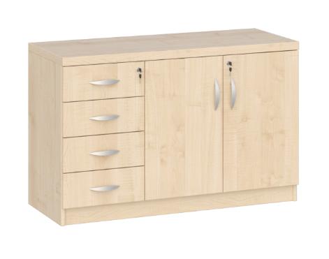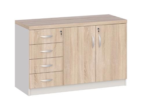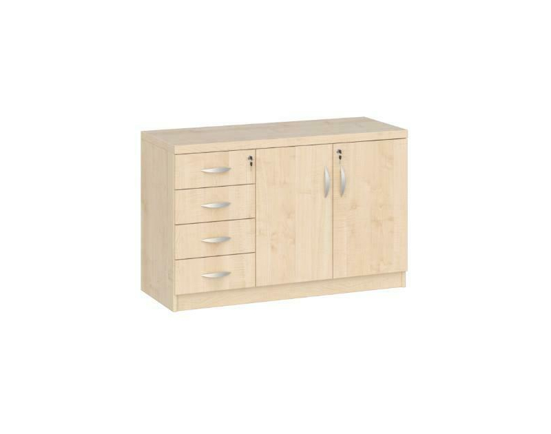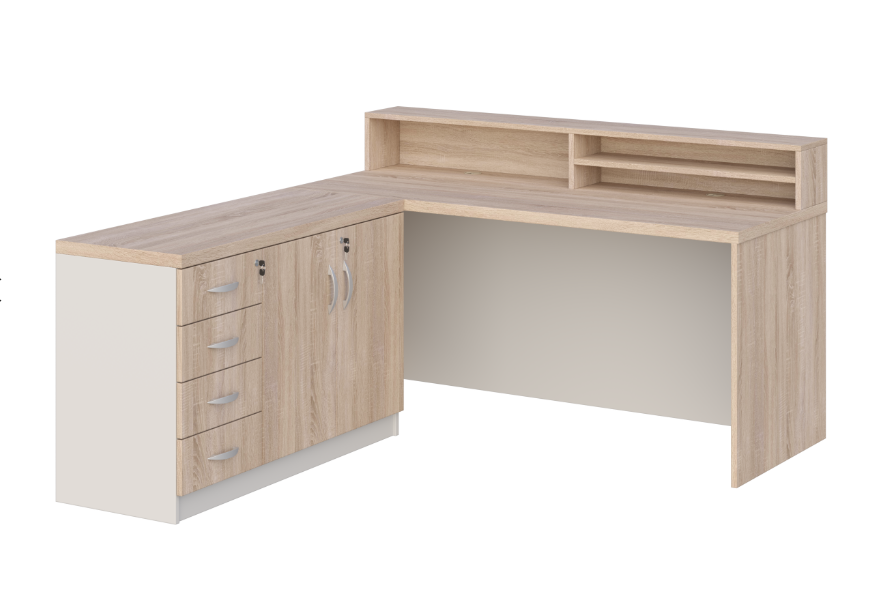 Kontener do lady z szufladą i szafką, typ D Dane techniczne Wykonany z płyty laminowanej 18mm, obrzeże oklejone PCV. Wymiary (WxSxG) 560x400x500 mm. Górna szuflada i szafka zamykane na zamek. Do zestawu można dokupić lady recepcyjne z kolekcji PREMIO - wszystkie meble będą wykonane w tej samej kolorystyce i będą stanowiły całość wyposażenia biura. Kolorystyka płyty meblowej do wyboru. Wyboru dokonujemy w konfiguracji modelu, która znajduje się powyżej. Certyfikat Regał posiada certyfikat dopuszczający do użytkownia w jednostkach oświatowych (certyfikat COBRABID). Terminy Towar na zamówienie. Produkcja około 4-6 tygodni. Gwarancja 24 miesiące