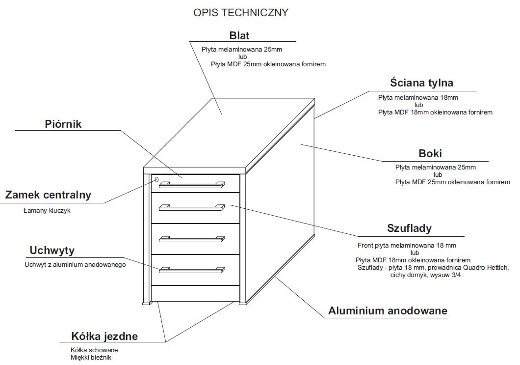 DANE TECHNICZNE: | - Blaty gr. 25mm - płyta melaminowana, pod blatem listwa z anodowanego aluminium 4mm; - Zewnętrzne części korpusu z płyty melaminowanej o grubości 25mm; - tylna ściana pełna z płyty melaminowanej o gr. 18mm; - Szuflady z płyty melaminowanej gr. 18 mm, prowadnice Quadro Hettich z cichym domykiem - wysuw 3/4; - Górna szuflada z piórnikiem; - Zamek centralny, piórnik zamykany; - Kółka z miękkim bieżnikiem | |