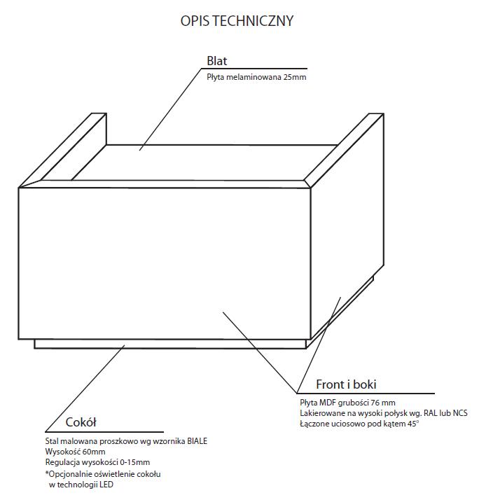 LADA RECEPCYJNA VICTOR V-044 OPIS Wymiary: 1600X800X750H Rysunek techniczny: Warstwa górna blatu gr. 25mm - płyta melaminowana, ABS 2mm; Podstawa (nogi) - płyta melaminowana o grubości 25mm pionowe krawędzie, ABS 1mm; Blenda - płyta melaminowana 18mm; Cokół z maty aluminiowej o wysokości 10cm; Stopki - regulacja wysokości 0-15mm, stopki chromowane. KOLORYSTYKA: kolorystyka wykonania według konfiguracji modelu Inne elementy systemu lad recepcyjnych VICTOR Uwaga! Litera B przy symbolu mebla oznacza bonowanie lad i nadstawek Litera M - blacha perforowana - dotyczy nadstawki BLENDA BLACHA PERFOROWANA: Blacha perforowana 1.2 mm malowana proszkowo (testurizate) - aluminium, grafit lub czarny; Standardowy wzór perforacji - "PROSTOKĄT"; opcjonalnie "kwadrat", "fasolka" lub "paski"; ELEMENTY SYSTEMU: nazwa Wymiar Rysunek techniczny symbol LADA PROSTA 800X800X750H V 040 lub V 040B 1000X800X750H V 041 lub V 041B 1200X800X750H V 042 lub V 042B 1400X800X75H V 043 lub V 043B 1600X800X750H V 044 lub V 044B 1800X800X750H V 045 lub V 045B LADA ŁUKOWA 1600X900X750H V 046 lub V 046B 1000X1000X750H V 047 lub V 047B 1600X900X750H V 048 lub V 048B NADSTAWKA PROSTA 800X350X350H V 060 lub V 060B lub V 060M 1000X350X350H V 061 lub V 061B lub V 061M 1200X350X350H V 062 lub V 062B lub V 062M 1400X350X350H V 063 lub V 063B lub V 063M 1600X350X350H V 064 lub V 064B lub V 064M 1800X350X350H V 065 lub V 065B lub V 065M NADSTAWKA ŁUKOWA 1600X500X350H V 066 lub V 066B lub V 066M 1000X1000X350H V 067 lub V 067B lub V 067M 1300X500X350H V 088 lub V 088B lub V 088M Terminy Towar na zamówienie. Produkcja 3-4 tygodnie
