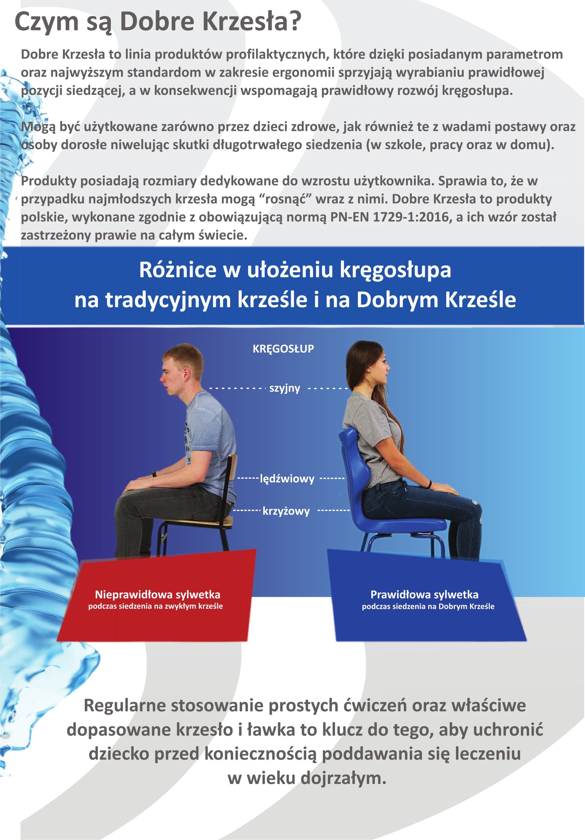 Krzesło szkolne Spider soft nr 1 Dobre krzesło Entelo Krzesła w rozmiarach od 1- 4 wymagają biurek (stolików) o odpowiedniej wysokości blatu. Krzesło szkolne profilowane przeznaczone dla dzieci i młodzieży. Oferowane przez naszą firmę krzesło ucznia jest specjalnie przygotowaną ofertą w porozumieniu z ze specjalistami w zakresie postawy dziecka, tak aby było krzesłem ergonomicznym i idealnie dopasowanym do sylwetki "młodego kręgosłupa". Dobre krzesło to produkt profilaktyczny, który poprzez wyprofilowanie lordozy lędźwiowej wymusza obciążenie guzów kulszowych. Prawidłowe ustawienie miednicy jest podstawą do prawidłowego ustawienia górnych segmentów kręgosłupa. Jest ono odpowiedzią na poszerzającą się w szybkim tempie grupę dzieci i młodzieży z wadami postawy, które wpływają na stan zdrowia i sprawność fizyczną młodego pokolenia. Kubełek Krzesło wyprodukowane w technologii rozdmuchu, umożliwiającej powstanie tzw. płaszcza termicznego. Kubełek: wykonany z tworzywa (polietylen wysokociśnieninowy). Model posiada miękkie tapicerowane siedzisko w kolorze czarnym. Z tyłu siedziska umieszczono uchwyt do szybkiego przenoszenia krzesła. Kolorystyka kubełka do wyboru w "Konfiguratorze Modelu". Dostępne kolory: Dostępne 4 nowe kolory kubełków: Stelaż Pająk. Malowany proszkowo na kolor szary. Stelaż o średnicy 22 mm. Stopki antypoślizgowe: -białe (tworzywo sztuczne). Wymiary Rozmiar nr 1: Wzrost dziecka: 93 cm - 116 cm Wysokość siedziska: 26 cm Głębokość siedziska: 26 cm Szerokość siedziska: 29 cm Wysokość oparcia: 30 cm Terminy Towar na zamówienie. Czas produkcji do 8 tygodni. Gwarancja Gwarancja 24-miesięczna. Kolekcja Spider posiada certyfikat potwierdzający zgodność z normą PN-EN 1729-1:2016-02, PN-EN 1729-2+A1:2016-02. Krzesło posiada Atest Higieniczny. 10 różnic pomiędzy Dobrym Krzesłem, a tradycyjnym produktem: 1. Wklęsło-wypukła forma krzesła – rozwiązanie wspomaga prawidłowe ułożenie kręgosłupa. 2. Optymalne krzywizny oparcia (kąt zgodny z normą PN-EN 1729 -1:2007) - mobilizują pracę mięśni przykręgosłupowych, wzmacniając kręgosłup. 3. Odpowiednio wyprofilowane siedzisko – wykonanie zgodnie z zasadami ergonomii zapewnia użytkownikowi maksimum komfortu, stymuluje tułów do prawidłowego ułożenia. 4. Struktura krzesła - zmniejsza odbicia sztucznego oświetlenia. 5. Komfort termiczny – innowacyjna technologia wytwarzania umożliwia powstanie płaszcza termicznego pomiędzy dwoma płaszczyznami krzesła, zapewniając komfort dla pleców i pośladków. 6. Elastyczność (która powoduje „dynamiczny” siad – wymóg współczesnej ergonomii) oraz brak ostrych krawędzi. 7. Łatwość utrzymania siedziska w czystości - jego powierzchnia nie elektryzuje się. 8. Duża wytrzymałość - osiągnięta dzięki unikalnej technologii wytwarzania - zapewnia wielokrotnie dłuższy czas użytkowania. 9. Wysoka stabilność – uzyskana z połączenia doświadczeń specjalistów z zakresu ergonomii i rehabilitacji ruchowej. 10. Przyjazne środowisku - w pełni nadaje się do ponownego przetworzenia – tradycyjne krzesła nie nadają się do recyklingu. Ergonomia krzesła dla ucznia: zapoznaj się klikając na poniższe zdjęcie