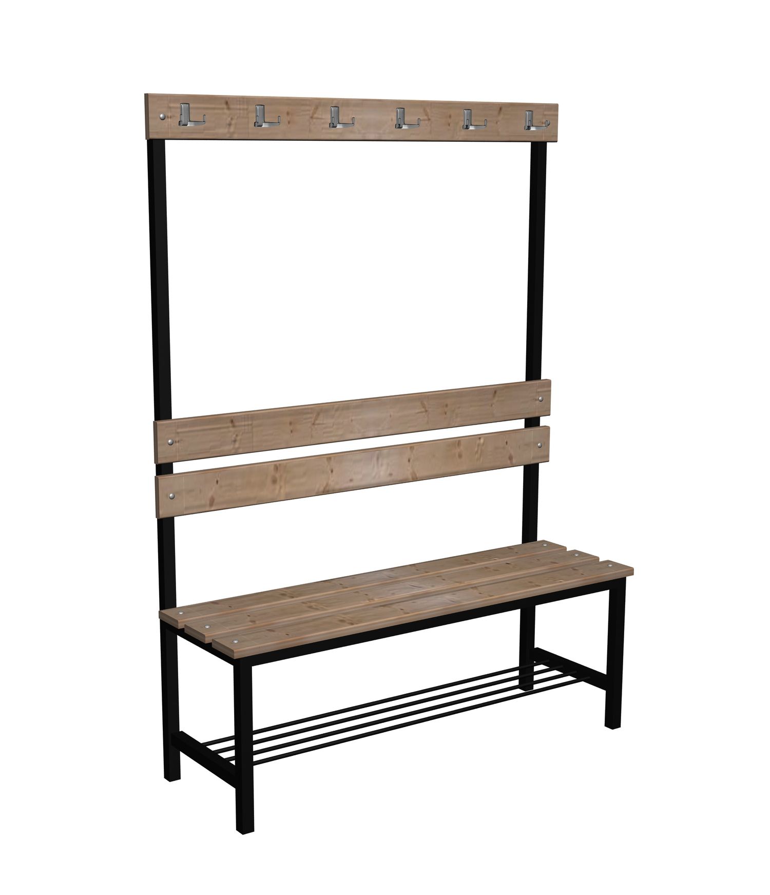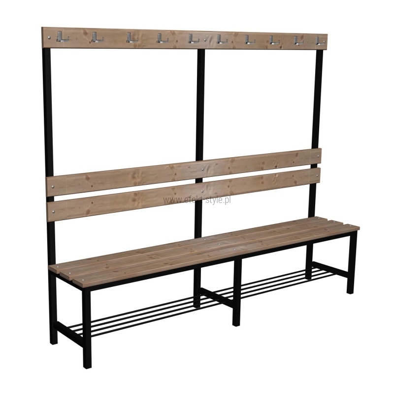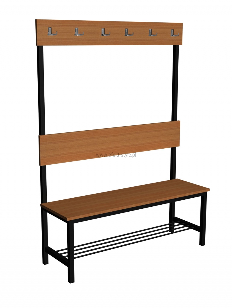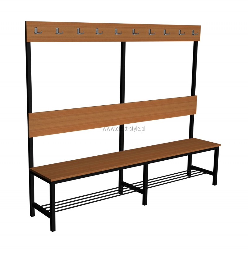 Ławka korytarzowa Premium 2-str. z oparciem, wieszakiem i półką Opis Bardzo mocna i wytrzymała ławka do szatni, na korytarze i do poczekalni. Dzięki zastosowaniu wporników pod siedziskiem z profila 30x30 znacznie zwiększona wytrzymałość ławki. Siedzisko do wyboru: Płyta laminowana o grubości 18 mm i szerokości 370 mm. Deski sosnowe o grubości 20 mm i szerokości 100 mm, potrójnie lakierowane. Mocowanie desek na mocne śruby zamkowe. Szerokość ławki 370 mm. Dostępna w długościach: 1 m i 1,2 m, 1,5 m, 1,8 m, 2,0 m. Stelaż Wykonany z profila 30x30x1,5 mm. Półka na buty z pręta fi 8 mm Na końcach nóg plastikowe zatyczki. Kolor stelaża do wyboru. Wyboru dokonujemy w konfiguracji modelu, która znajduje się powyżej. Kolorystyka Kolorystyka do wyboru według konfiguracji modelu Kolor płyty do wyboru. Wyboru dokonujemy w konfiguracji modelu, która znajduje się powyżej. Atesty Ławka posiada certyfikat dopuszczający do użytkownia w jednostkach oświatowych (certyfikat COBRABID). Terminy Towar na zamówienie. Produkcja około 3-6 tygodni. Gwarnacja 24 miesiące