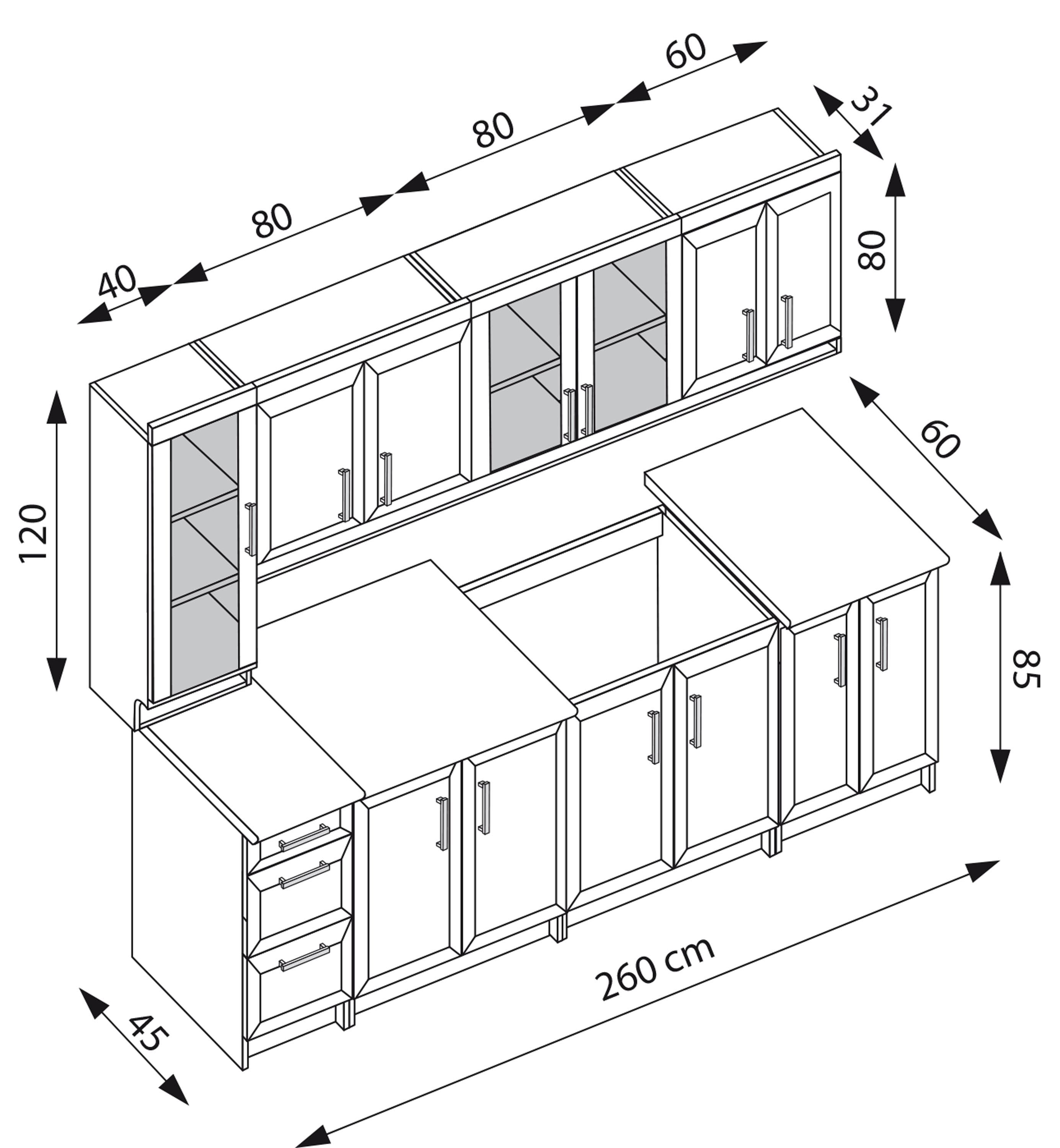 Zestaw mebli kuchennych MARGARET 3 260-ORZECHZestaw mebli kuchennych MARGARET 3 o długości 260 cm to propozycja, która łączy klasyczną elegancję z funkcjonalnością. Wykończenie w ciepłym odcieniu orzecha nadaje wnętrzu przytulny i ponadczasowy charakter, a precyzyjnie wykonane detale dodają meblom wyjątkowego uroku. Fronty szafek wykonano z wytrzymałej płyty MDF, co gwarantuje ich trwałość i odporność na codzienne użytkowanie. Górne szafki z przeszkleniami dodają zestawowi lekkości i pozwalają na ekspozycję ulubionej zastawy. Całość dopełniają blaty o grubości 28 mm w jednolitym kolorze orzecha, co tworzy spójną i harmonijną kompozycję. Zestaw MARGARET 3 to idealne rozwiązanie dla osób, które cenią sobie klasyczny design i chcą stworzyć w swojej kuchni ciepłą, rodzinną atmosferę. Skład zestawu:Szafki dolne: