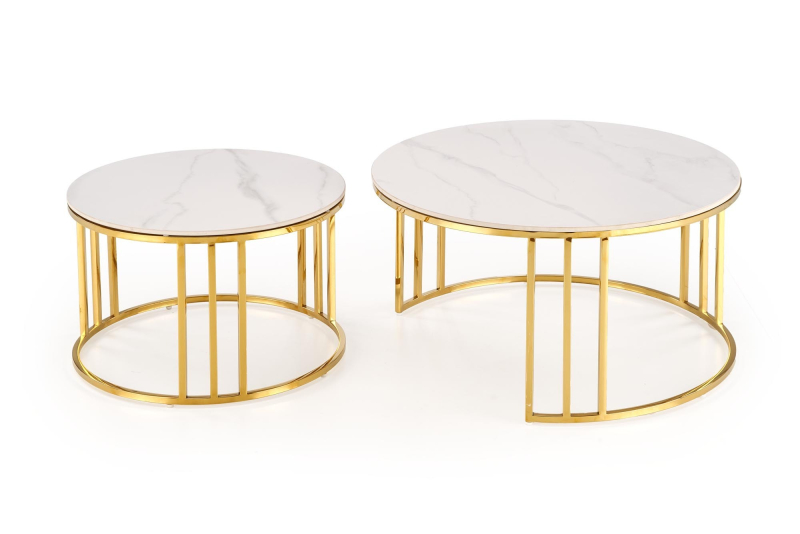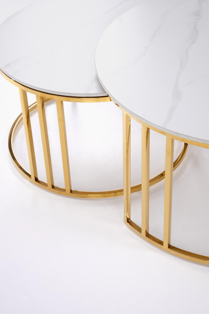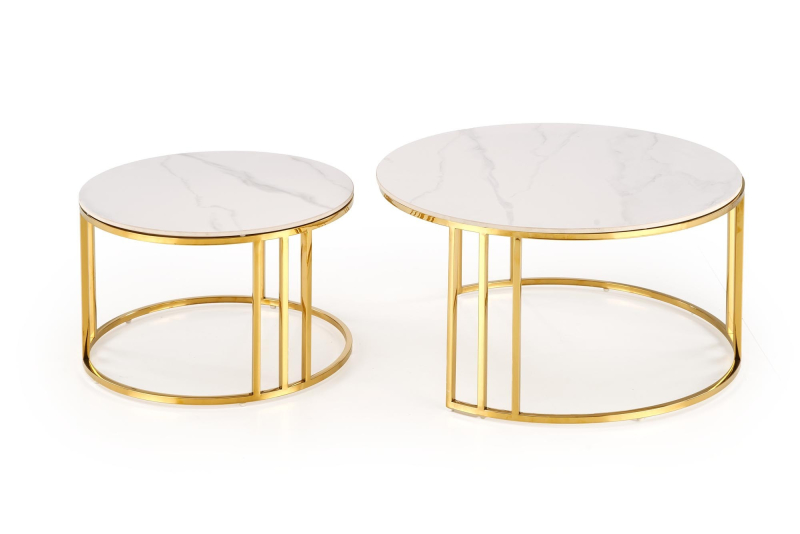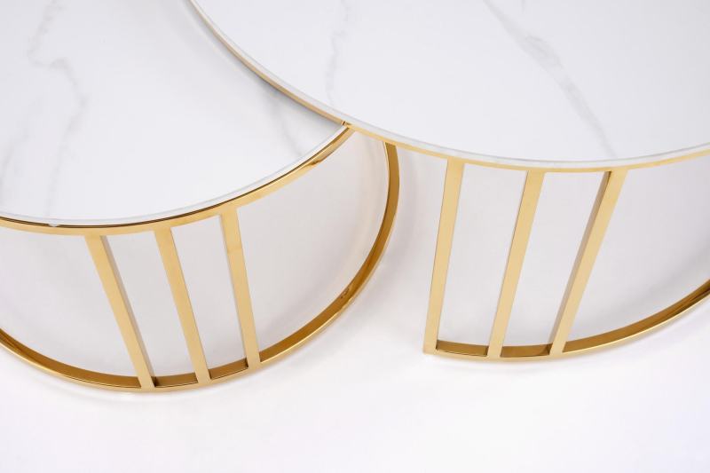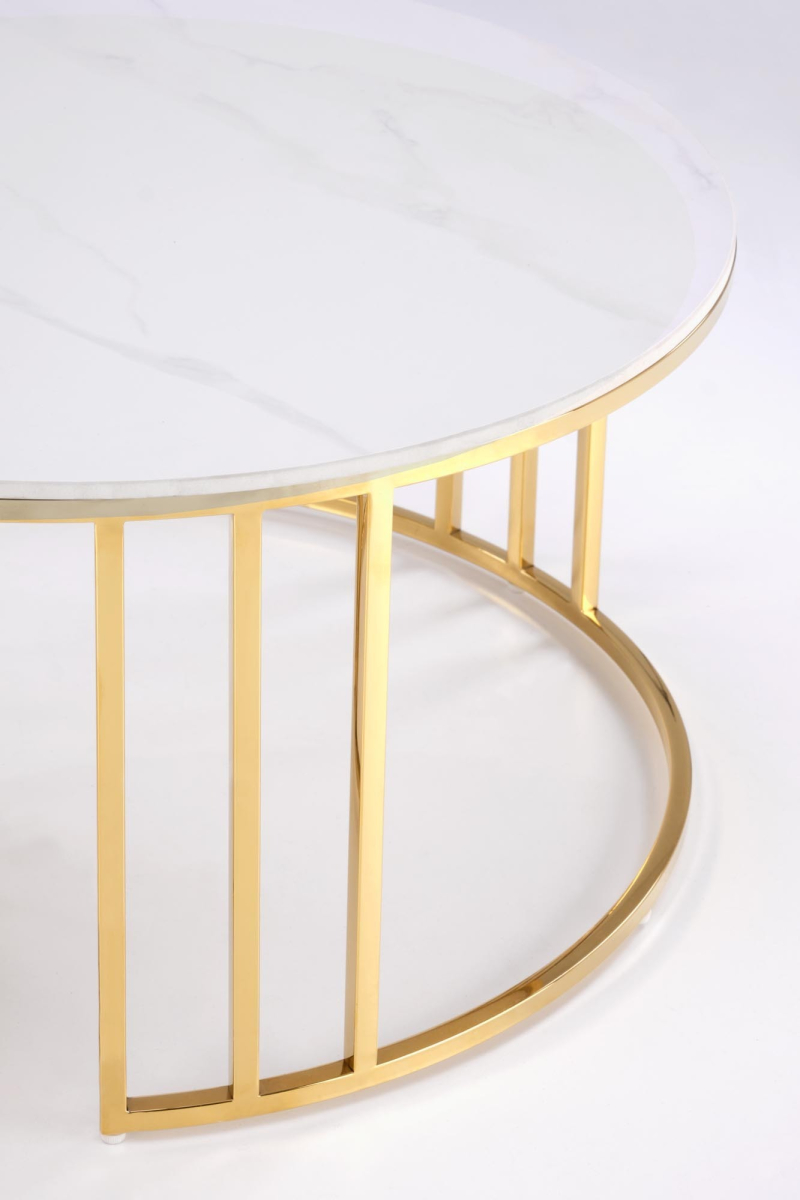 HARISSA_G ława stelaż - złoty, blat - biały marmur Ława - stolik HARISSA_G to elegancki mebel, który doskonale wkomponuje się w nowoczesne wnętrza, łącząc funkcjonalność z wyrafinowanym stylem. Jego zachwycający design i wysokiej jakości materiały sprawiają, że będzie idealnym uzupełnieniem każdego pomieszczenia, zarówno w salonie, jak i na tarasie. Wymiary: Średnica 42 cm, wysokość 41 cm - idealne do niewielkich przestrzeni. Materiał: Blat wykonany z MDF okleinowanego, co gwarantuje trwałość, a jednocześnie nadaje elegancki wygląd. Wykończenie: Blat w odcieniu białego marmuru z subtelnymi, szarymi żyłkami, które wprowadzą odrobinę luksusu do Twojego wnętrza. Stelaż: Złoty, malowany proszkowo - nadaje nowoczesny i stylowy charakter, jednocześnie zapewniając stabilność. Styl: Industrialny lub skandynawski - doskonale komponuje się z różnymi aranżacjami. Mebel jest nie tylko estetyczny, ale również praktyczny. Dzięki lekkiej konstrukcji łatwo go przemieszczać, co umożliwia swobodne dostosowanie aranżacji do własnych potrzeb. HARISSA_G świetnie nadaje się jako stolik kawowy, a także jako miejsce na drobne dekoracje czy napoje. Jego unikalny design przyciągnie wzrok każdego gościa! Gwarancja producenta: 24 miesiące. Samodzielny montaż: Mebel wymaga prostego montażu, instrukcja zawarta w przesyłce. wymiary: fi 42/41 cm, materiał: MDF okleinowany / stal malowana proszkowo, kolory: stelaż - złoty, blat - biały marmur