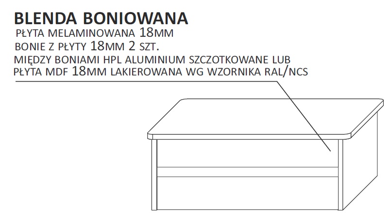 NADSTAWKA NA LADĘ RECEPCYJNĄ VICTOR V-066m OPIS Wymiary do wyboru: -1600X500X350H -1600X500X460H Rysunek techniczny: Warstwa górna blatu gr. 25mm - płyta melaminowana; Podstawa (nogi) - płyta melaminowana o grubości 18mm pionowe krawędzie; Blenda - metalowa blacha perforowana 1,2mm, malowana proszkowo. KOLORYSTYKA: kolorystyka wykonania według konfiguracji modelu Inne elementy systemu lad recepcyjnych VICTOR Uwaga! Litera B przy symbolu mebla oznacza bonowanie lad i nadstawek Litera M - blacha perforowana - dotyczy nadstawki BLENDA BLACHA PERFOROWANA: Blacha perforowana 1.2 mm malowana proszkowo (testurizate) - aluminium, grafit lub czarny; Standardowy wzór perforacji - "PROSTOKĄT"; opcjonalnie "kwadrat", "fasolka" lub "paski"; ELEMENTY SYSTEMU: nazwa Wymiar Rysunek techniczny symbol LADA PROSTA 800X800X750H V 040 lub V 040B 1000X800X750H V 041 lub V 041B 1200X800X750H V 042 lub V 042B 1400X800X75H V 043 lub V 043B 1600X800X750H V 044 lub V 044B 1800X800X750H V 045 lub V 045B LADA ŁUKOWA 1600X900X750H V 046 lub V 046B 1000X1000X750H V 047 lub V 047B 1600X900X750H V 048 lub V 048B NADSTAWKA PROSTA 800X350X350H V 060 lub V 060B lub V 060M 1000X350X350H V 061 lub V 061B lub V 061M 1200X350X350H V 062 lub V 062B lub V 062M 1400X350X350H V 063 lub V 063B lub V 063M 1600X350X350H V 064 lub V 064B lub V 064M 1800X350X350H V 065 lub V 065B lub V 065M NADSTAWKA ŁUKOWA 1600X500X350H V 066 lub V 066B lub V 066M 1000X1000X350H V 067 lub V 067B lub V 067M 1300X500X350H V 088 lub V 088B lub V 088M Terminy Towar na zamówienie. Produkcja 3-4 tygodnie