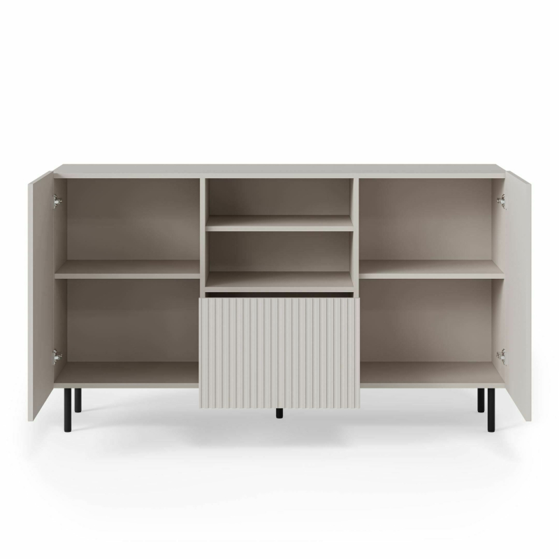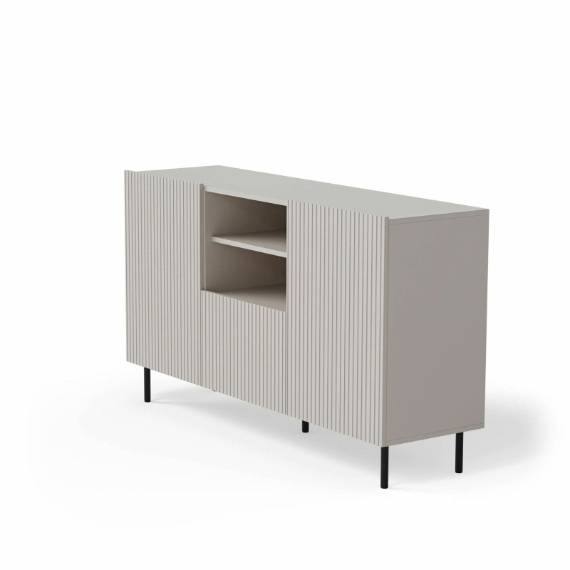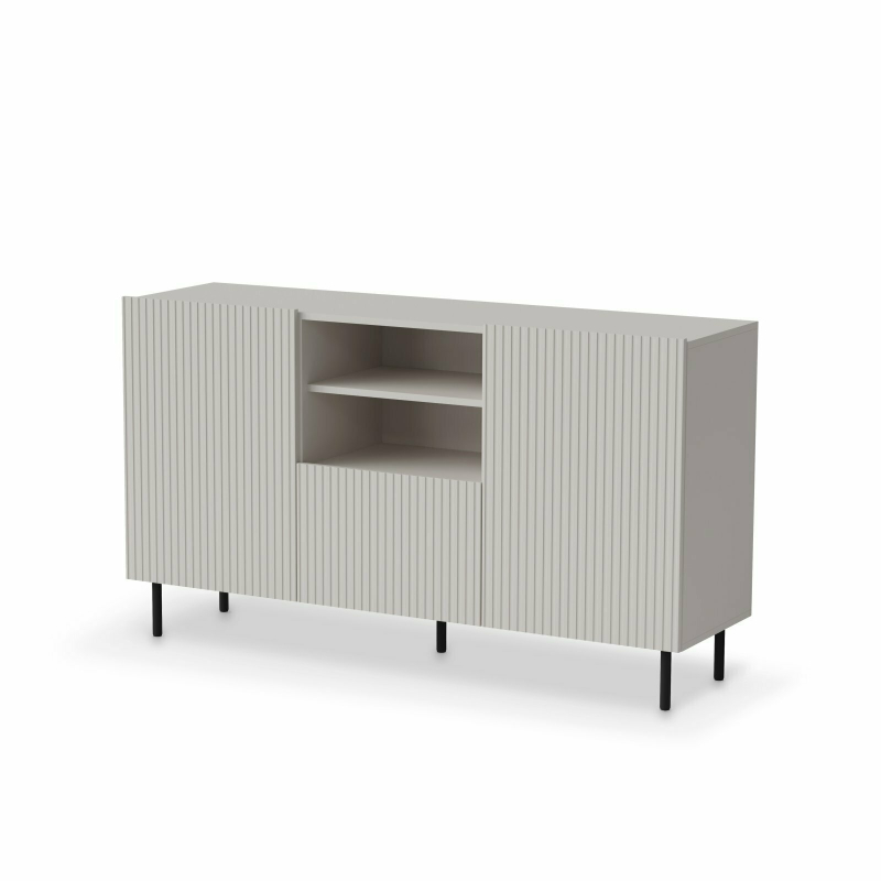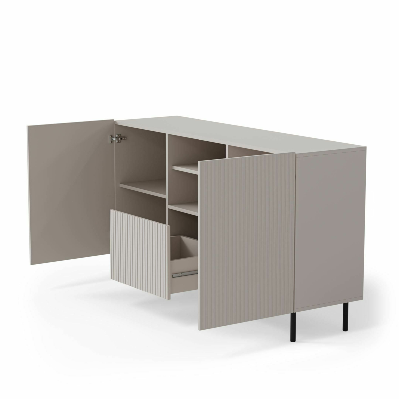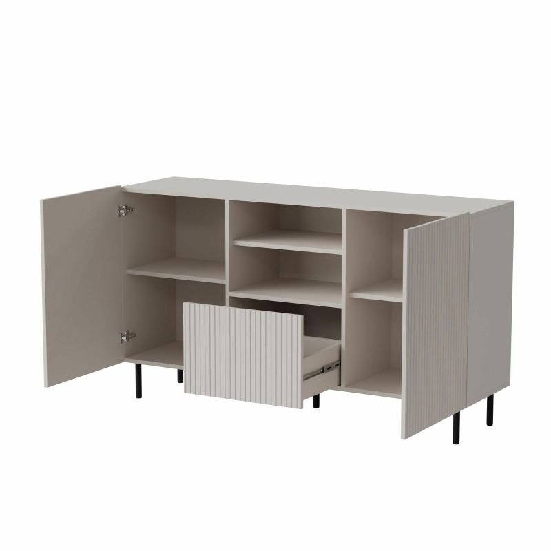Odkryj Komodę PAXOS KM-1 – eleganckie i funkcjonalne rozwiązanie do Twojego wnętrza! Ta stylowa komoda o wymiarach 150 x 40 x 84 cm (szerokość x głębokość x wysokość) łączy w sobie nowoczesny design i praktyczną pojemność. Wykonana z wysokiej jakości płyty meblowej laminowanej, MDF foliowanego oraz stali malowanej proszkowo, komoda PAXOS KM-1 charakteryzuje się trwałością i solidnością. Jej wyrafinowana kolorystyka kaszmiru w połączeniu z czarnymi detalami nadaje jej nowoczesny i stylowy wygląd. Komoda oferuje dwie zamykane szafki boczne z wewnętrznymi półkami oraz centralną część z wysuwaną szufladą o ryflowanym froncie, co zapewnia różnorodne możliwości przechowywania. Smukłe, czarne metalowe nóżki podkreślają lekkość konstrukcji i dodają jej nowoczesnego charakteru. Parametry produktu: