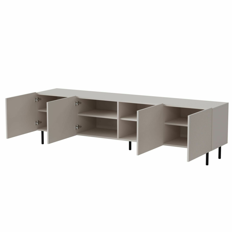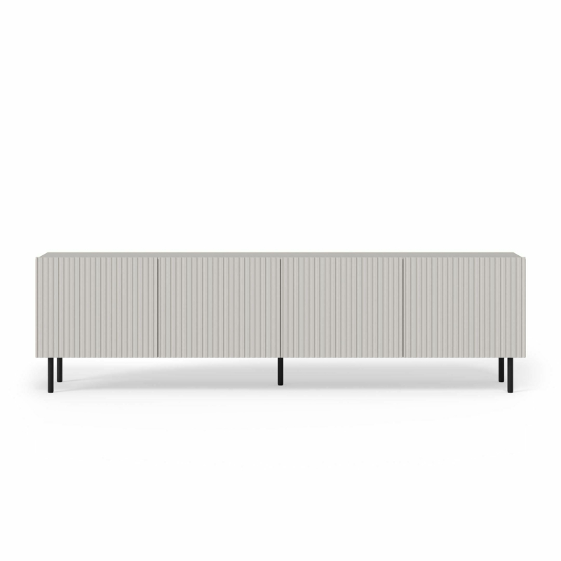Elegancka i przestronna Szafka RTV PAXOS RTV-2 to idealne centrum rozrywki dla Twojego salonu. Jej imponujące wymiary 200 x 40 x 54 cm (szerokość x głębokość x wysokość) zapewniają mnóstwo miejsca na sprzęt multimedialny oraz różnorodne przedmioty. Wykonana z wysokiej jakości płyty meblowej laminowanej, eleganckiego MDF foliowanego oraz stabilnej stali malowanej proszkowo, szafka RTV PAXOS RTV-2 łączy w sobie trwałość i nowoczesny design. Wyrafinowane połączenie koloru kaszmir z czarnymi detalami nóżek nadaje jej stylowy i uniwersalny charakter, który doskonale wkomponuje się w nowoczesne aranżacje wnętrz. Szafka RTV oferuje cztery zamykane szafki z wewnętrznymi półkami, zapewniając dużą przestrzeń do przechowywania akcesoriów, płyt, kabli czy innych przedmiotów. Wszystkie cztery fronty szafek są ryflowane, dodając meblowi spójnego, unikalnego i nowoczesnego akcentu. Całość wsparta jest na smukłych, czarnych metalowych nóżkach, które podkreślają lekkość konstrukcji i ułatwiają utrzymanie czystości pod meblem. Parametry produktu: