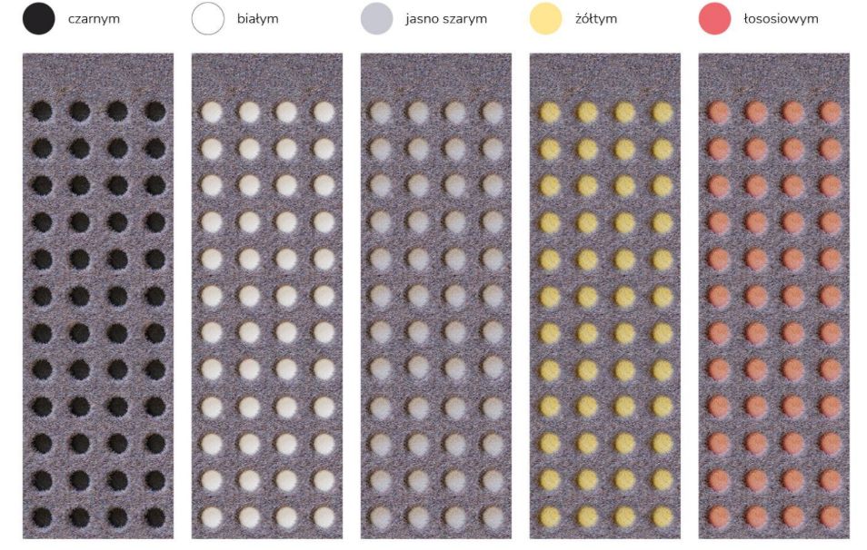 Wnętrze paneli, widoczne przez dziurki w powierzchni, dostępne jest w 5 kolorach do wyboru.