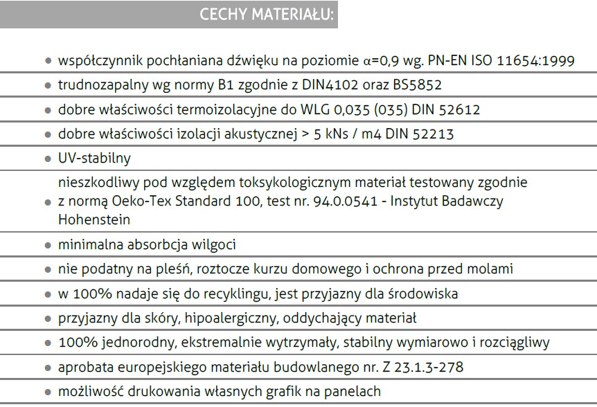 PANEL: Panel wykonany z materiału akustycznego o grubości 20mm o współczynniku α=0,9 wg. PN-EN ISO 11654:1999. Użyte materiały podlegają w 100% recyklingowi. ✅ Współczynnik pochłaniana dźwięku na poziomie α=0,9 wg. PN-EN ISO 11654:1999 ✅ Trudnozapalny wg normy B1 zgodnie z DIN4102 oraz BS5852 ✅ Dobre właściwości termoizolacyjne do WLG 0,035 (035) DIN 52612 ✅ Dobre właściwości izolacji akustycznej > 5 kNs / m4 DIN 52213 ✅ UV-stabilny ✅ Nieszkodliwy pod względem toksykologicznym materiał testowany zgodnie z normą Oeko-Tex Standard 100, test nr. 94.0.0541 - Instytut Badawczy Hohenstein ✅ Minimalna absorbcja wilgoci ✅ Bezpieczne przed pleśnią oraz roztoczami kurzu domowego, ochrona przed molami ✅ W 100% nadaje się do recyklingu, jest przyjazny dla środowiska ✅ Przyjazny dla skóry, hipoalergiczny, oddychający materiał ✅ 100% jednorodny, ekstremalnie wytrzymały, stabilny wymiarowo i rozciągliwy ✅ Aprobata europejskiego materiału budowlanego nr. Z 23.1.3-278 ✅ Możliwość drukowania własnych grafik na panelach | |
