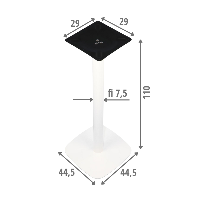 Podstawa do stolika SH-3050-2/W wysokość 72 cm, 44,5x44,5 cm - kolor biały PODSTAWOWE CECHY element dolny o wymiarach 44,5x44,5 cm element dolny wykonany z blachy o gr. 7 mm, malowanej proszkowo noga o średnicy 75 mm wykonana ze stali malowanej proszkowo, grubość ścianki 1,2 mm element górny wykonany z blachy tłoczonej 29x29 cm o gr. 3 mm element górny wyposażony w 8 otworów montażowych o średnicy 5 mm regulowane stopki podstawa skręcana, dostarczana w elementach do samodzielnego montażu gwarancja 24 miesiące Wymiary: