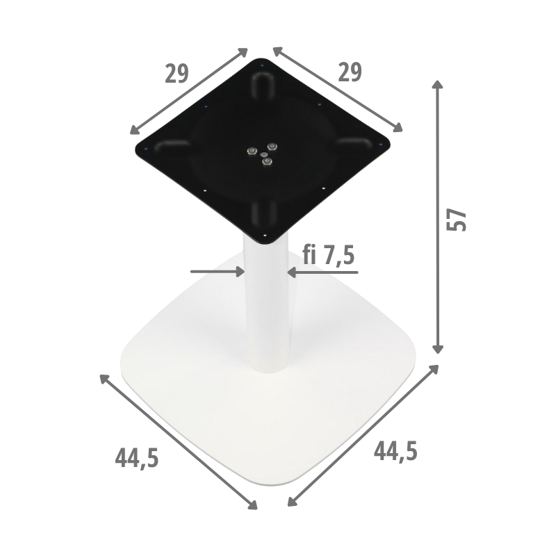 Podstawa do stolika SH-3050-2/W wysokość 72 cm, 44,5x44,5 cm - kolor biały PODSTAWOWE CECHY element dolny o wymiarach 44,5x44,5 cm element dolny wykonany z blachy o gr. 7 mm, malowanej proszkowo noga o średnicy 75 mm wykonana ze stali malowanej proszkowo, grubość ścianki 1,2 mm element górny wykonany z blachy tłoczonej 29x29 cm o gr. 3 mm element górny wyposażony w 8 otworów montażowych o średnicy 5 mm regulowane stopki podstawa skręcana, dostarczana w elementach do samodzielnego montażu gwarancja 24 miesiące Wymiary:
