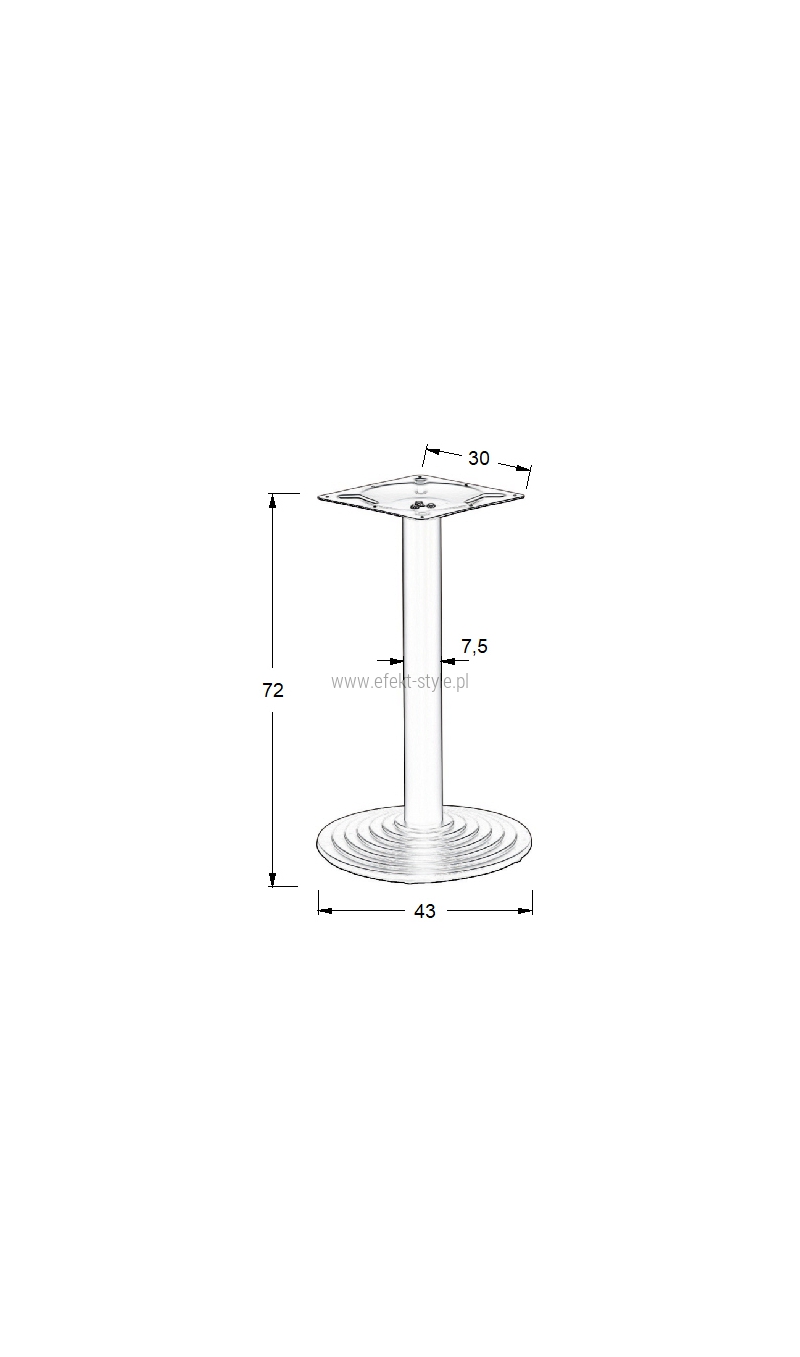 Podstawa do stolika EF-SH-5001-5/L/B - czarna - wysokość 57,5 cm fi 45 cm Wykonanie wysokość 57,5 cm element dolny o średnicy 45 cm element dolny wykonany z blachy o gr. 7 mm, malowanej proszkowo noga o średnicy 75 mm wykonana ze stali malowanej proszkowo, grubość ścianki 1,2 mm element górny wykonany z blachy tłoczonej 30x30 cm o gr. 3 mm element górny wyposażony w 8 otworów montażowych o średnicy 5 mm regulowane stopki podstawa skręcana, dostarczana w elementach waga: 11,5 kg Kolor -czarny; Uwagi Podstawa do stolika, cena nie obejmuje blatu. Gwarancja 24-miesięczna. System od "drzwi do drzwi" dla Państwa pełnego komfortu. System "door to door" - z ang - od drzwi do drzwi Termin "door to door" wg WIKIPEDII: " sposób realizacji naprawy urządzenia, który polega na przesłaniu pocztą kurierską uszkodzonego sprzętu do serwisu (na koszt serwisu). Naprawione urządzenie wraca następnie przesyłką kurierską do właściciela także na koszt serwisu"